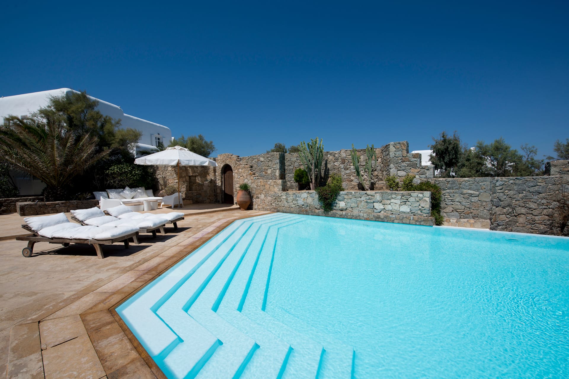In harmony with the traditional architecture of Mykonos island and enjoying one of the most panoramic locations, the property stands as a tribute to traditional design and appreciation of space. Villa Arcadia expands in 2 levels comprising of an open space living room, dining room, fully equipped kitchen and 6 bedrooms in the Main Villa and the Guest House. In the exterior there are shaded lounge and dining areas with BBQ while the comfortable sunbathing beds around the large private swimming pool, offer the perfect scenery to enjoy the day in privacy.