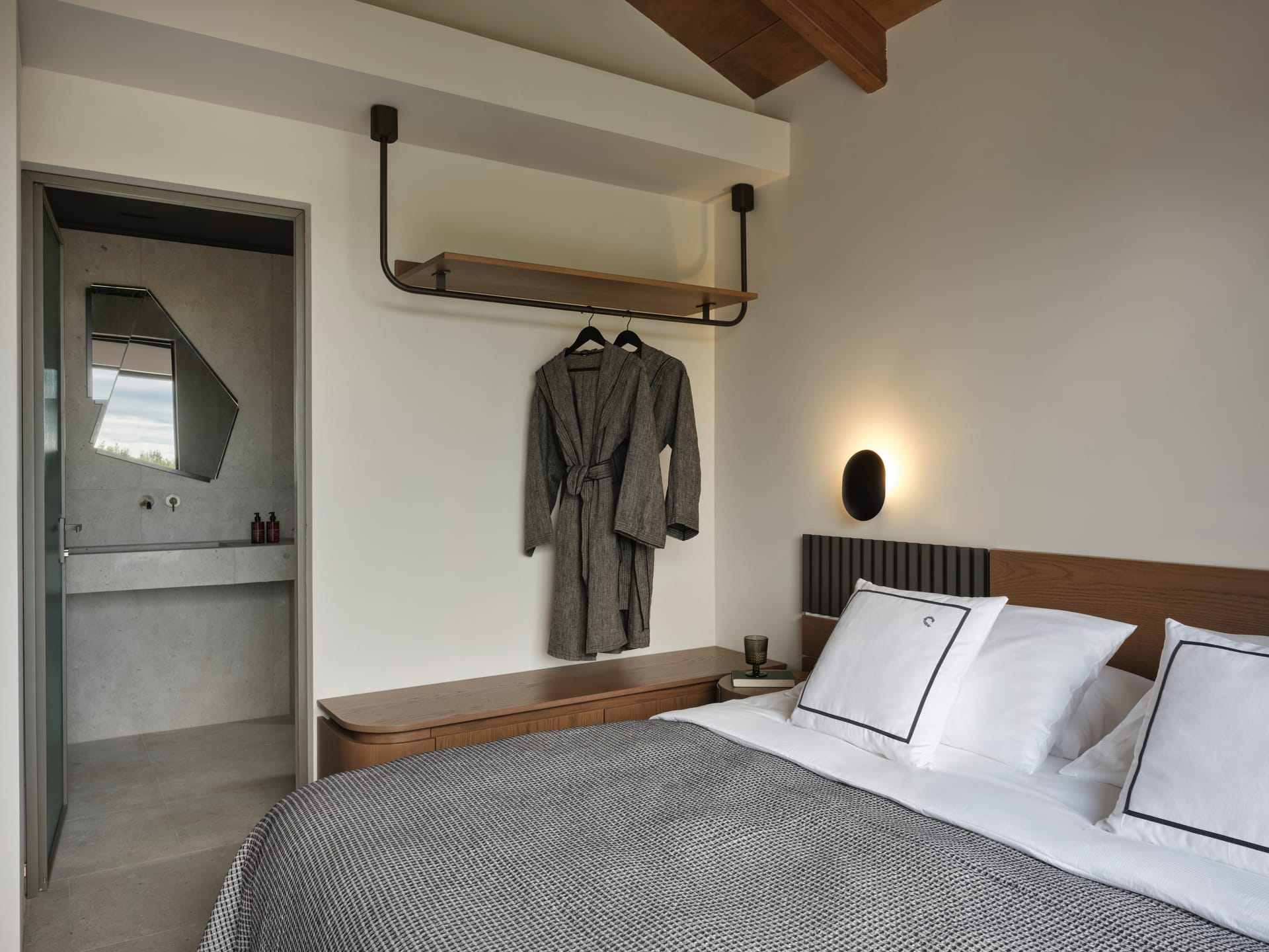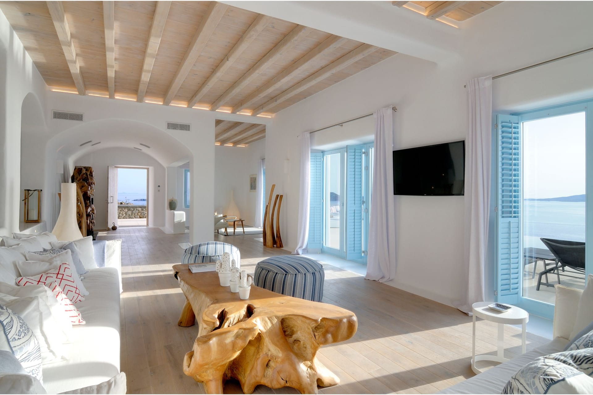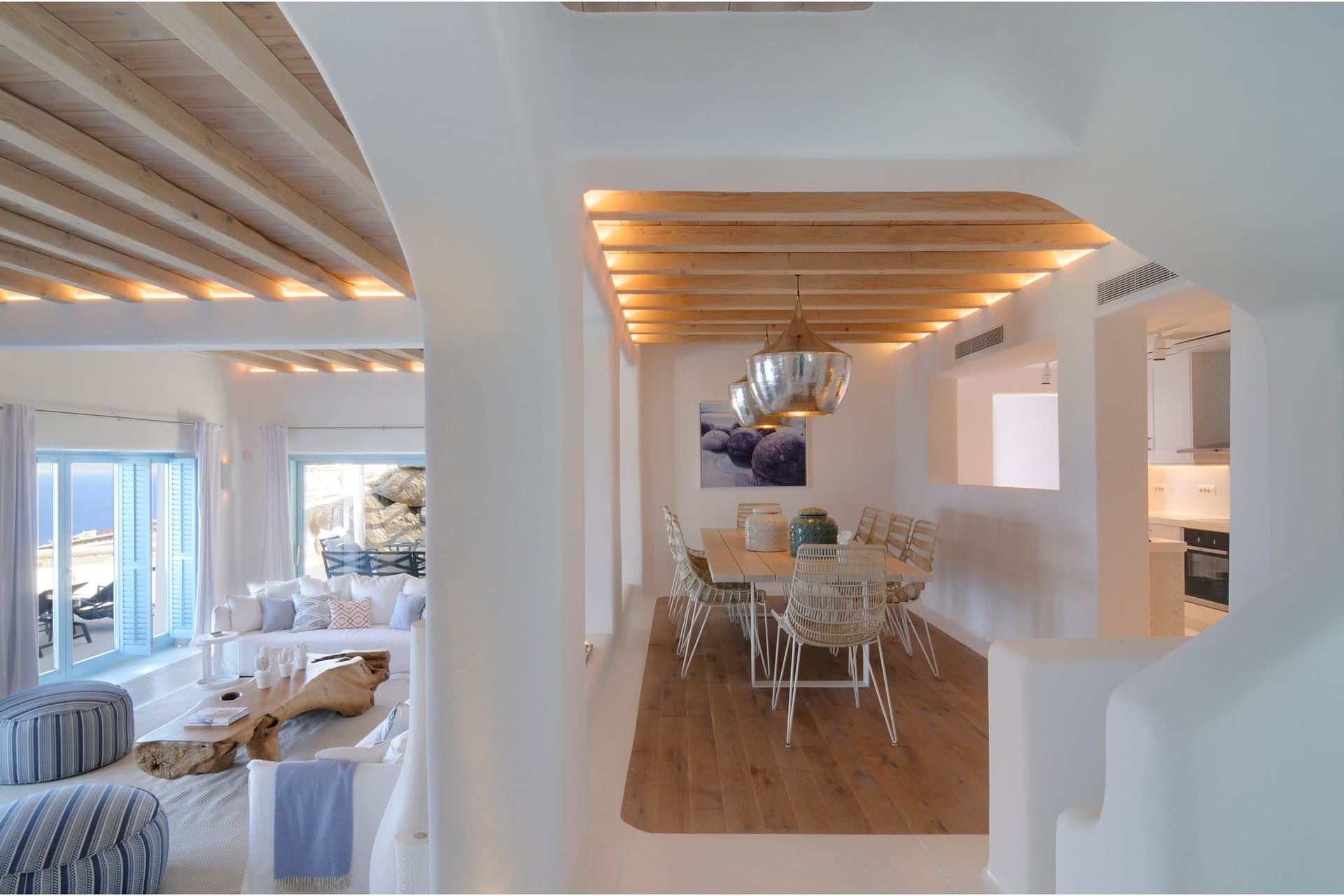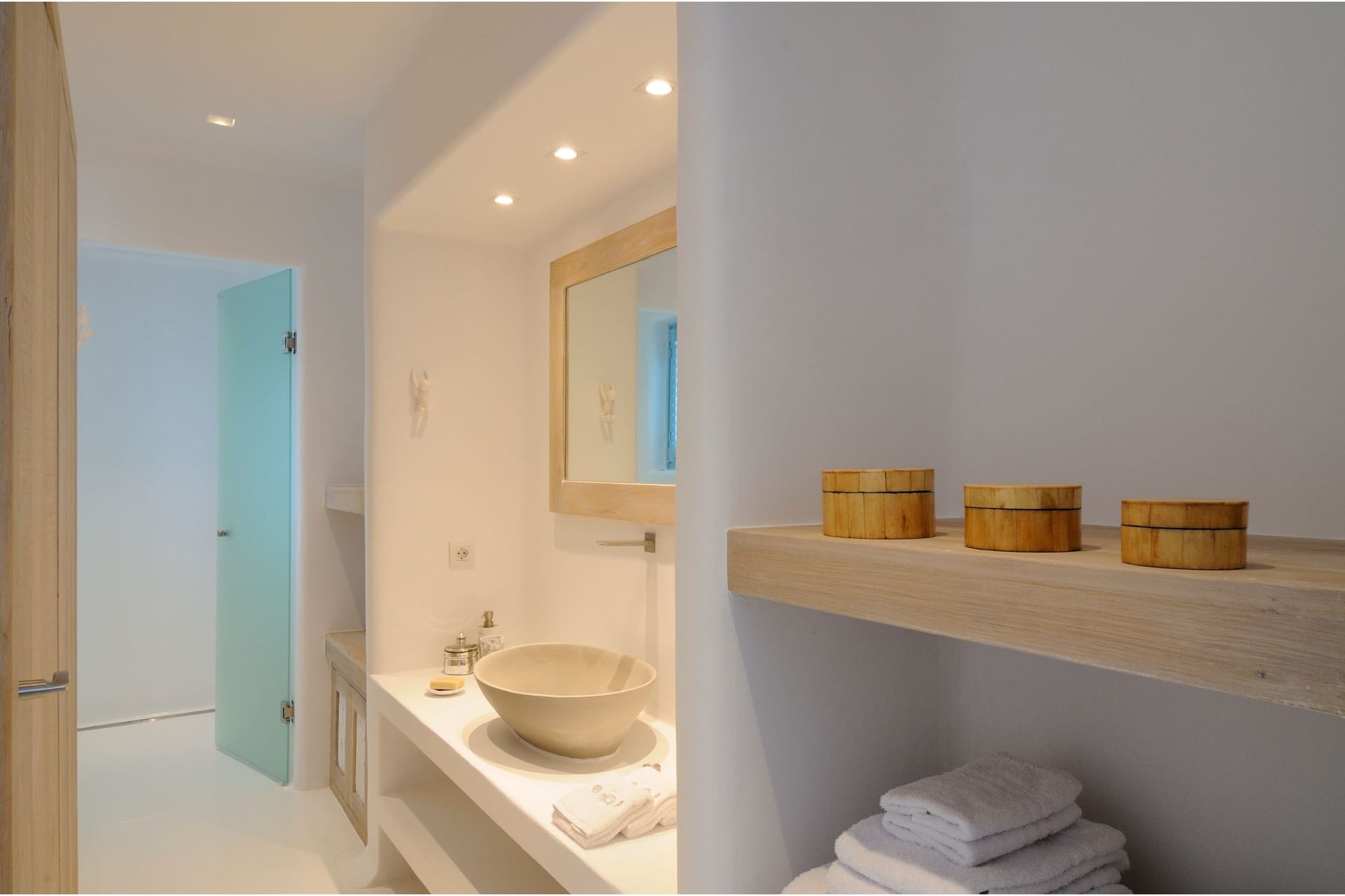 The interiors follow the white minimalist Mediterranean style of the Cyclades: white surfaces, arches and washed wood. All bedrooms are decorated with soft luxurious fabrics, while the bathrooms are modern and fully equipped. The exterior lounge and pool area, with a marvelous, unobstructed sunset view of the islands of Delos and Rhenia, offer a calming one-of-a-kind feeling.