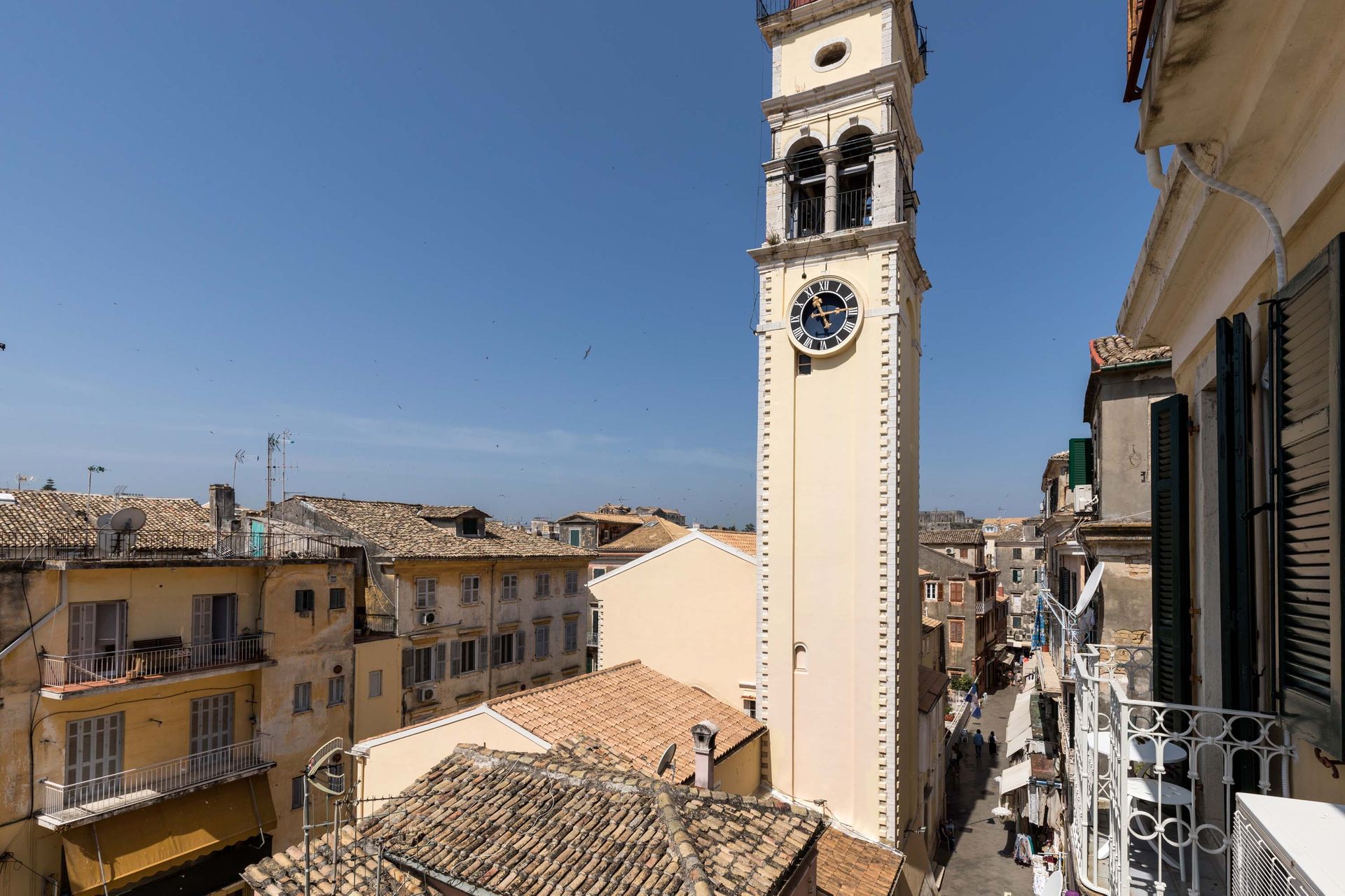 Both bedroom and living room have access to a balcony with unique views towards St Spyridon street, one of the most famous streets of Old Corfu town. At the coffee table outdoors, you can enjoy precious moments looking over the picturesque buildings and the local touristic shops.