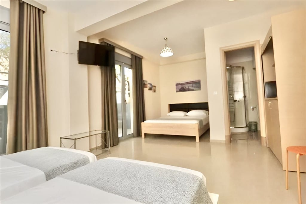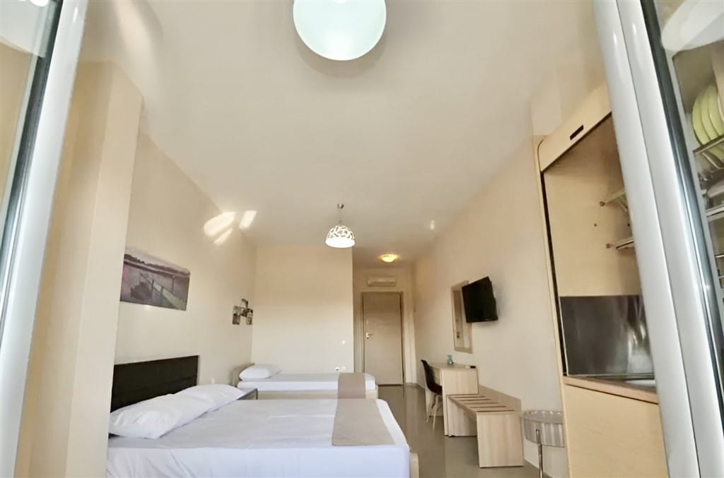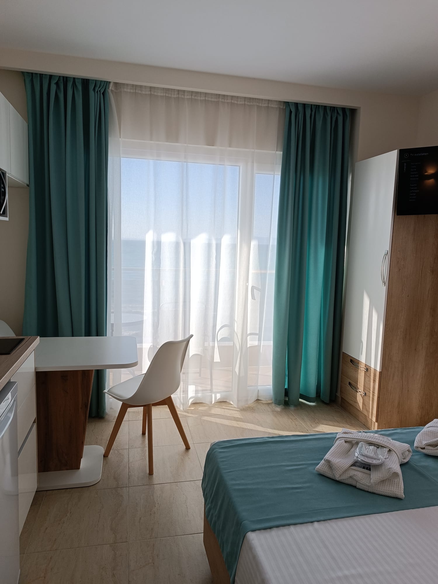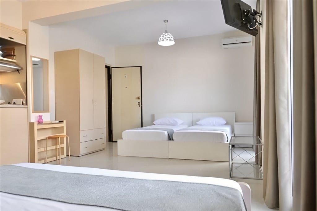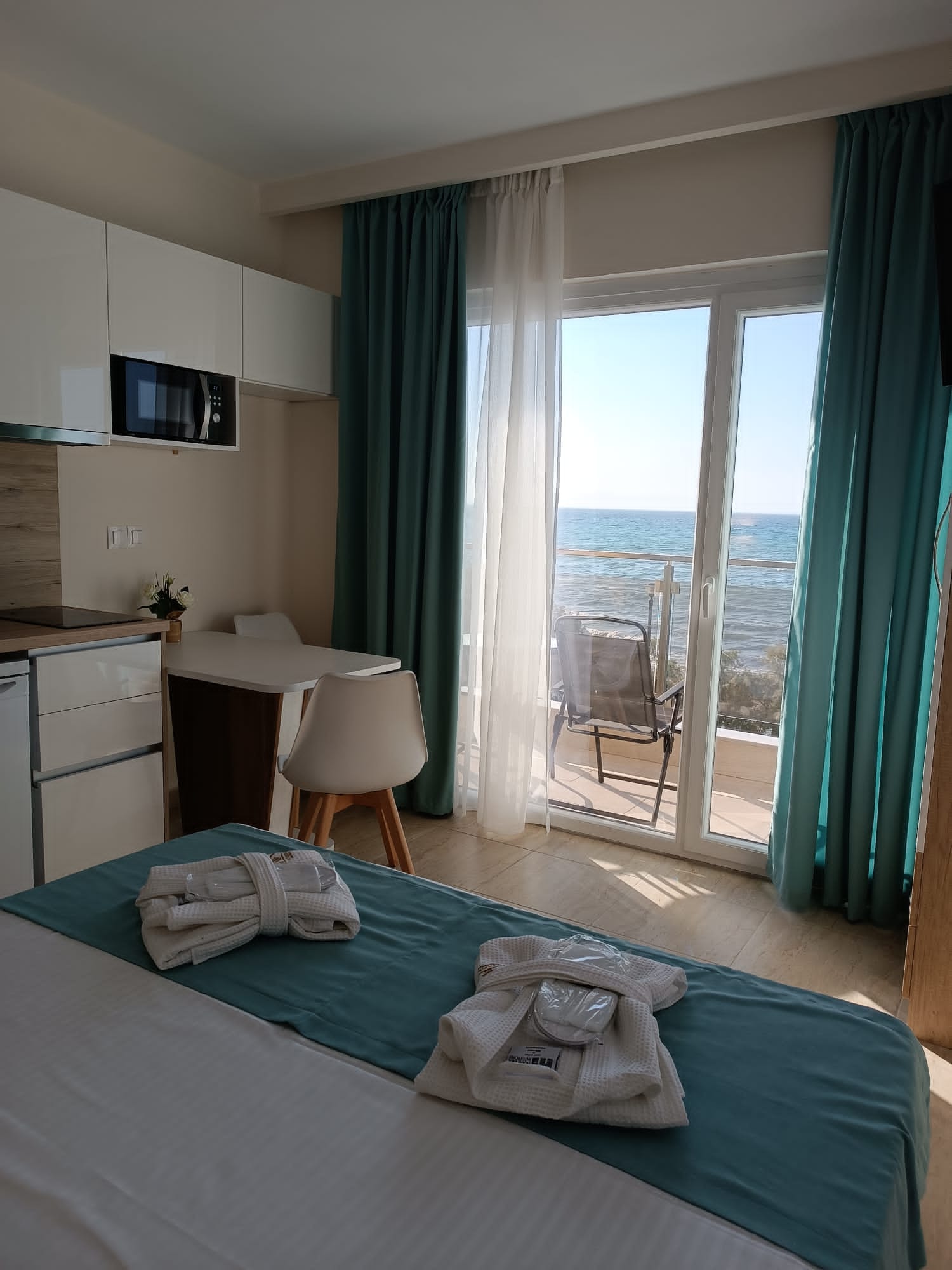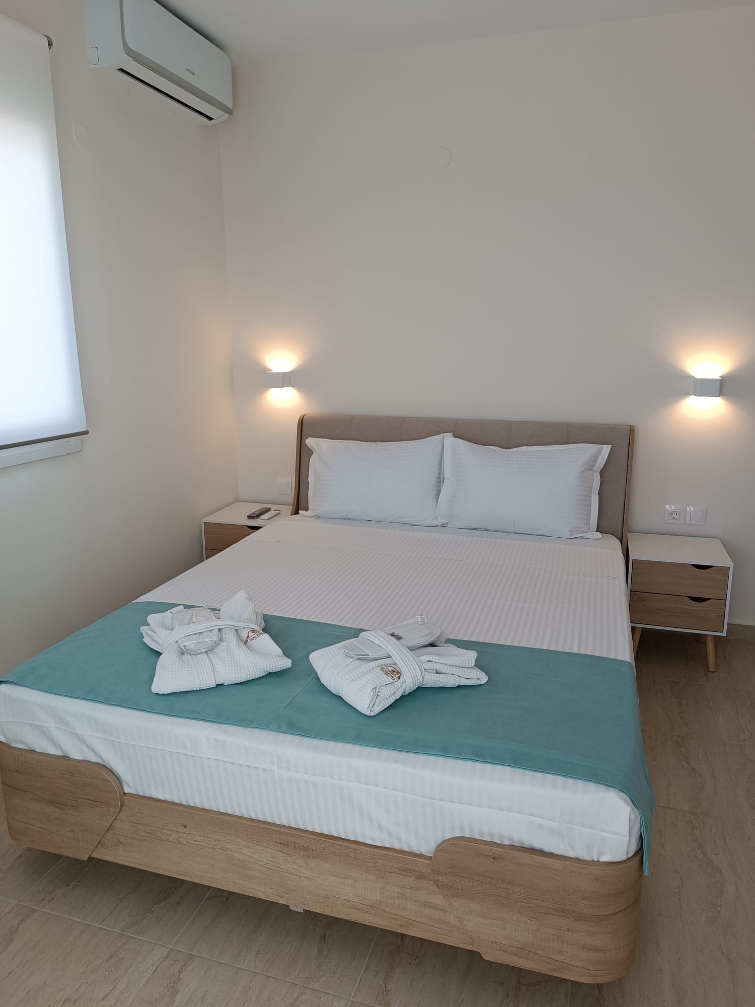The Superior Studio sea view double bed provides accomodation for 2 adults with private terrace and sea view . Equipped with a private bathroom with shower and amenities, coffee/tea facilities, kitchenette and a fridge it allows you to prepare small dishes during your stay. Private parking, Wi-Fi connection and daily maid service are offered for free. Discover cycladic architecture and modern comfort in our uniquelly designed superior studios.