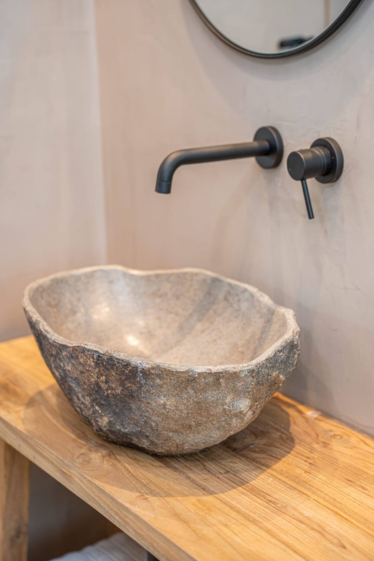 The sleek and modern furnishings are complemented by earthy tones and materials, designed with a minimalist aesthetic.