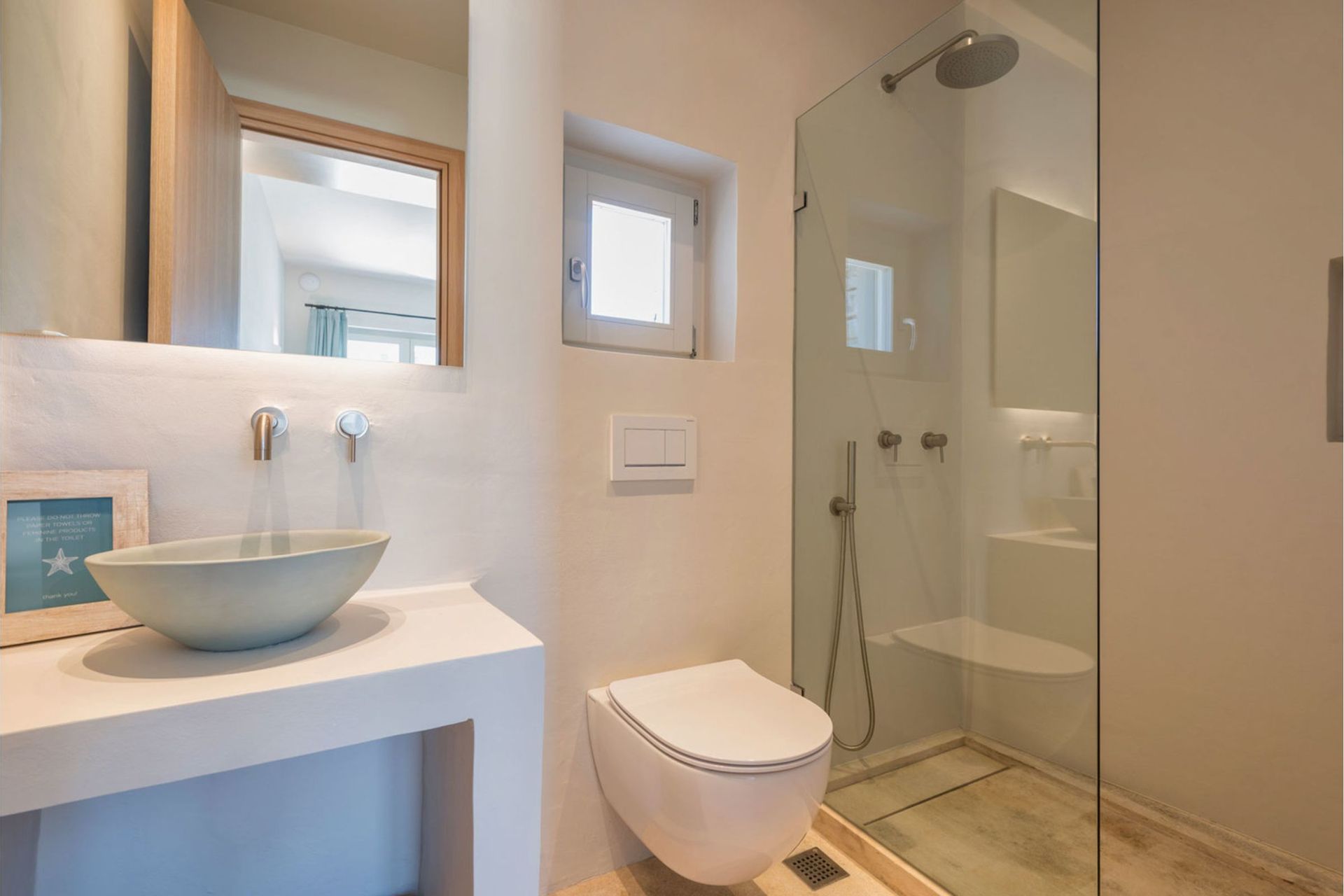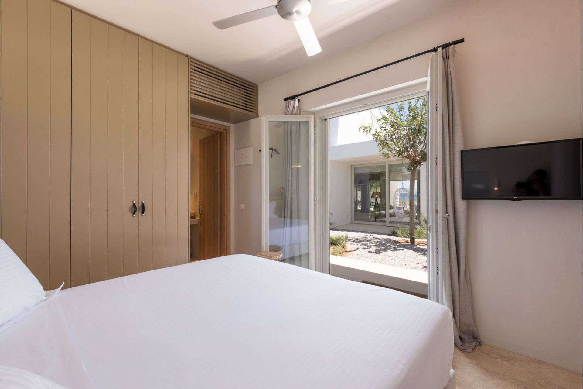 Villa Chrysa consist of 3 buildings inside the property all very close together that communicate via private paths. The main building houses, on the ground floor, the living room and the fully equipped modern kitchen. Climbing a few steps higher on the upper floor you can find a double bedroom with amazing sea view, en-suite bathroom, and a private balcony with a small sitting area. Taking the path to the other buildings first you will find the second bedroom of the villa with double bed, en-suite bathroom, and direct access to the modern gardens. The second building of the property houses two more bedrooms with double beds, en-suite bathrooms, and direct access to the gardens.