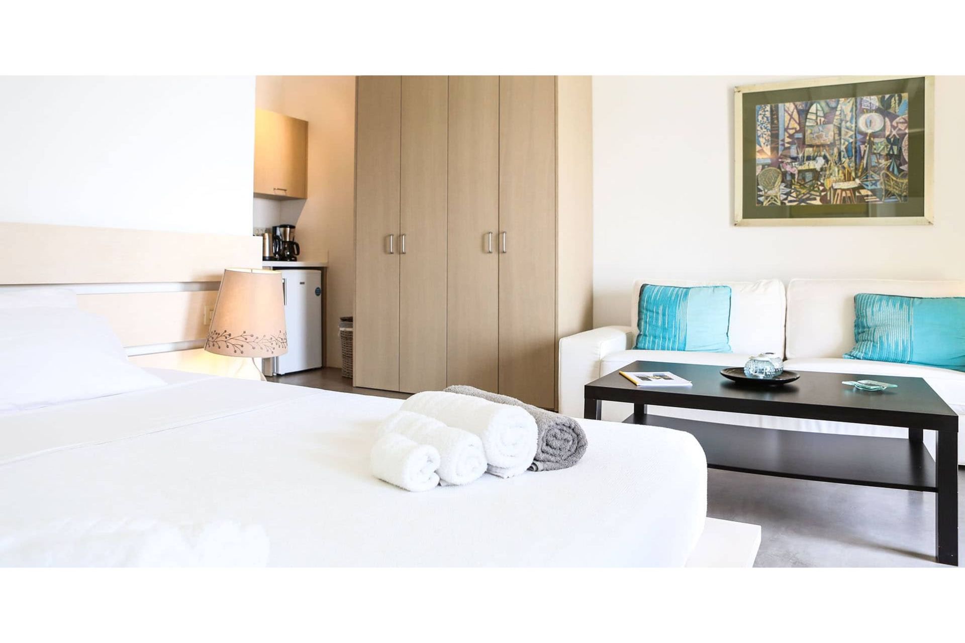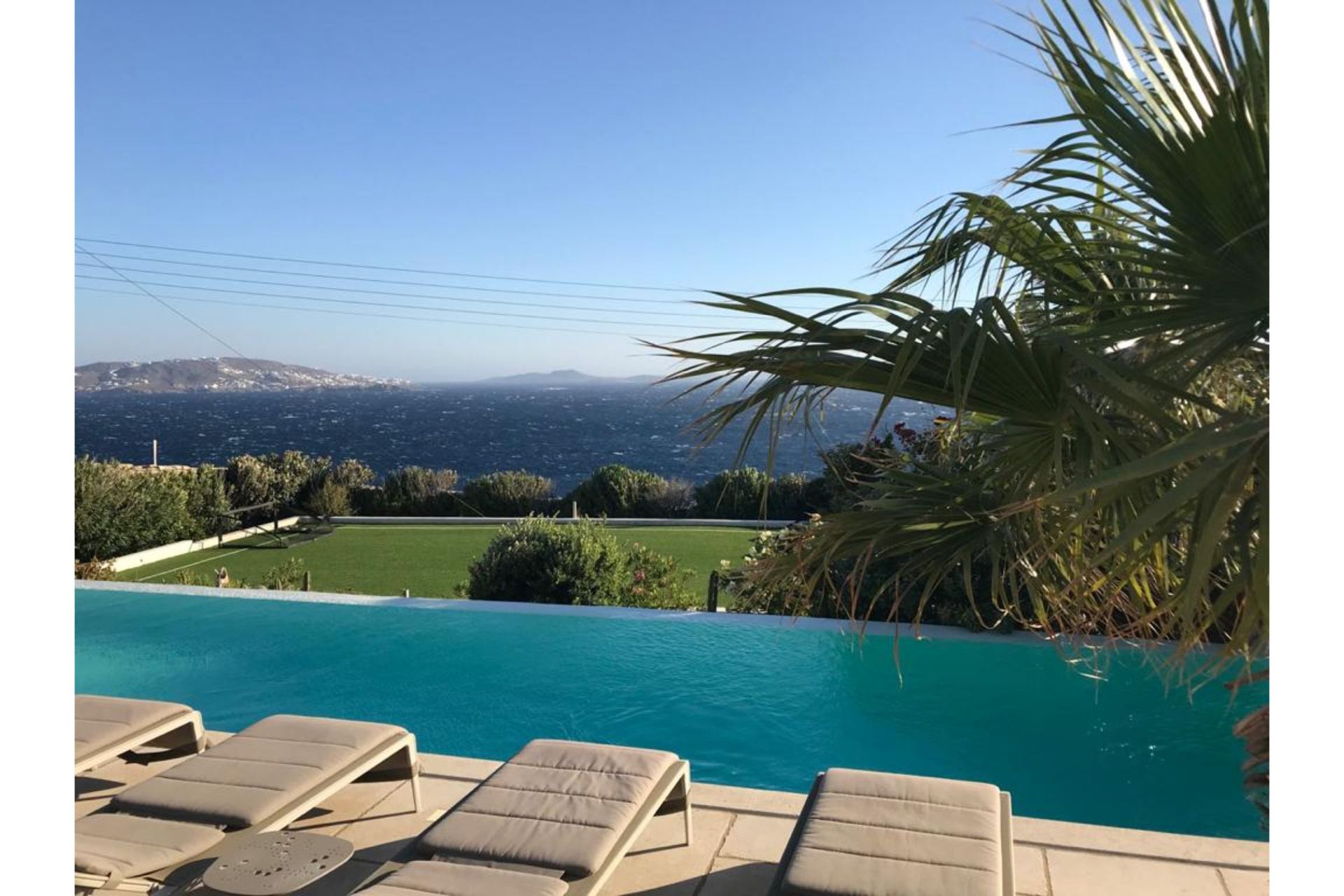 trough a large balcony door offering a perfect view of the Aegean Sea & infinity pool.