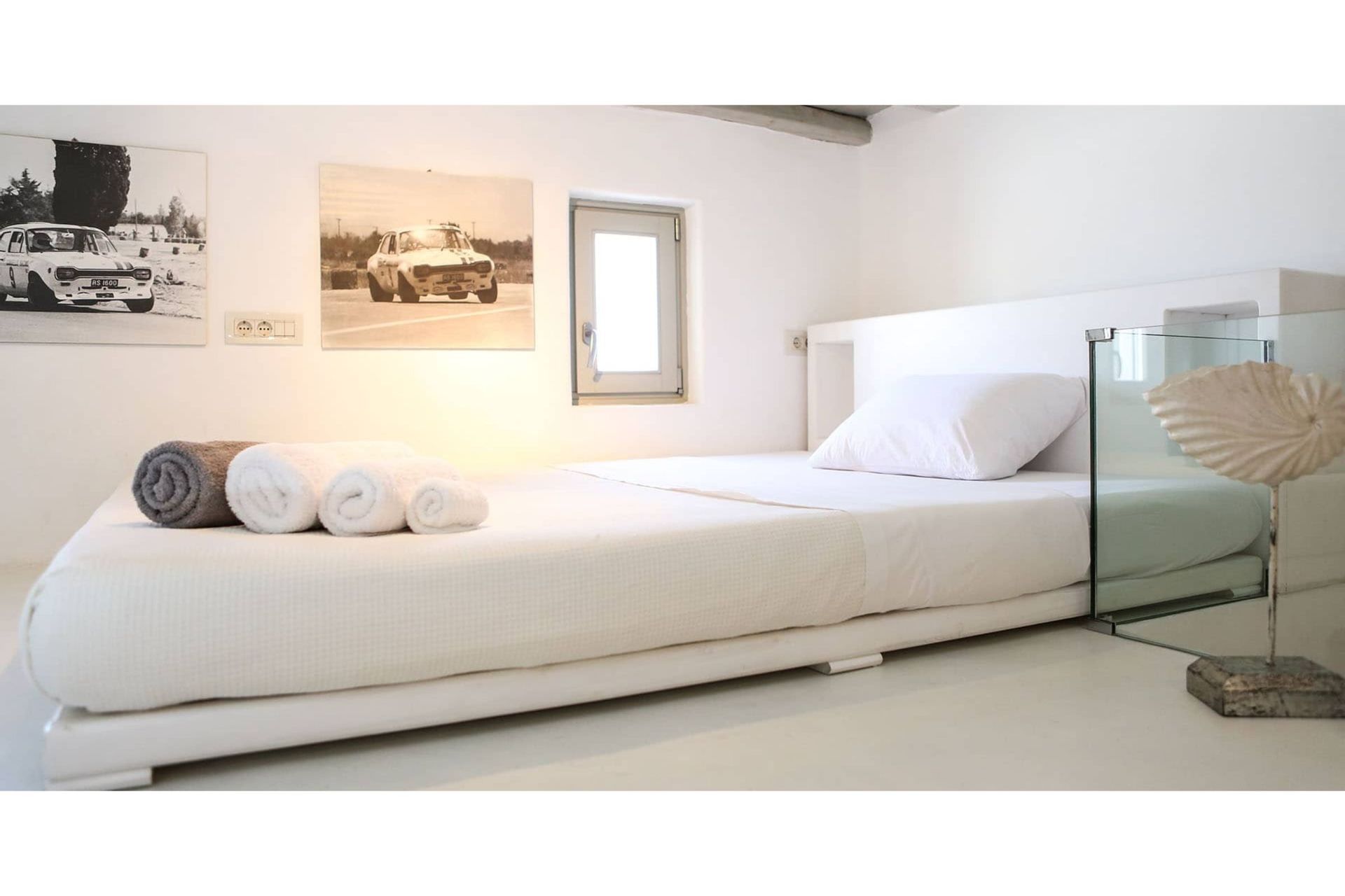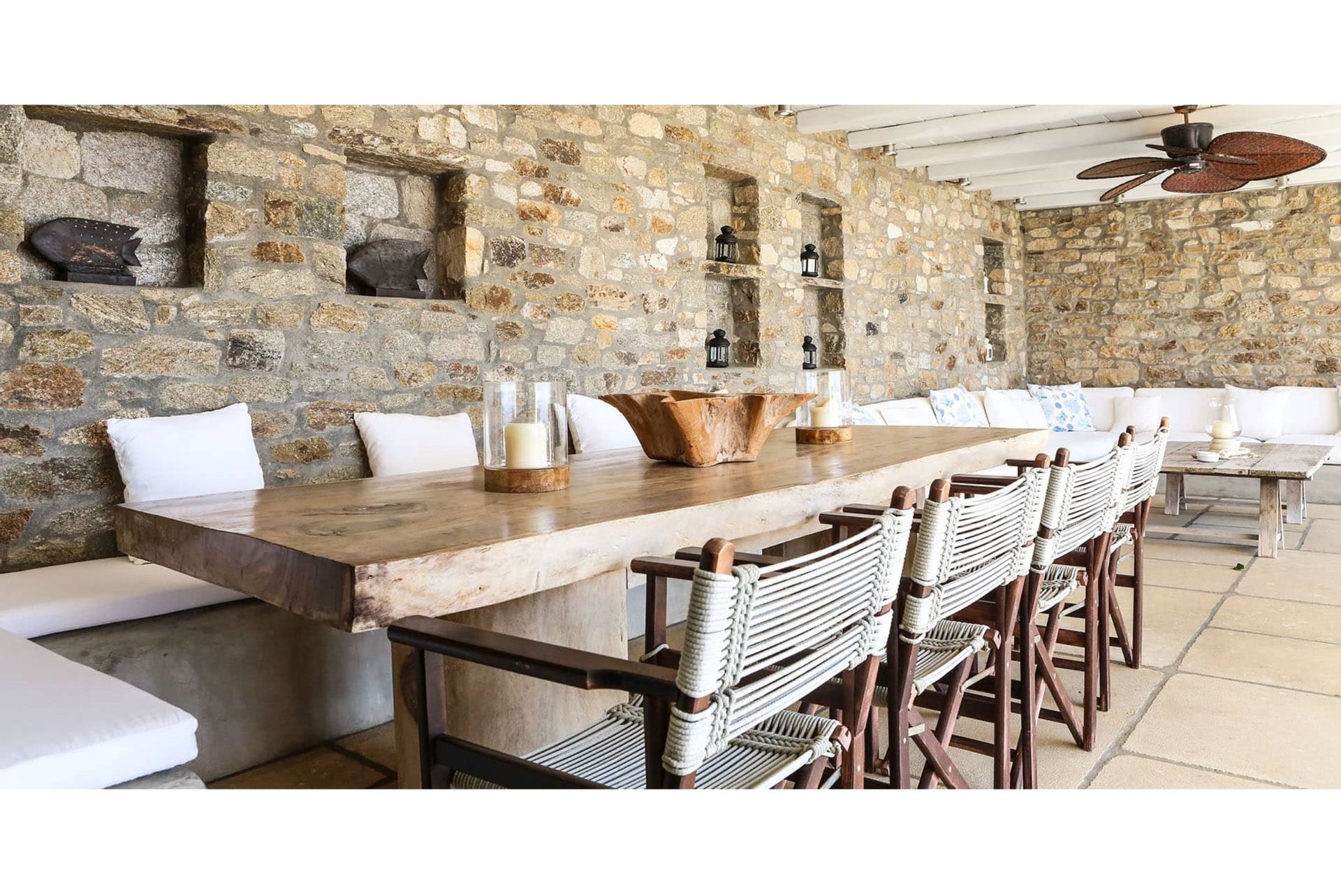 area of Agios Stefanos. The home boasts stunning sunset & Aegean Sea views. The nightlife and bustling restaurant scene of Mykonos Town is a short drive away, ensuring guests are never too far away from the action in their serene home resort. Clean, stone-built & whitewashed lines dominate the exterior and facade of the home, which is built in a traditional Cycladic style. The interior of the home is decorated in a minimal modern design aesthetic with tasteful handpicked pieces sourced from all over the world. Villa Bellacqua is