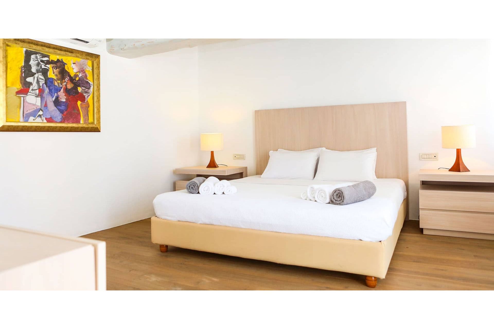✓ 1 x Double Bedroom, combined with an open space attic level including 1 x Double Bedroom, with sharing en suite bathroom with access to the garden & pool area offering a great sea view through a balcony window. (A/C, TV, WI-FI)