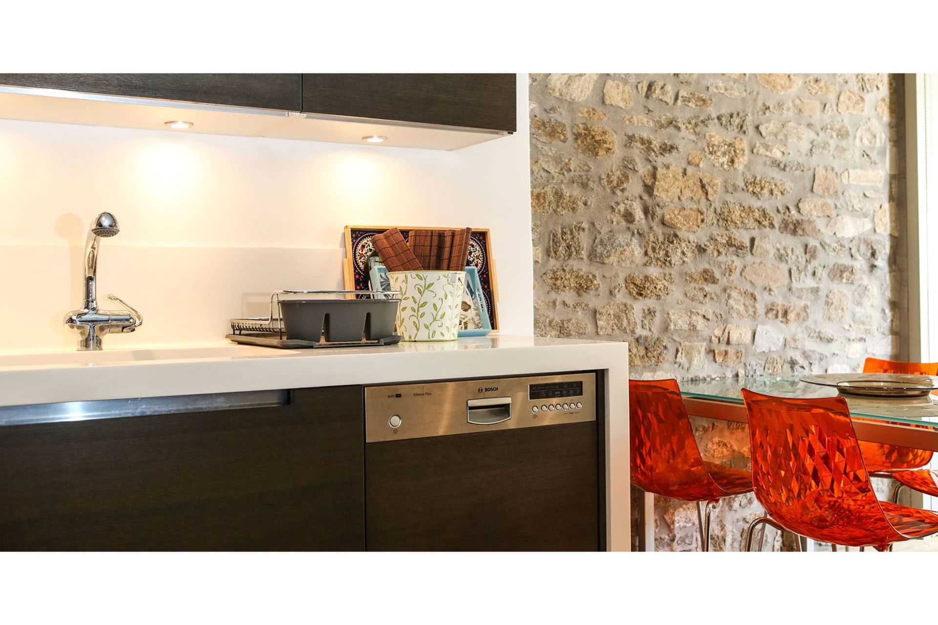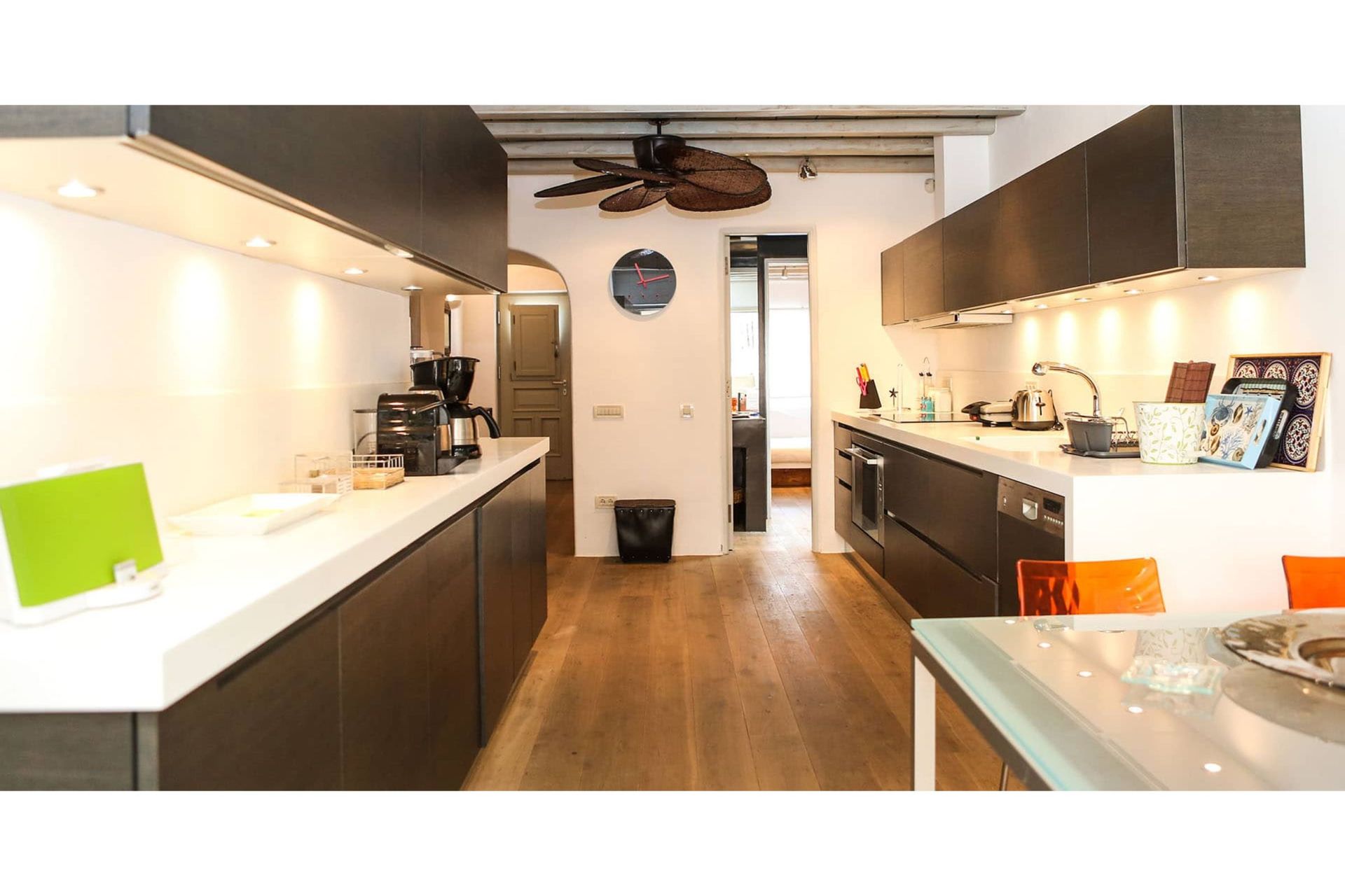 spaces are on this same floor, which include the modern, fully equipped kitchen, bar top table,