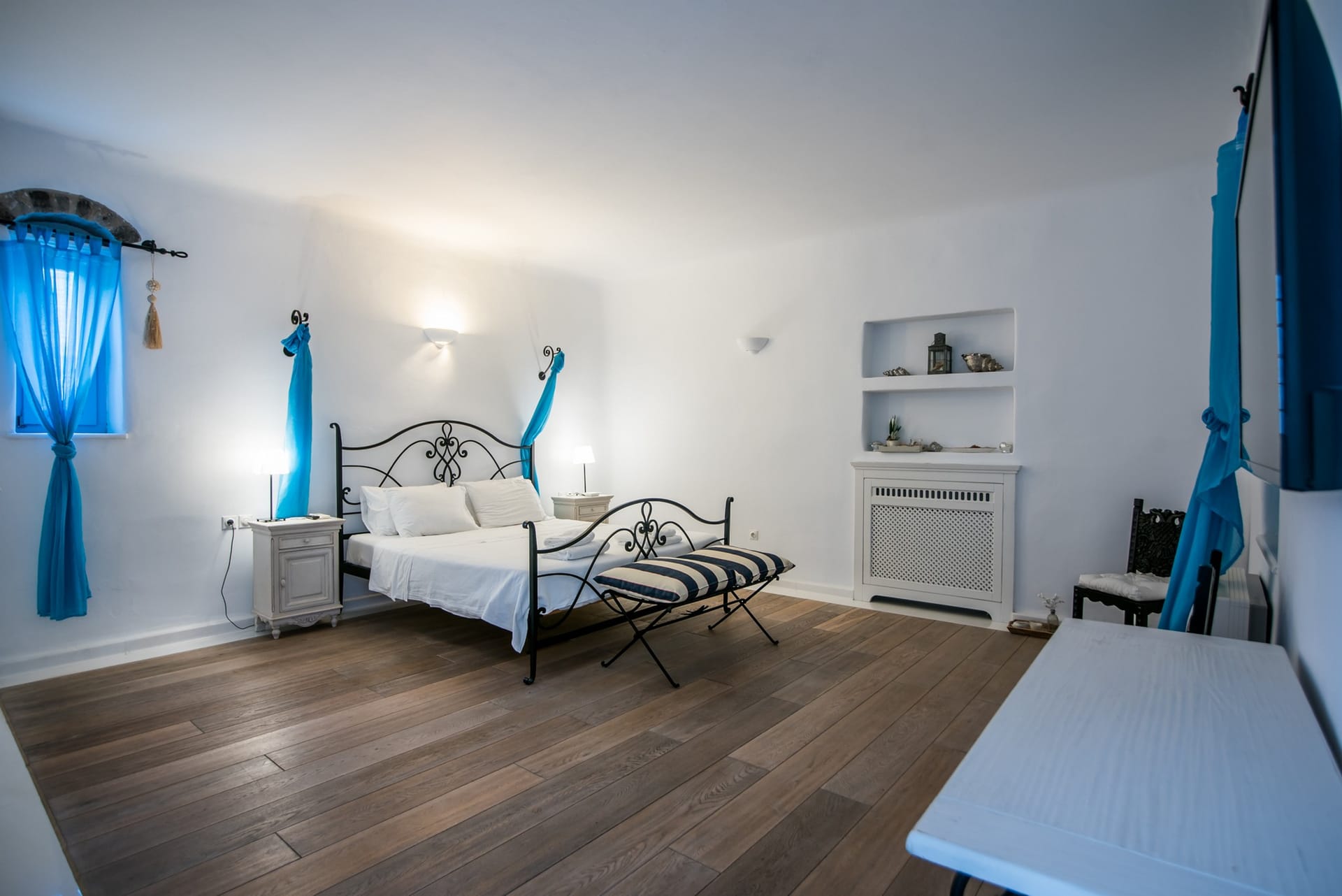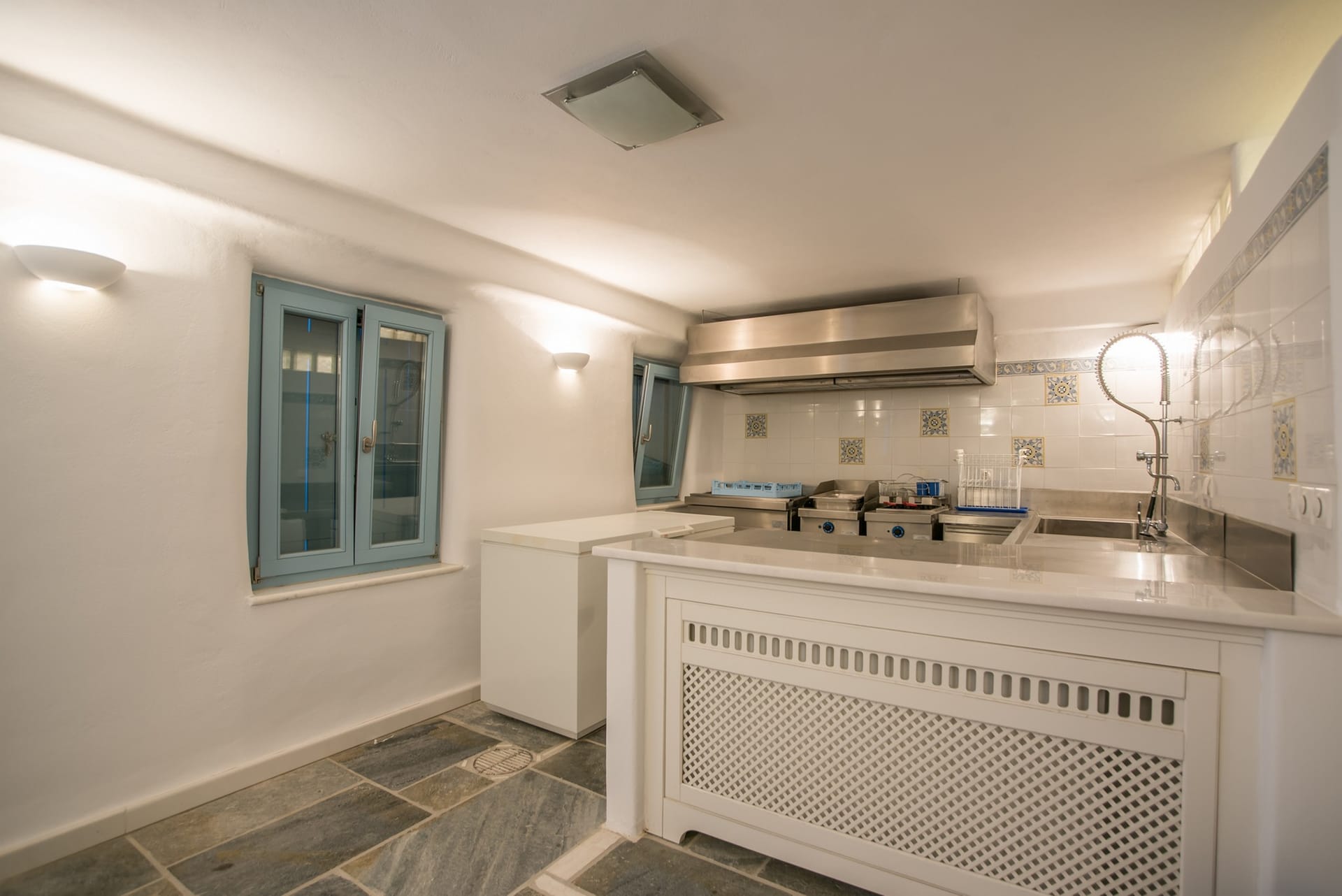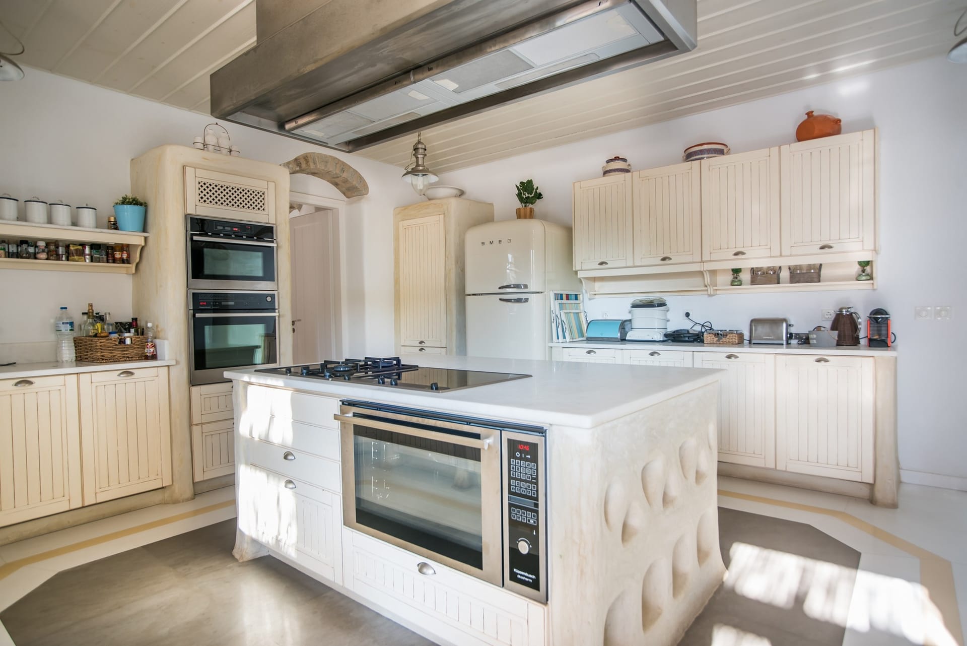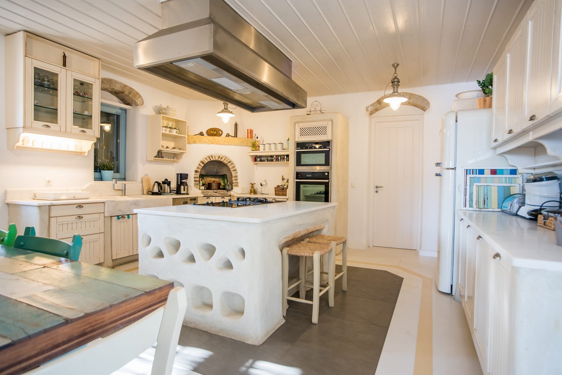 Villa Calliope is conveniently situated about 7km from the town of Antiparos and just a few steps away from the beach of Apantima, an inviting stretch of sand with crystal clear waters. This villa is designed for both indoor and outdoor living, which adds to its unique character. Therefore, it is perfectly suited for any kind of holiday, especially for big families and large groups. Large terraces wrap around the house creating space for various lounging spots, both open sky and shaded. There are also two generous dining spaces, one fitted with a traditional wood oven. The decked swimming pool is equipped with comfortable sunbeds and surrounded by a beautiful garden that offers direct access to the beach. Inside the house, the decoration is traditional with a twist. The décor is country-chic with revived Greek-style furnishings that are sometimes interrupted by playful pop-art details. The kitchen, fitted with an island and a dining table, offers ample space for the cook to prepare a meal while chatting with family and friends. The bedrooms, lavishly decorated and fitted with windows that offer soaring views, are perfect for midday lounging during the hottest days of the Greek summer, as well as a great night’s sleep. The villa is also perfect for events, such as weddings and baptisms. Its professional kitchen facilities, large barbeque and spacious parking spaces enable this property to be used for events of any size.