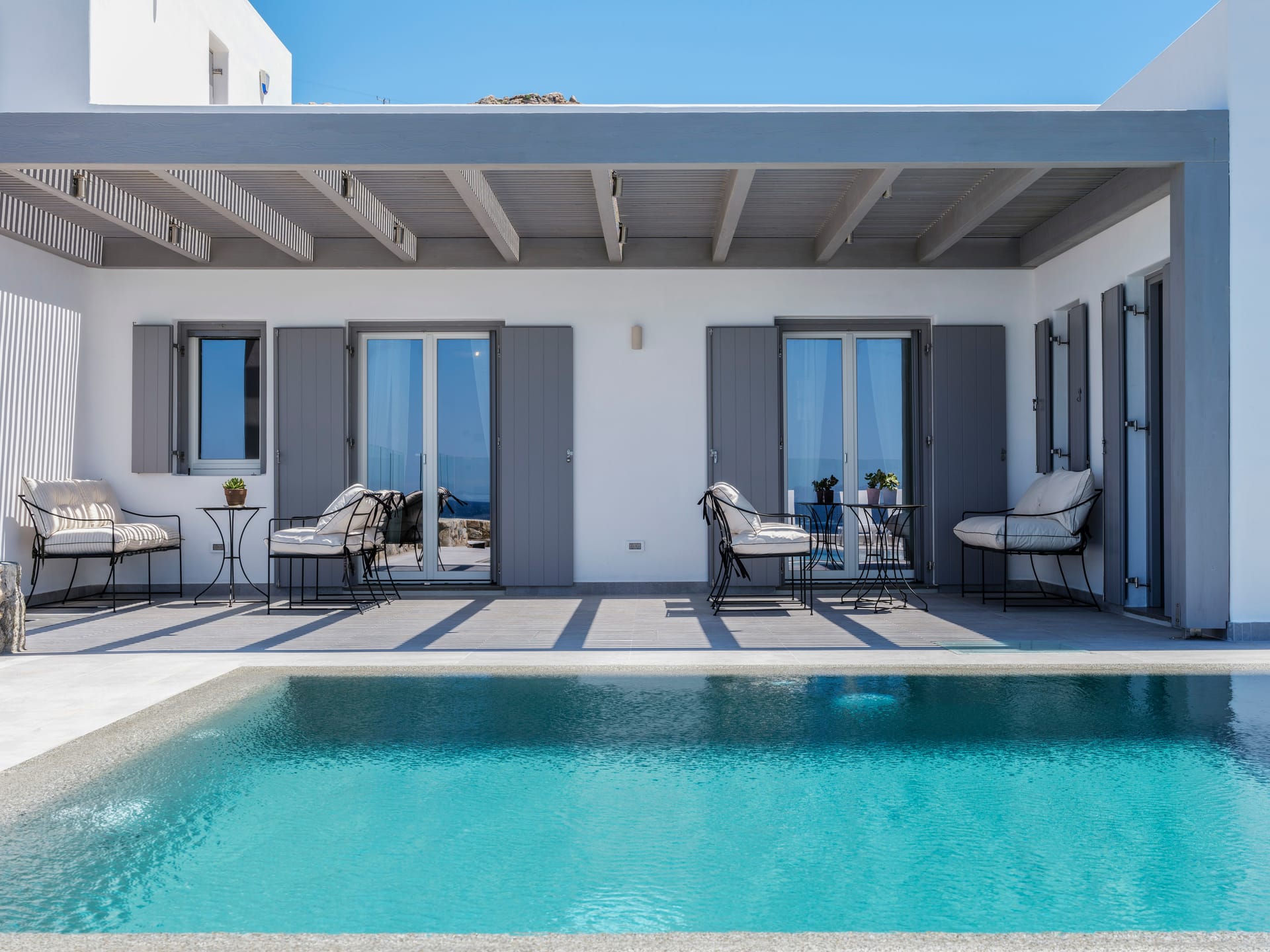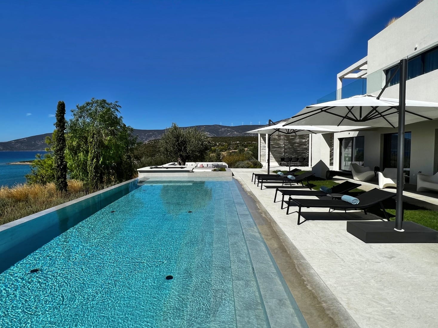 Boasting a privileged location in the Pouli area, just a few minutes away from the vibrant town of Mykonos, this beachfront villa is a luxurious modern retreat that epitomizes elegance and comfort. This modern architectural masterpiece seamlessly blends contemporary design with breathtaking