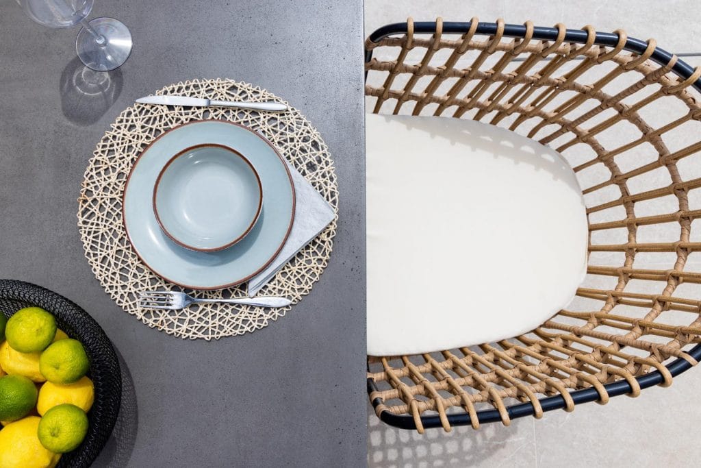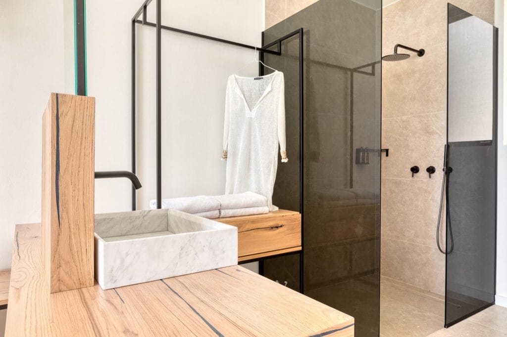 Inside, the villa’s black-and-white palette creates a seamless flow between indoors and outdoors. Large windows frame the sea and French doors open to the pool terrace. The fully equipped kitchen connects to the living and dining areas, where a wooden table seats up to 11. Five luxurious bedrooms feature king beds and en-suite bathrooms; four include private balconies for peaceful moments under the sun or stars.