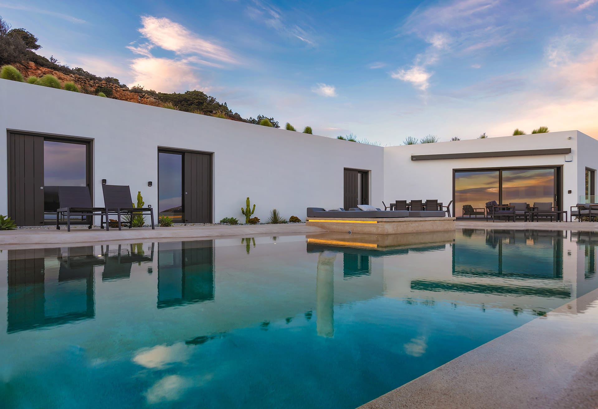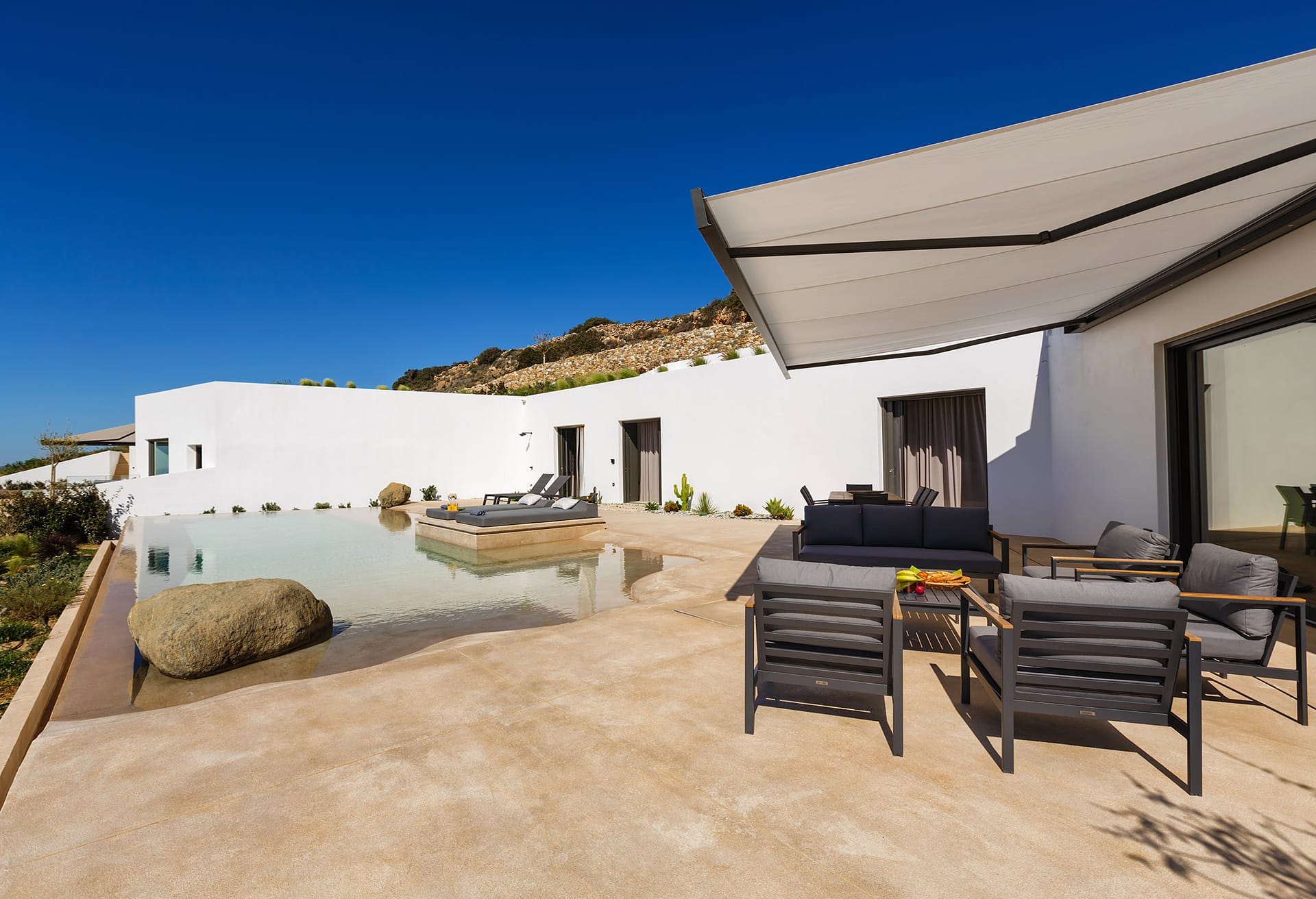 - 2 Large infinity swimming pools of 100 and 50 sqm with deck and amazing view to Kalafatis beach, 24 sunbeds and poufs, 3 double sunbeds, and 1 large hammock while a massive corner pergola offers lavishly the shadow that guests are enjoying in front of swimming pool, the bar and the dining area and another pergola specially designed for quitter moments surrounded by olive trees.