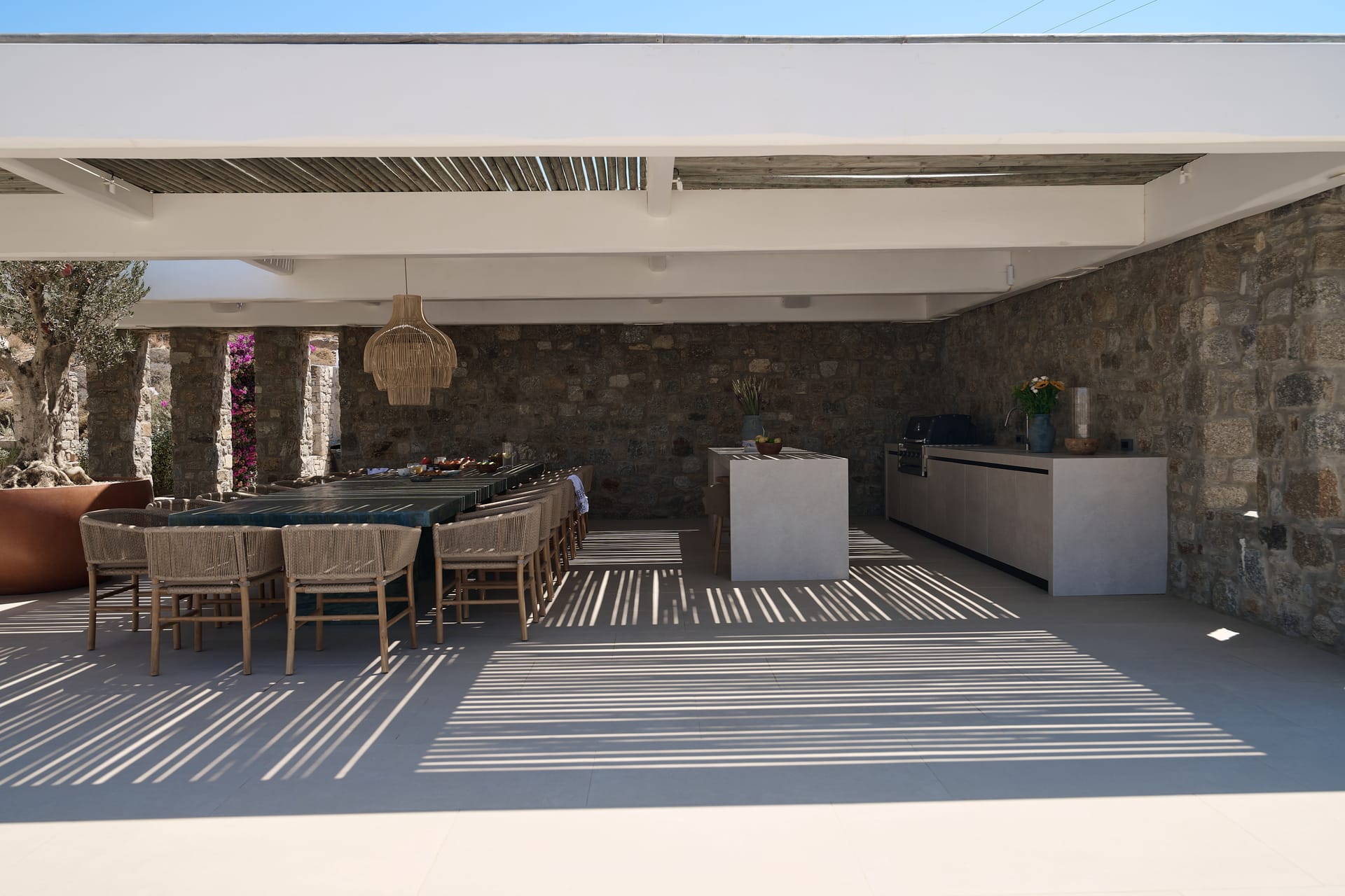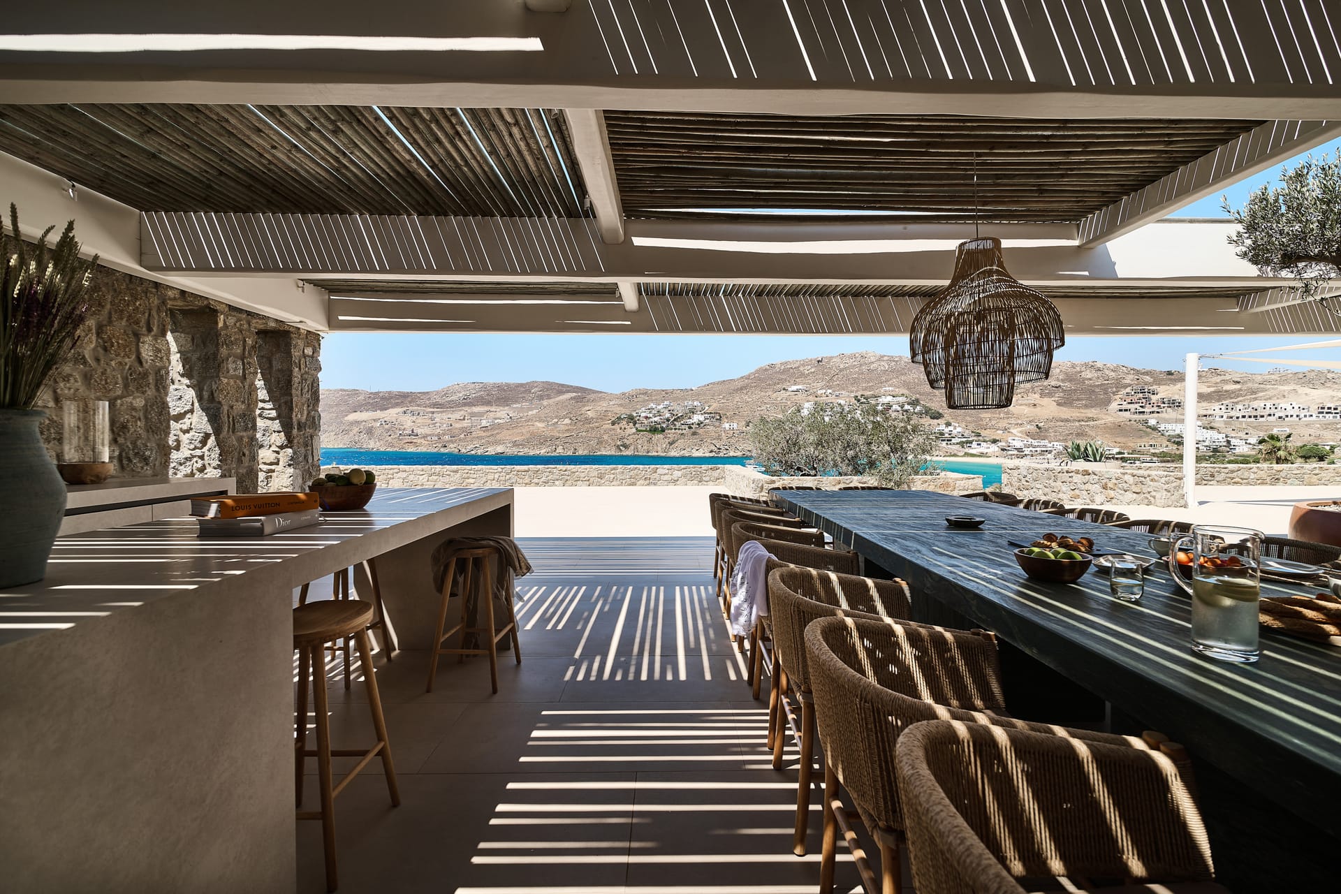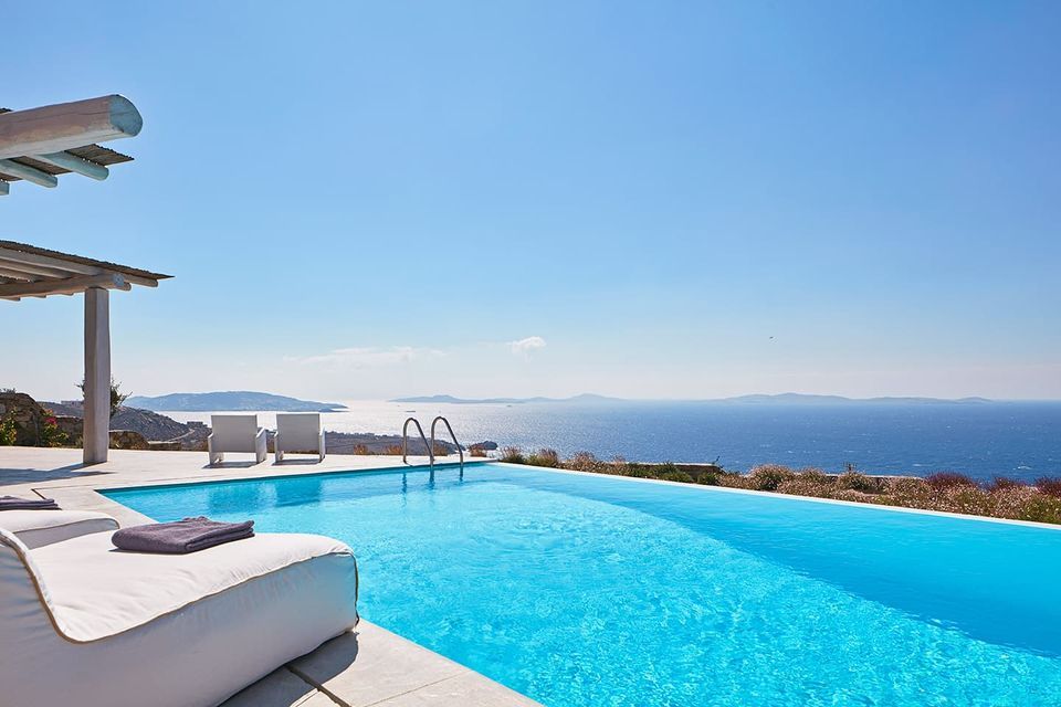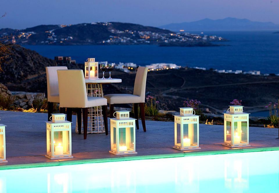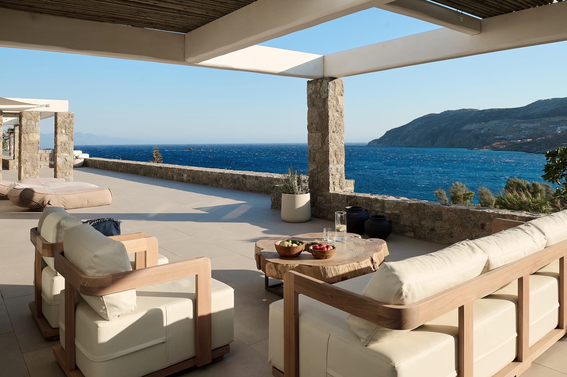 Dine al fresco on the villa's terrace, where a bespoke outdoor dining area overlooks the sparkling sea, providing an enchanting backdrop for gourmet meals prepared in the fully-equipped, chef-inspired kitchen. As the sun sets over the Aegean, the villa's outdoor lounge areas become an idyllic setting for cocktails and conversation.