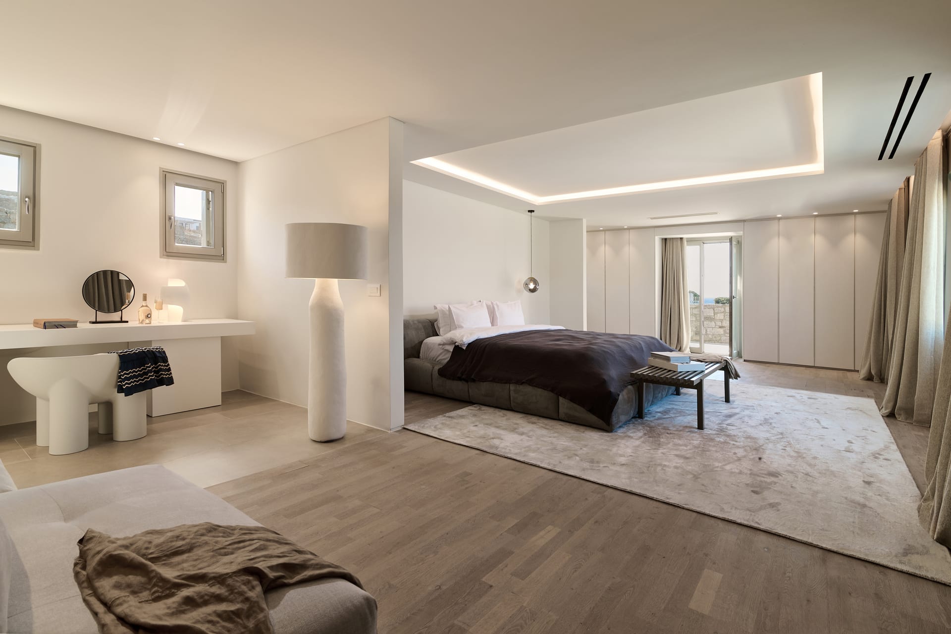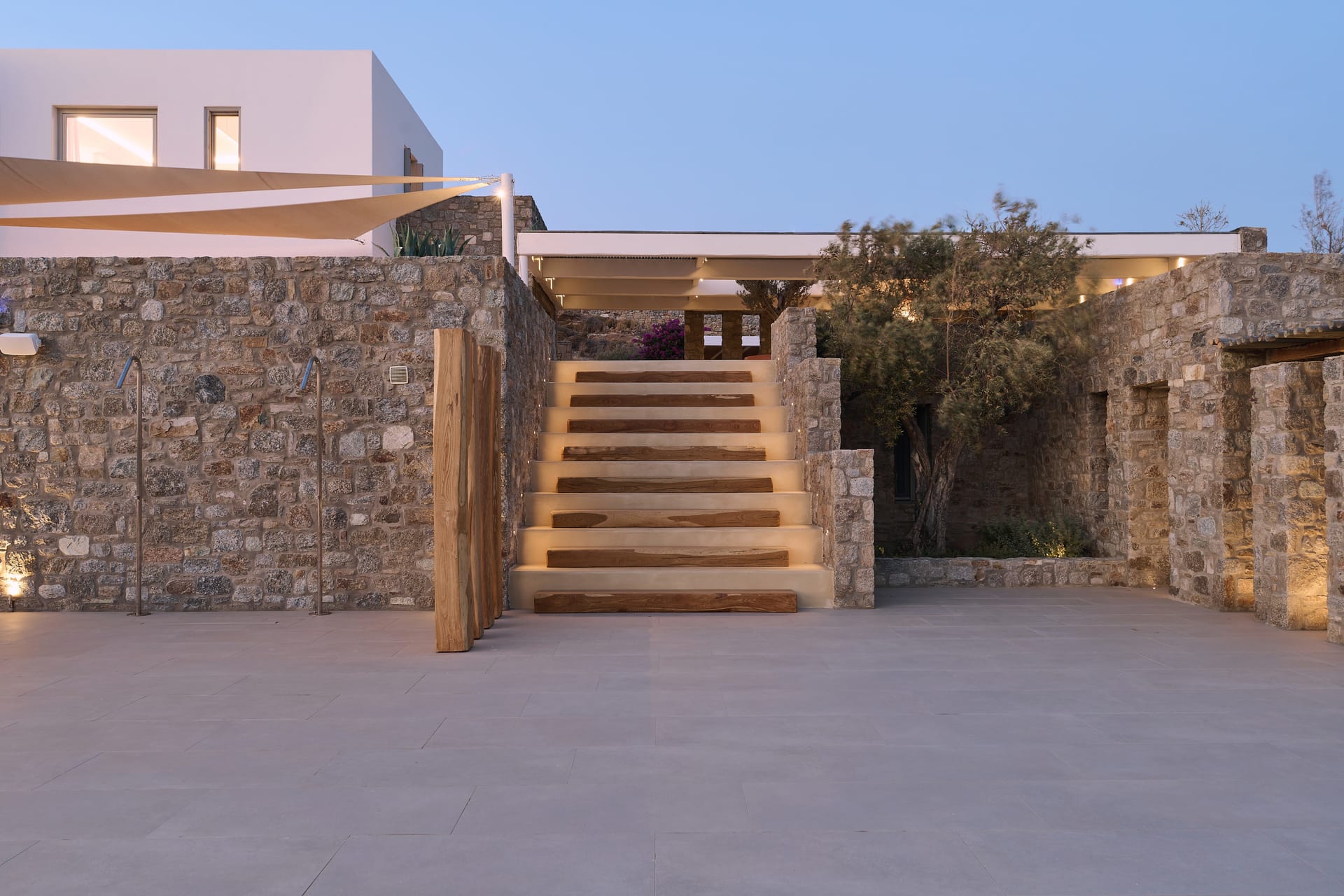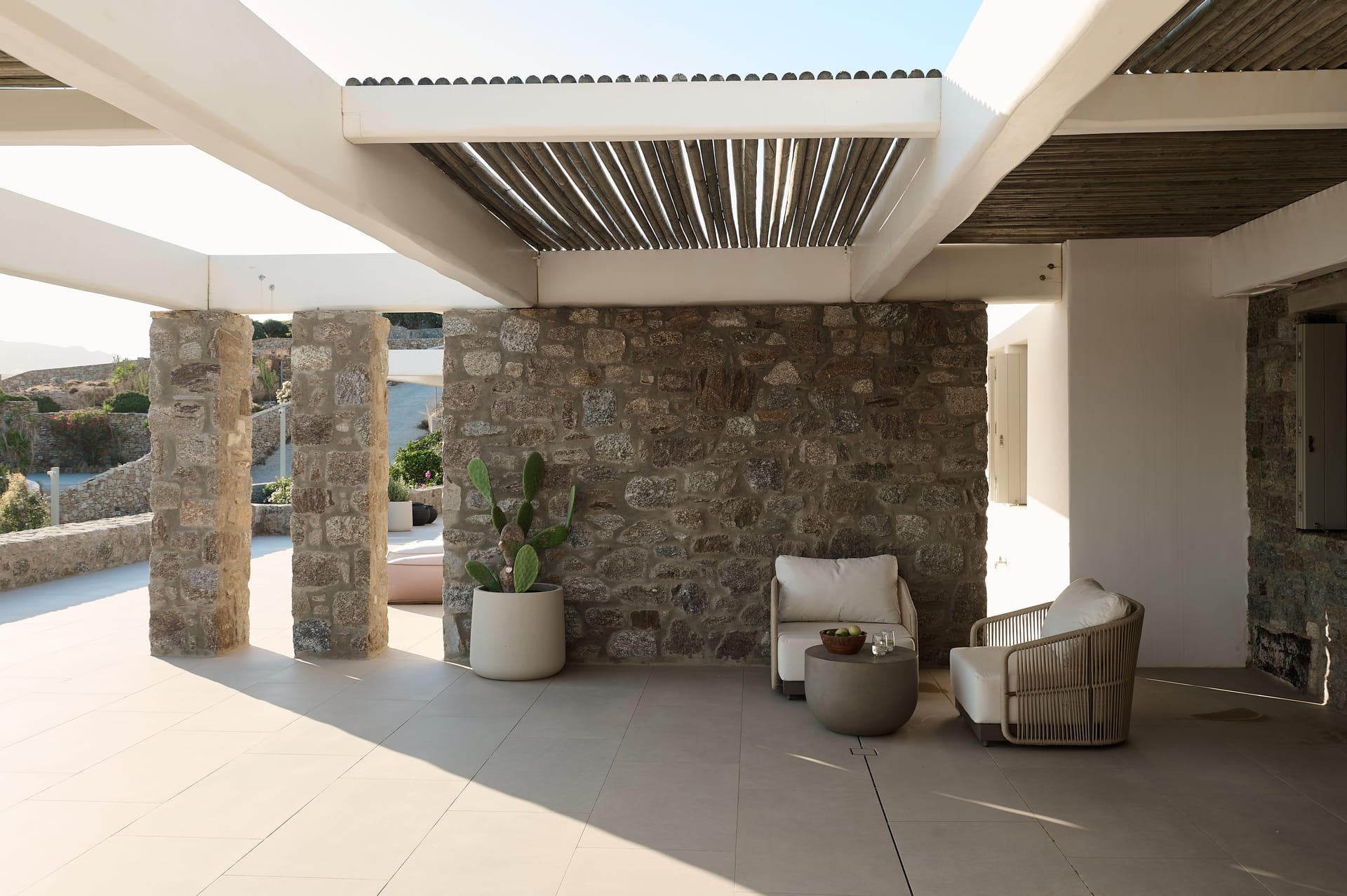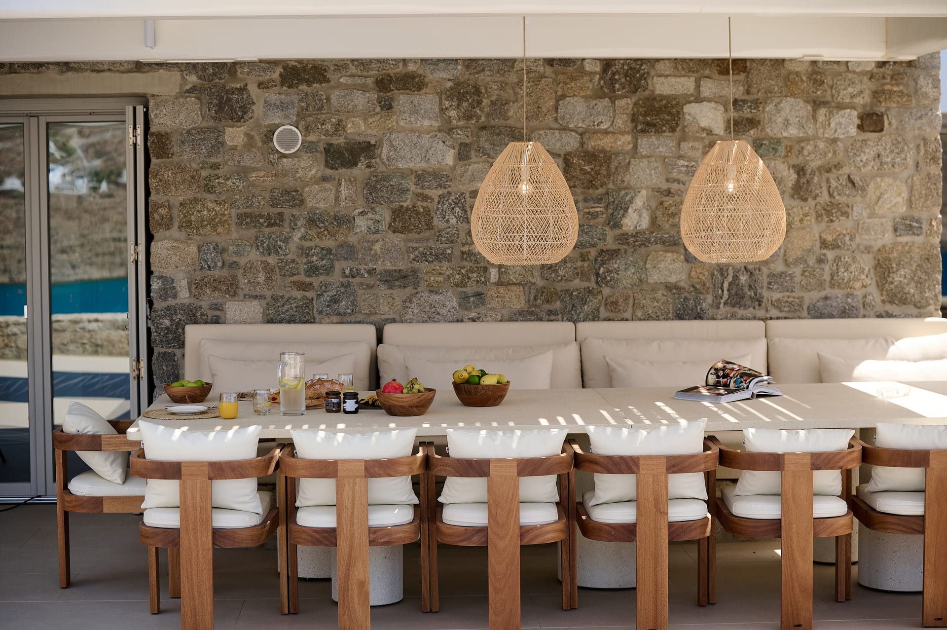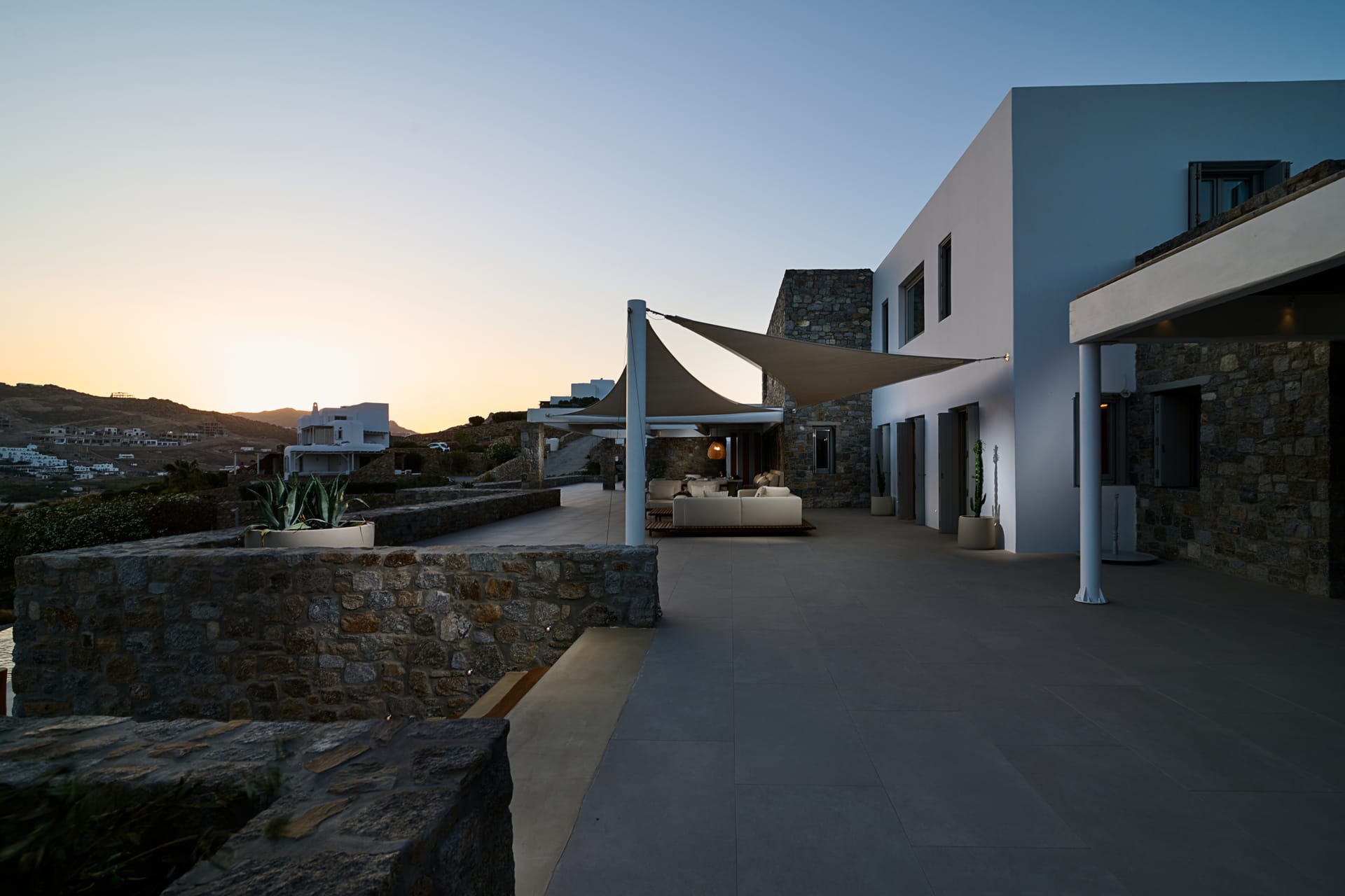 Dine al fresco on the villa's terrace, where a bespoke outdoor dining area overlooks the sparkling sea, providing an enchanting backdrop for gourmet meals prepared in the fully-equipped, chef-inspired kitchen. As the sun sets over the Aegean, the villa's outdoor lounge areas become an idyllic setting for cocktails and conversation.