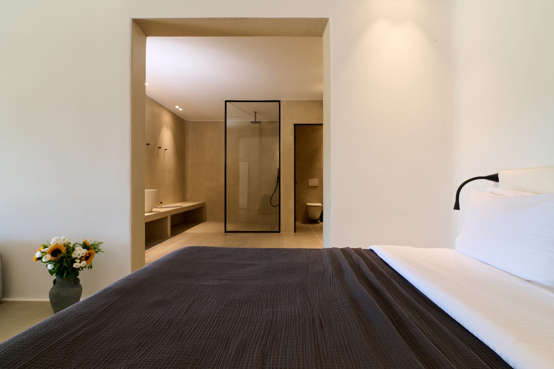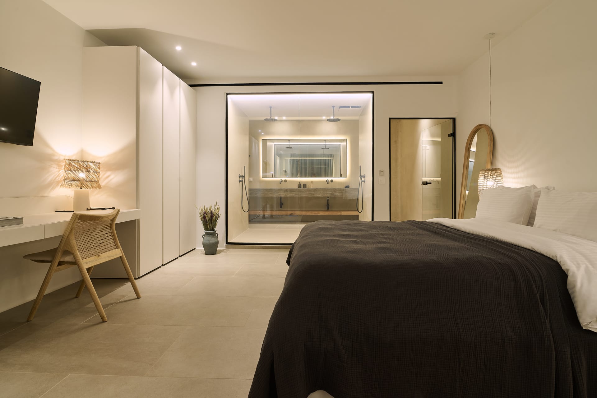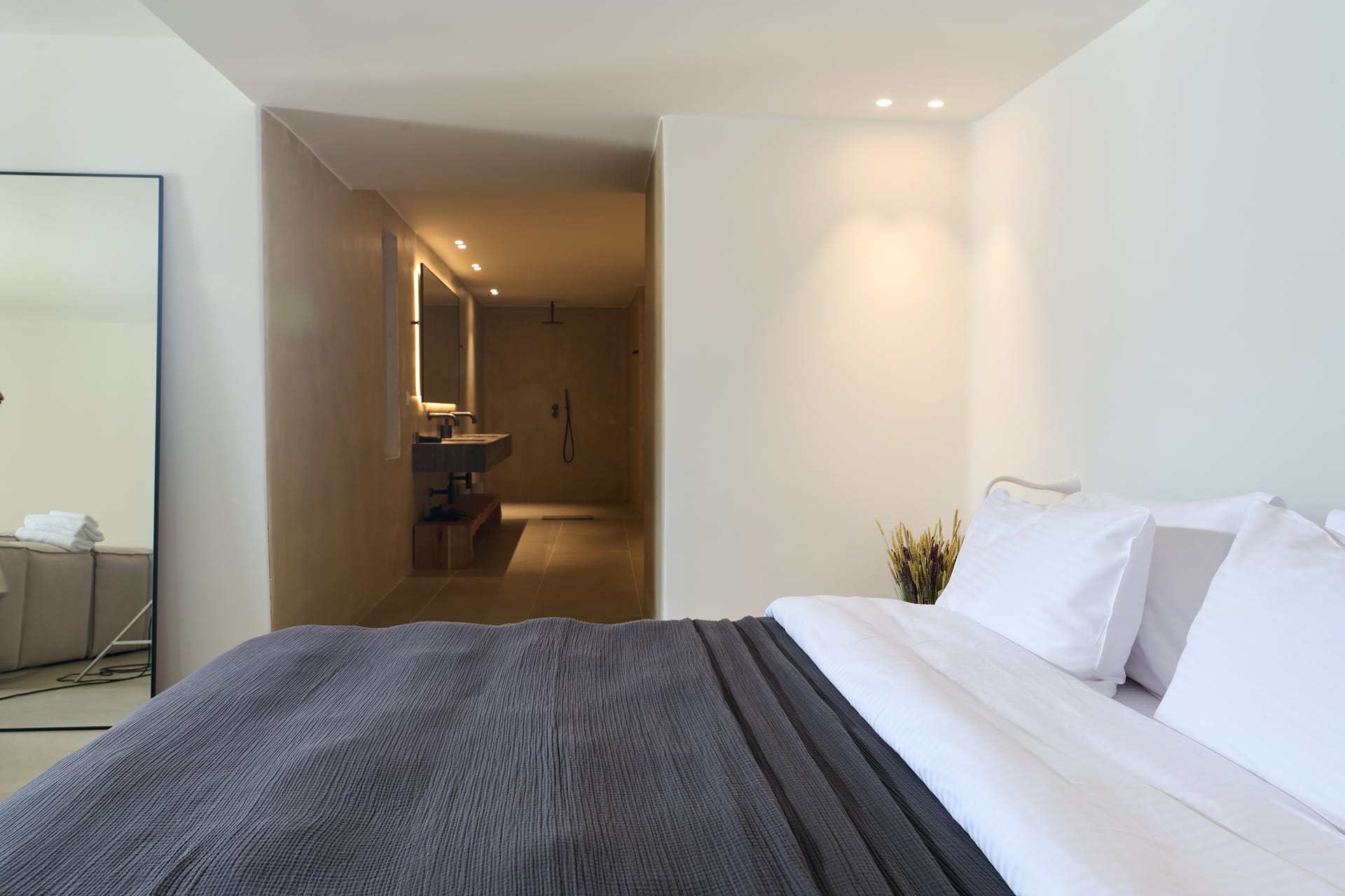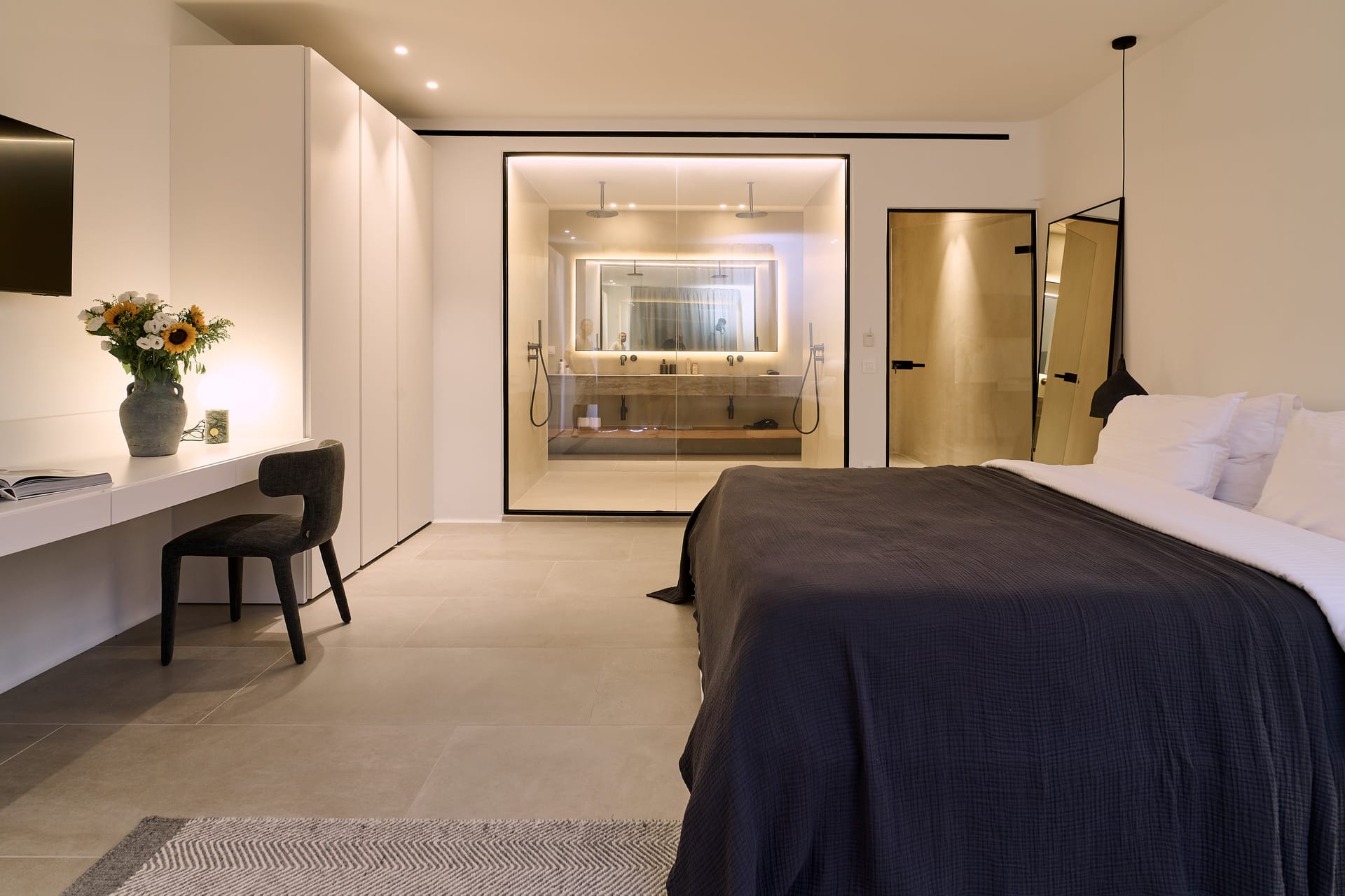 Dine al fresco on the villa's terrace, where a bespoke outdoor dining area overlooks the sparkling sea, providing an enchanting backdrop for gourmet meals prepared in the fully-equipped, chef-inspired kitchen. As the sun sets over the Aegean, the villa's outdoor lounge areas become an idyllic setting for cocktails and conversation.