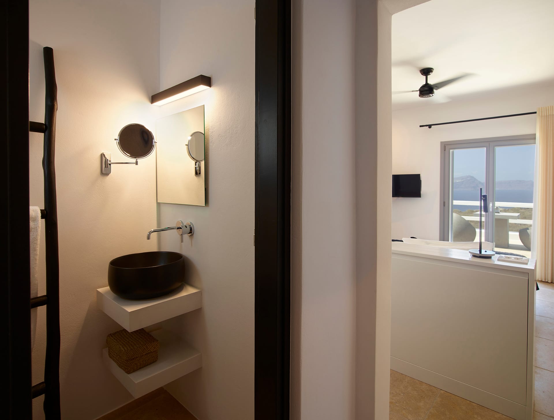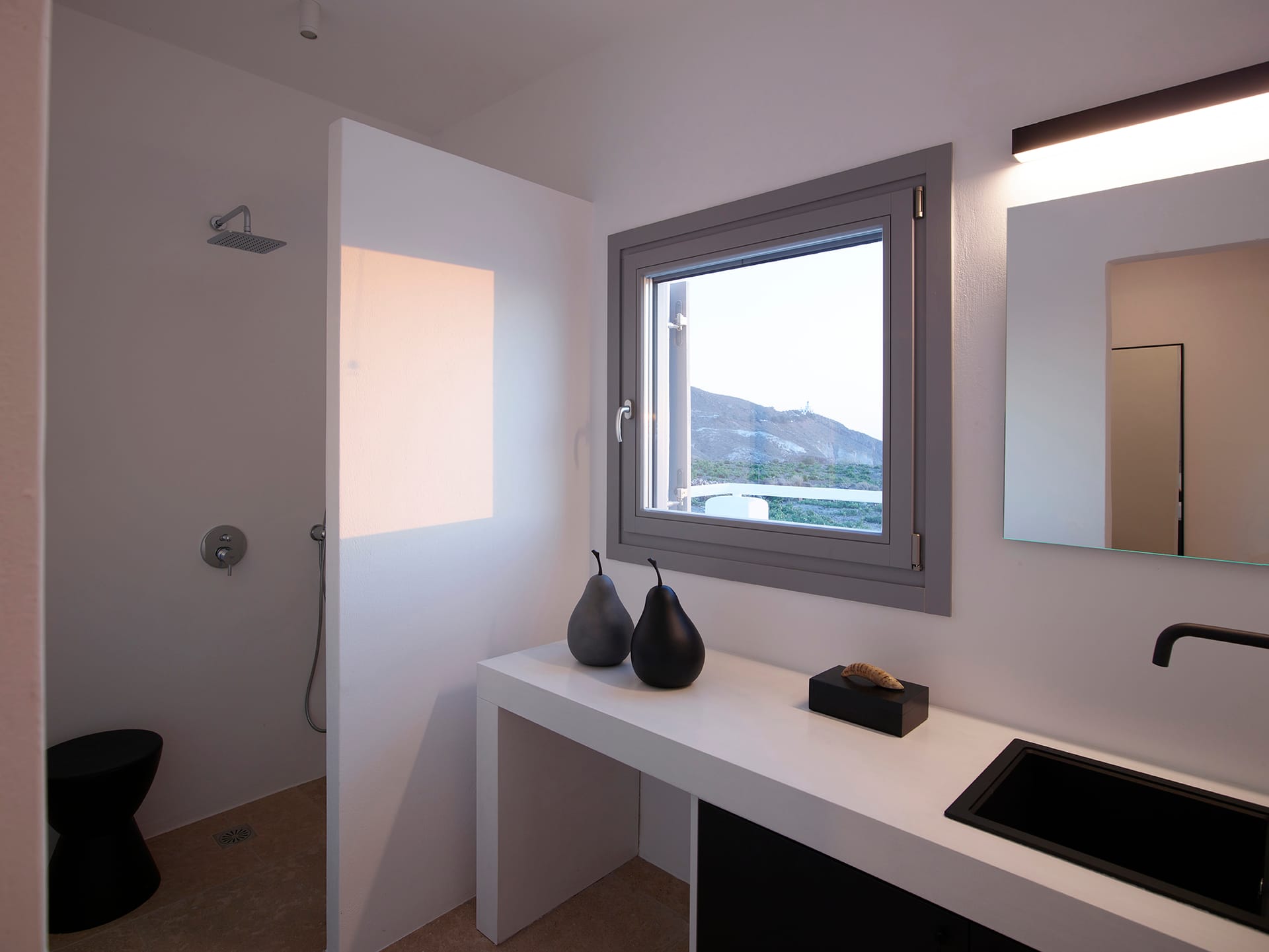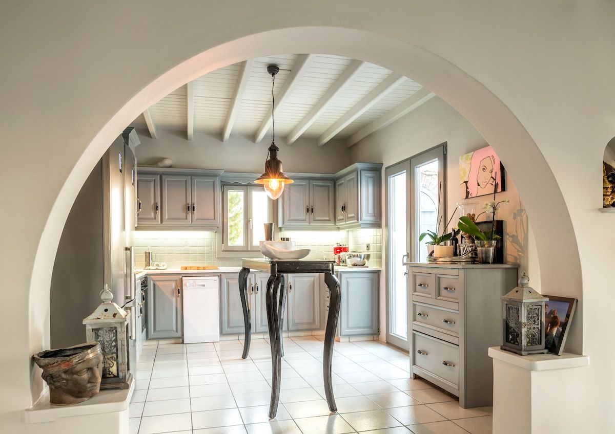 Wide terraces encircle the villa, step inside to a cool blend of soft pearly grey decor, pastel leather sofas, contemporary furnishings complementing the tiled and polished cement floors and wooden furniture, the art is a tasteful blend of works by local artists, block colours or black and white photographs. The villa is perfect for groups of friends or a large family, all rooms are fully accessible from within the villa without the need to access any rooms from outside unlike many other villas.