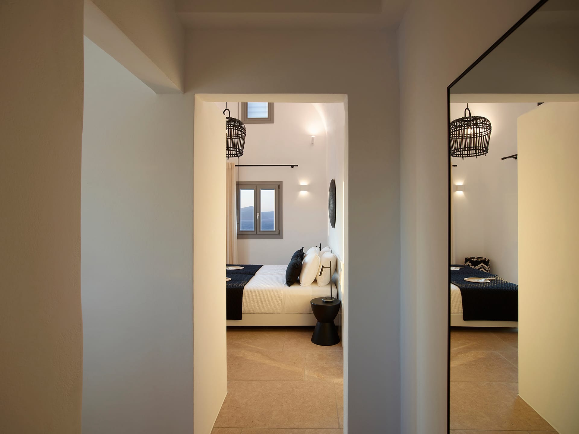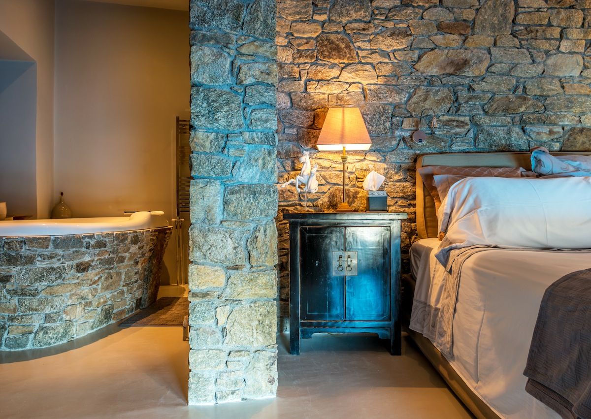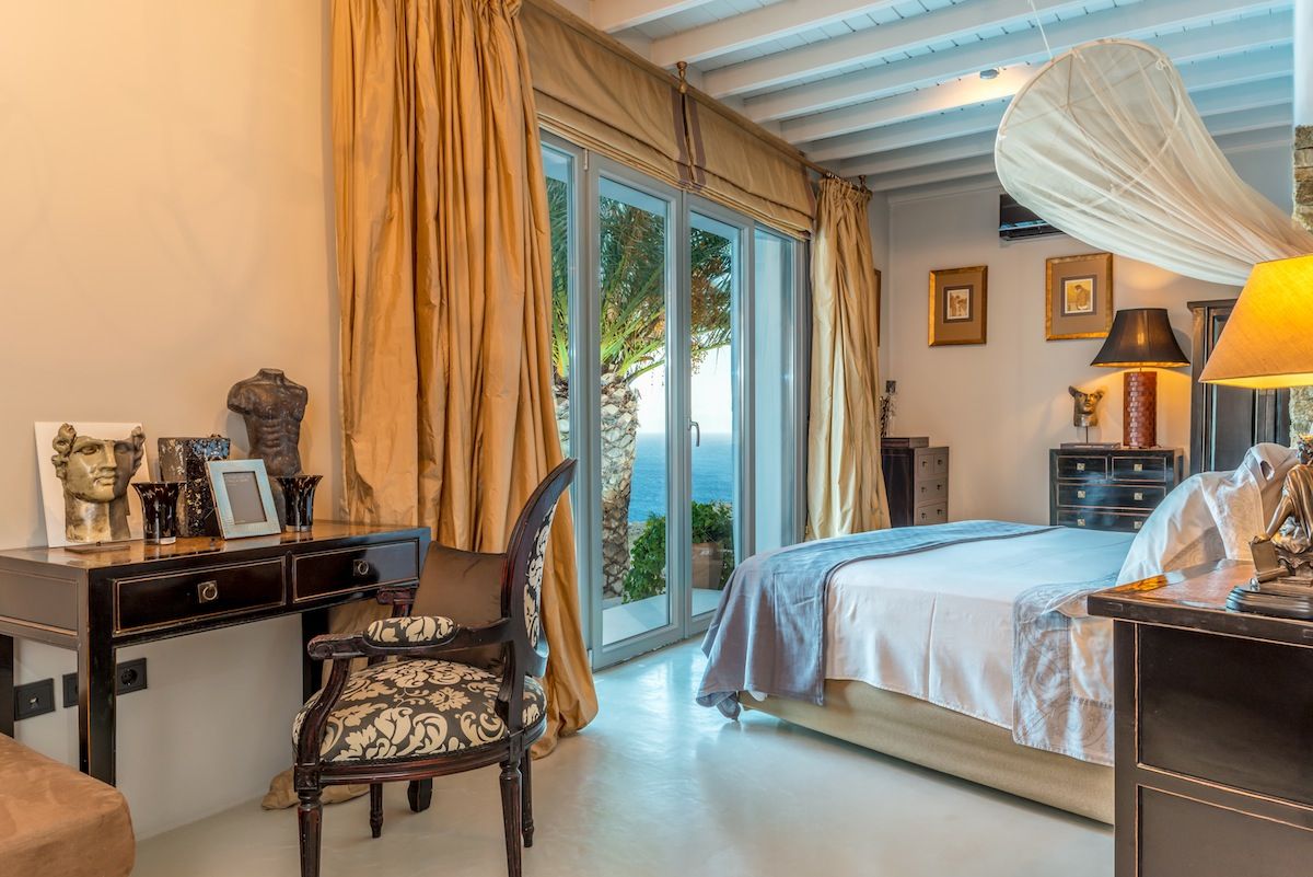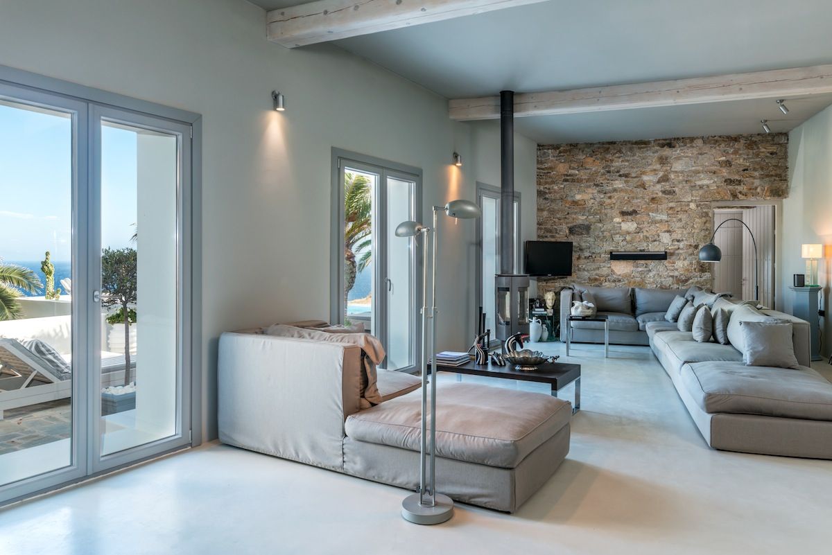 One of the most luxurious and private villa rentals in Mykonos, Greece. Elegantly split level, and predominantly arranged over two floors, the villa is airy and light with large windows and glazed double doors opening onto covered and uncovered terraces all of which interconnect, giving a combination of privacy and accessibility. Cool colored walls and floors add to this, and the pastel contemporary furnishings blend beautifully, as do the contemporary mixture of lamps in leathers, glass and ceramics. It’s a palette of dreamy Mediterranean colours.