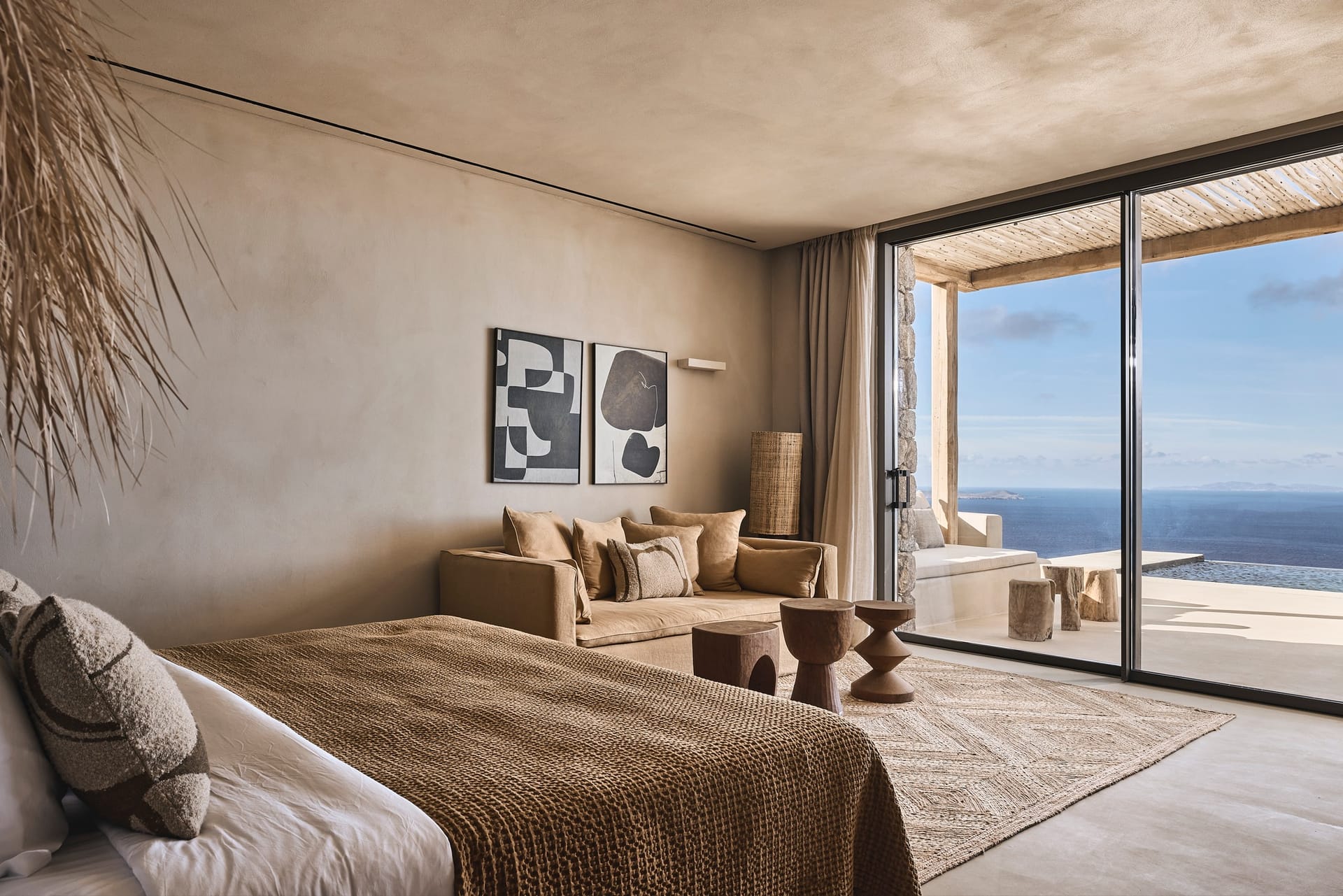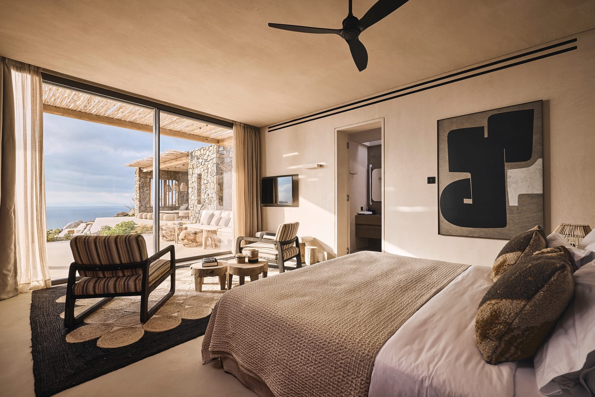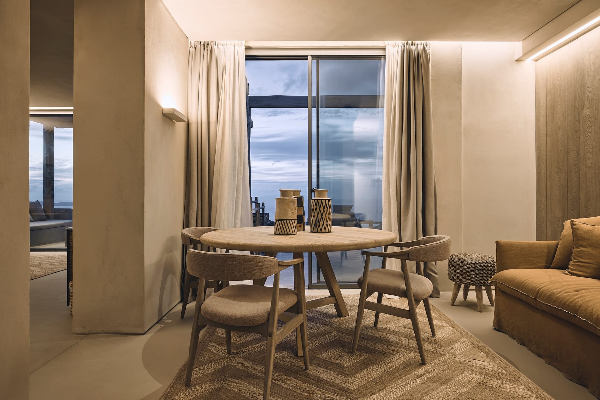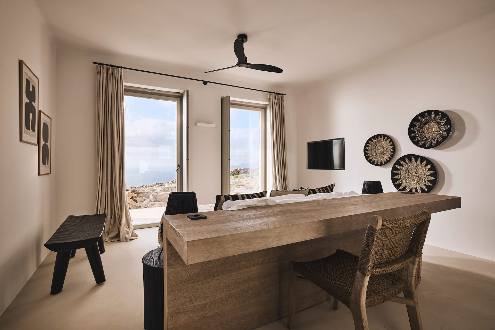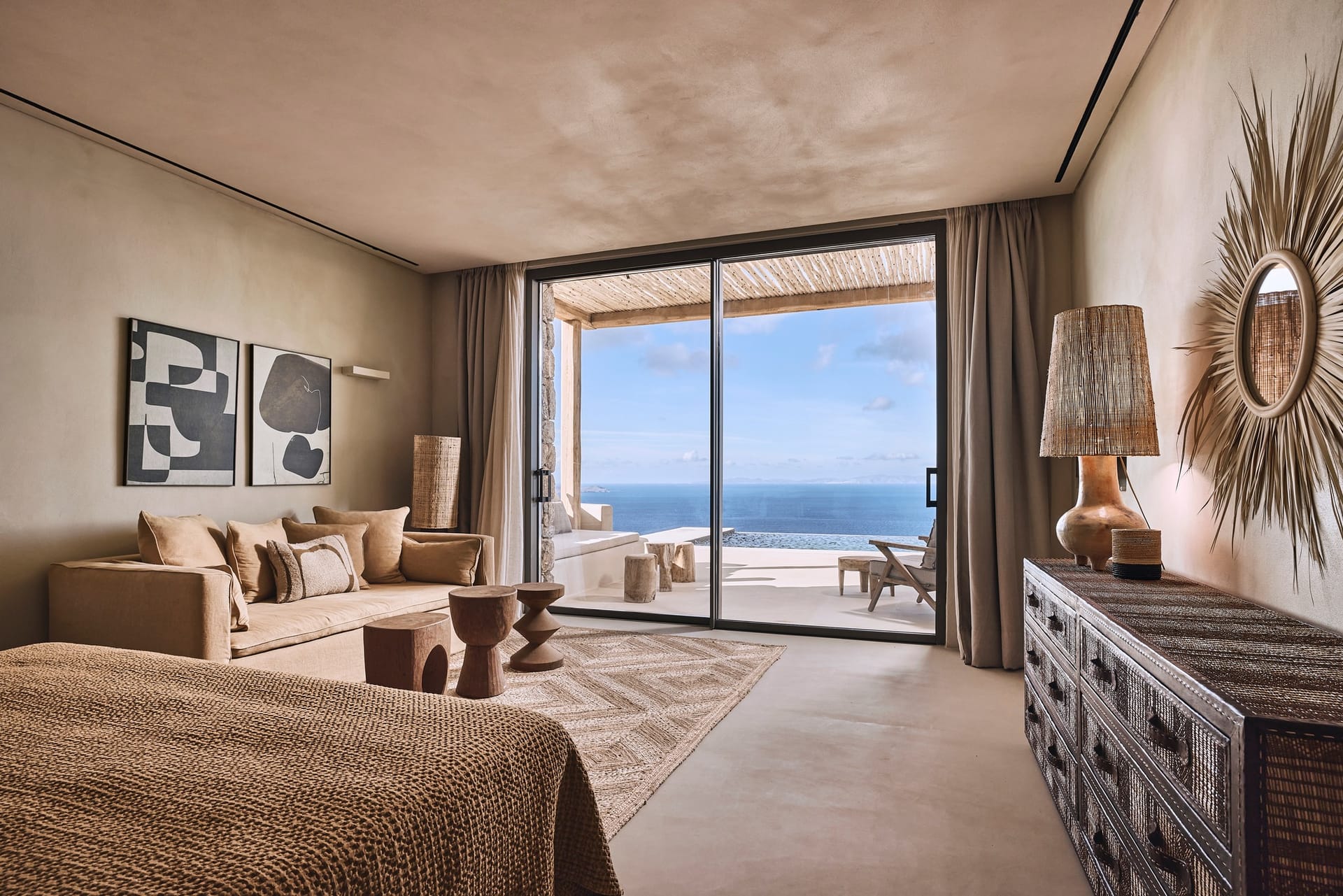 - 1 master suite (84 m2) with lounge/workspace area, en-suite bathroom with shower, safe room, kingsize bed, mini bar, safe box, flat Smart TV, type-C fast charge ports, outdoor lounge, direct access tothe main pool area, unobstructed sea and sunset views.
