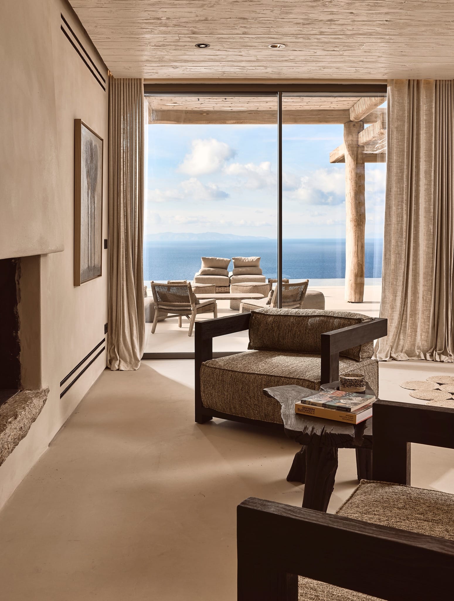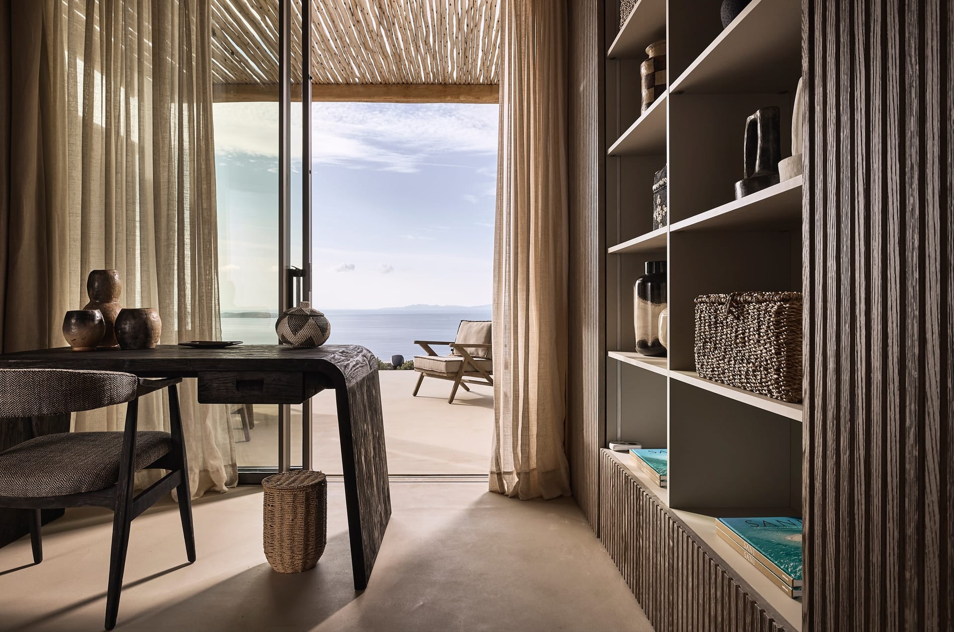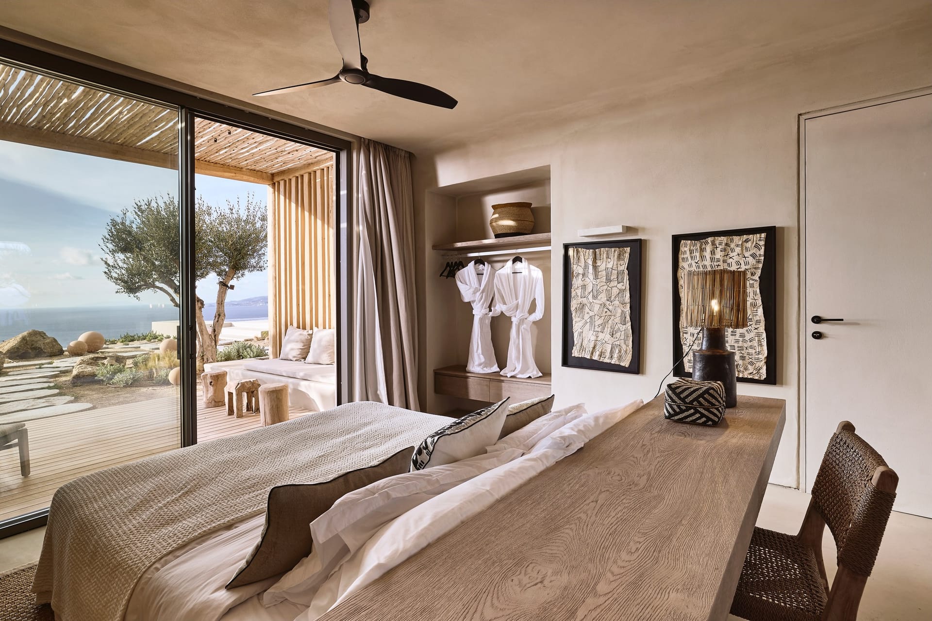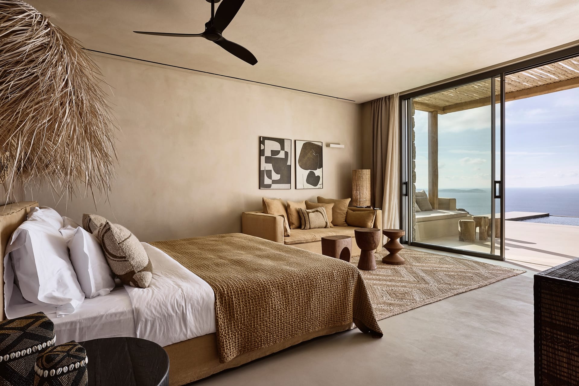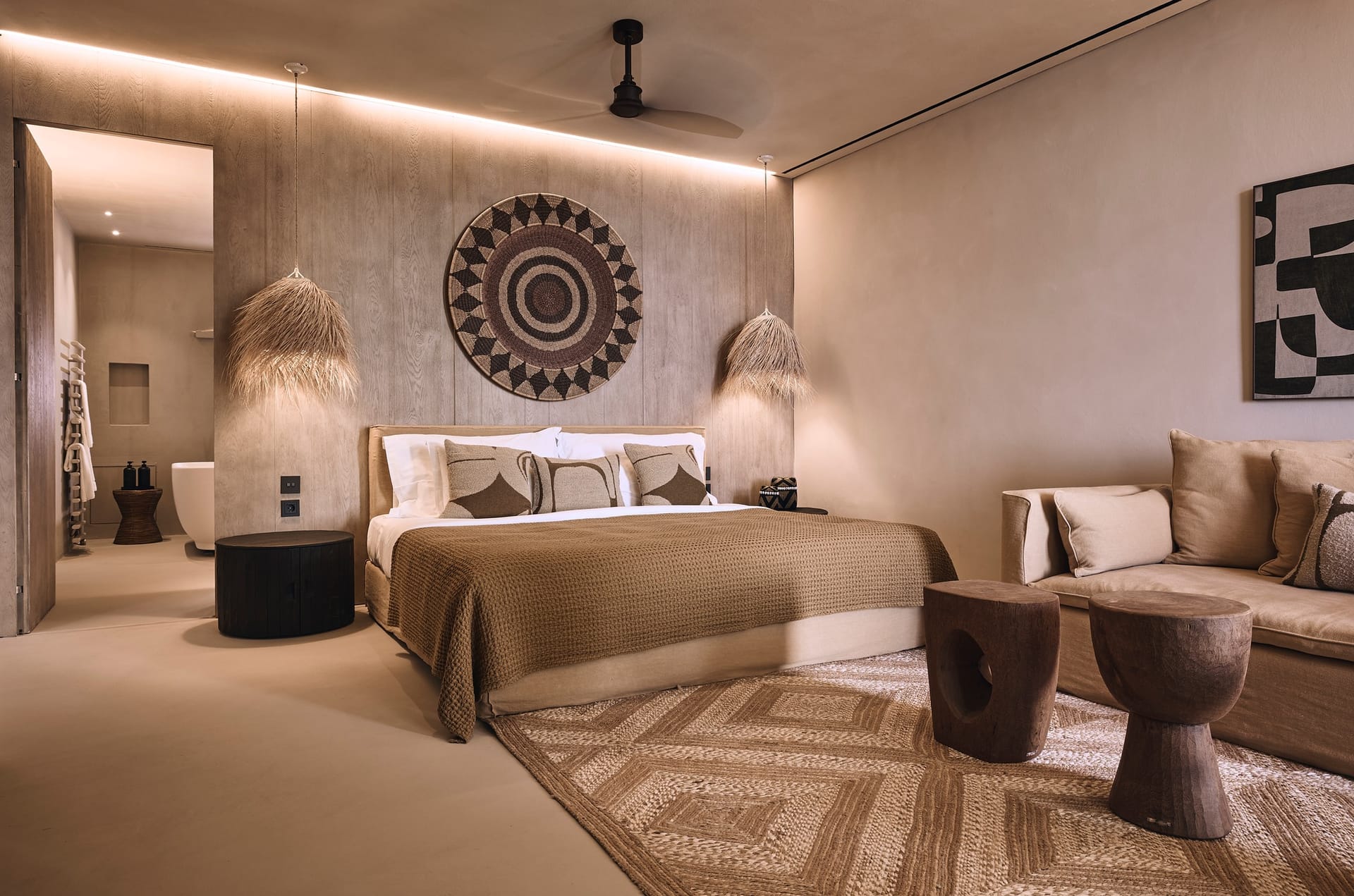 - 1 master suite (84 m2) with lounge/workspace area, en-suite bathroom with shower, safe room, kingsize bed, mini bar, safe box, flat Smart TV, type-C fast charge ports, outdoor lounge, direct access tothe main pool area, unobstructed sea and sunset views.