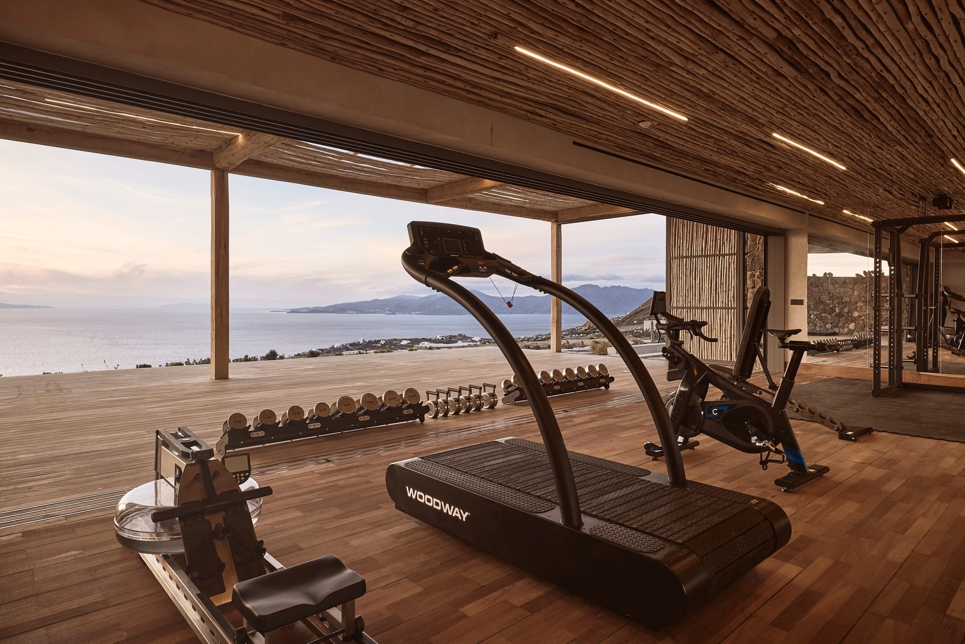 - Wellness: gym with sea and sunset view (equipped with treadmill, speedbike, row machine,workout bench, workout frame, TRX, dumbbells, kettlebells, exercise mats), minibar, WC andmassage room