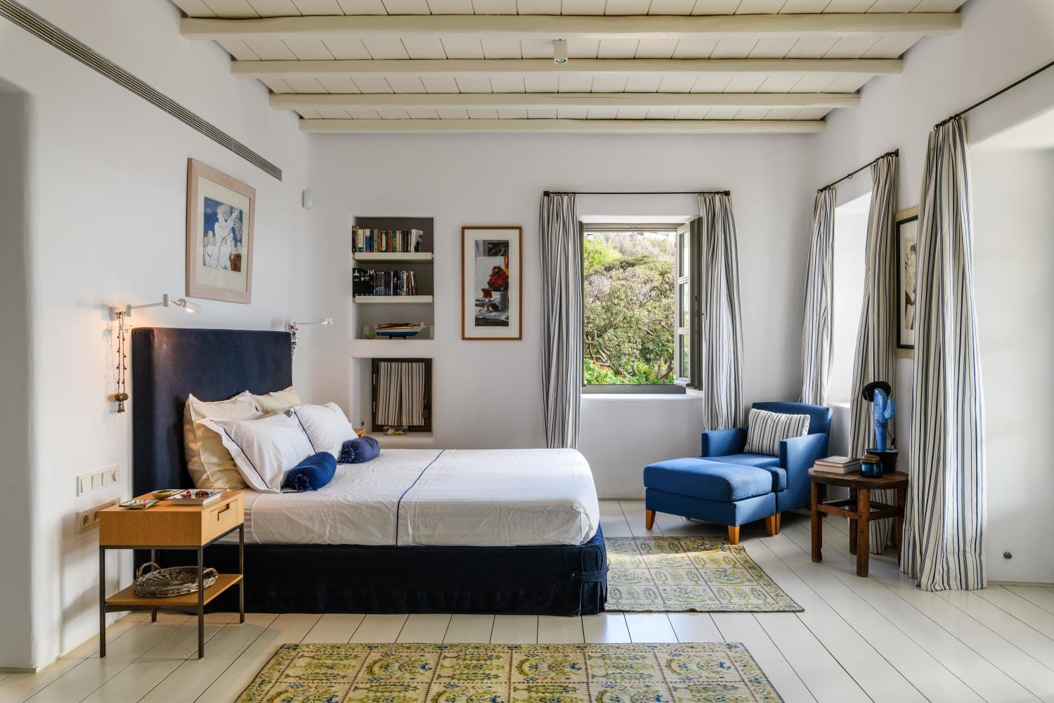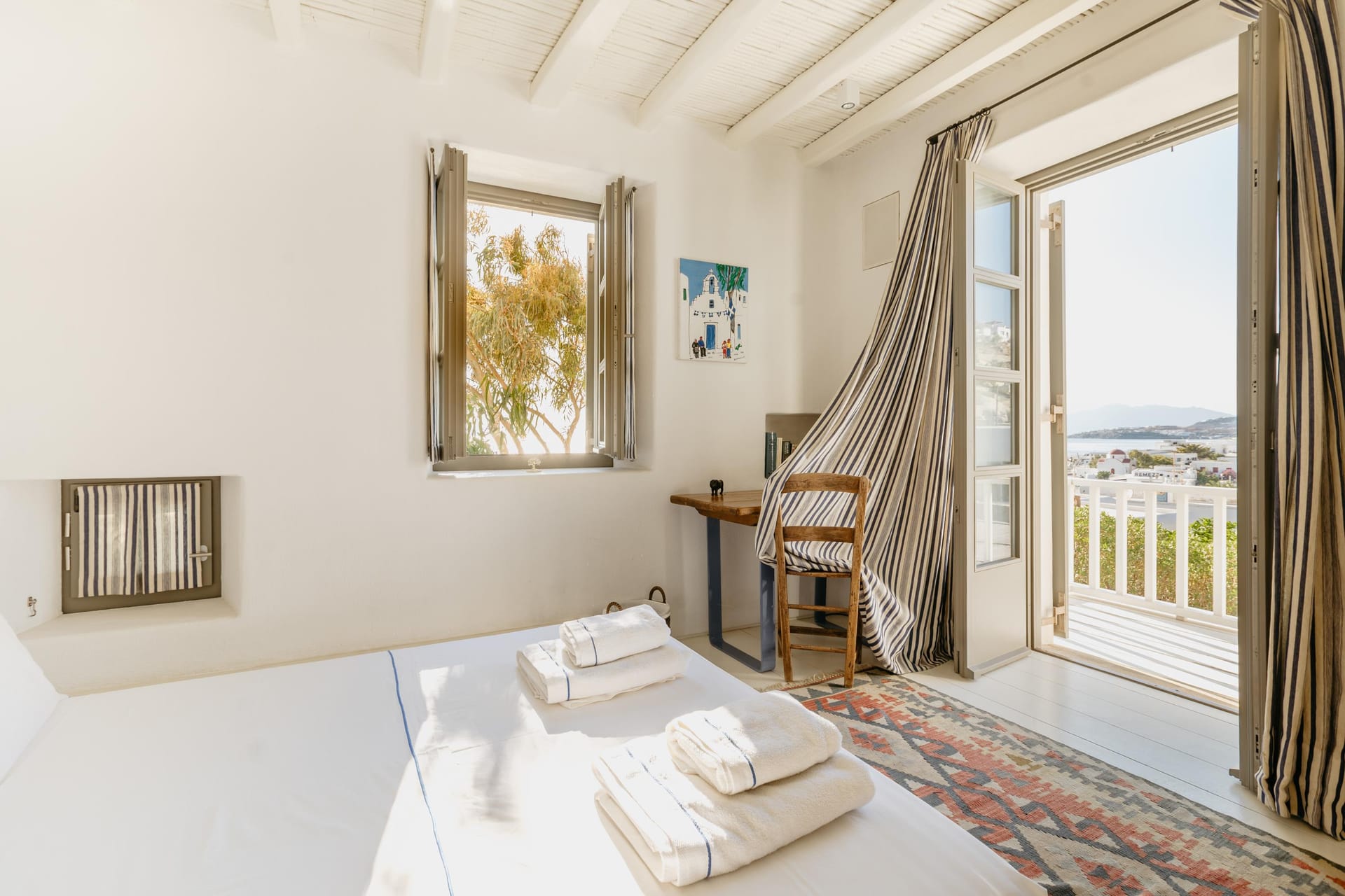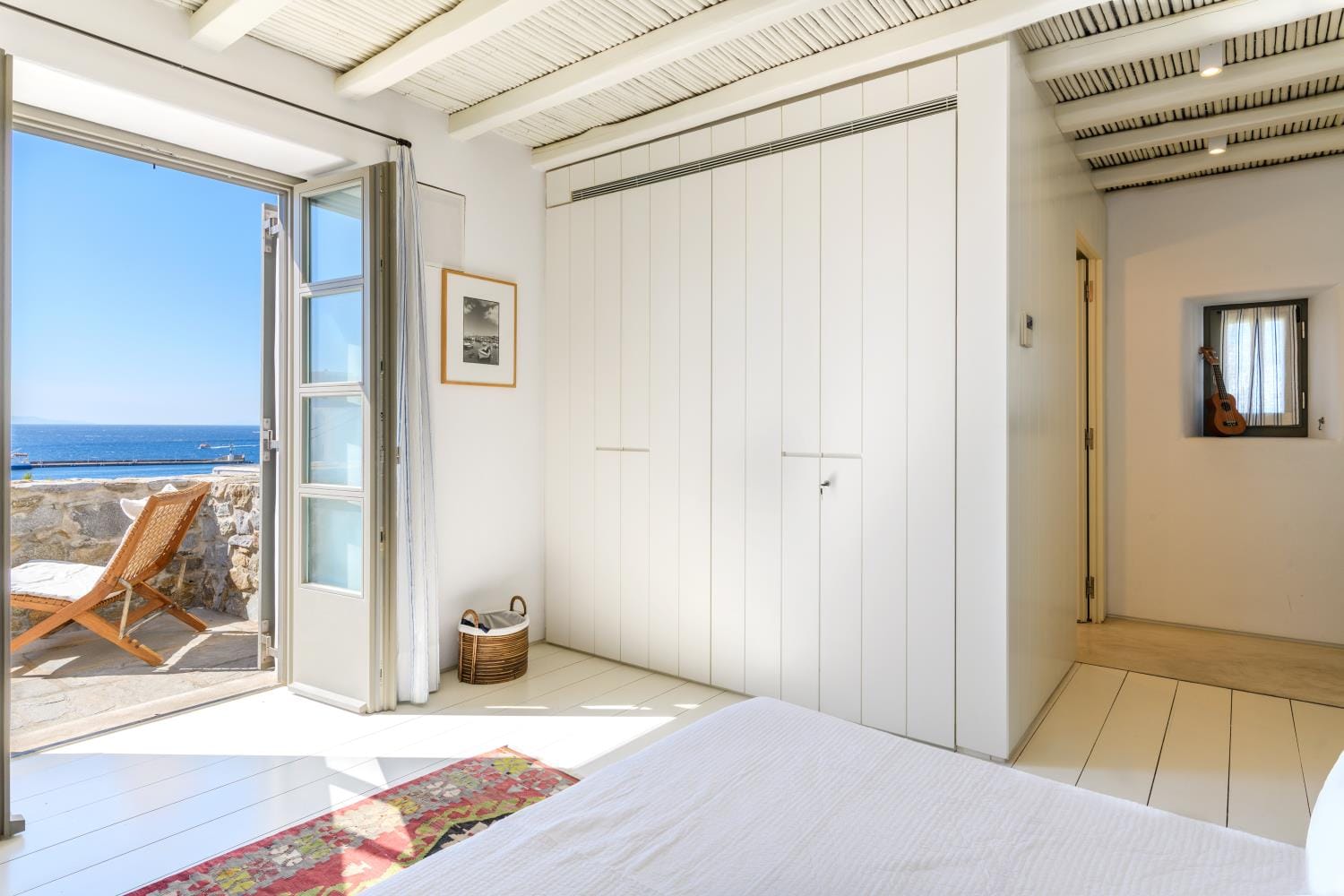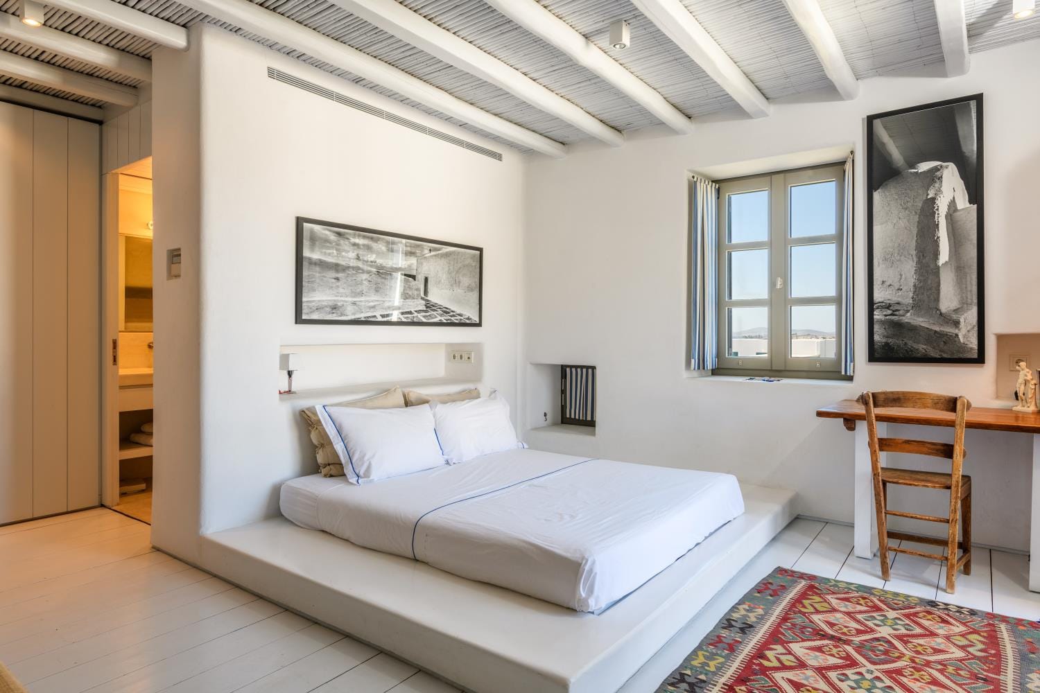- Master bedroom: 42m2 with direct sea viewsunset view and view to Mykonos Town. 1 balcony. King size bed. The room has 2 bathrooms, one for him and one for her and it is equipped with a working desk, safe box, hairdryer, A/C, bathroom amenities and towels.
