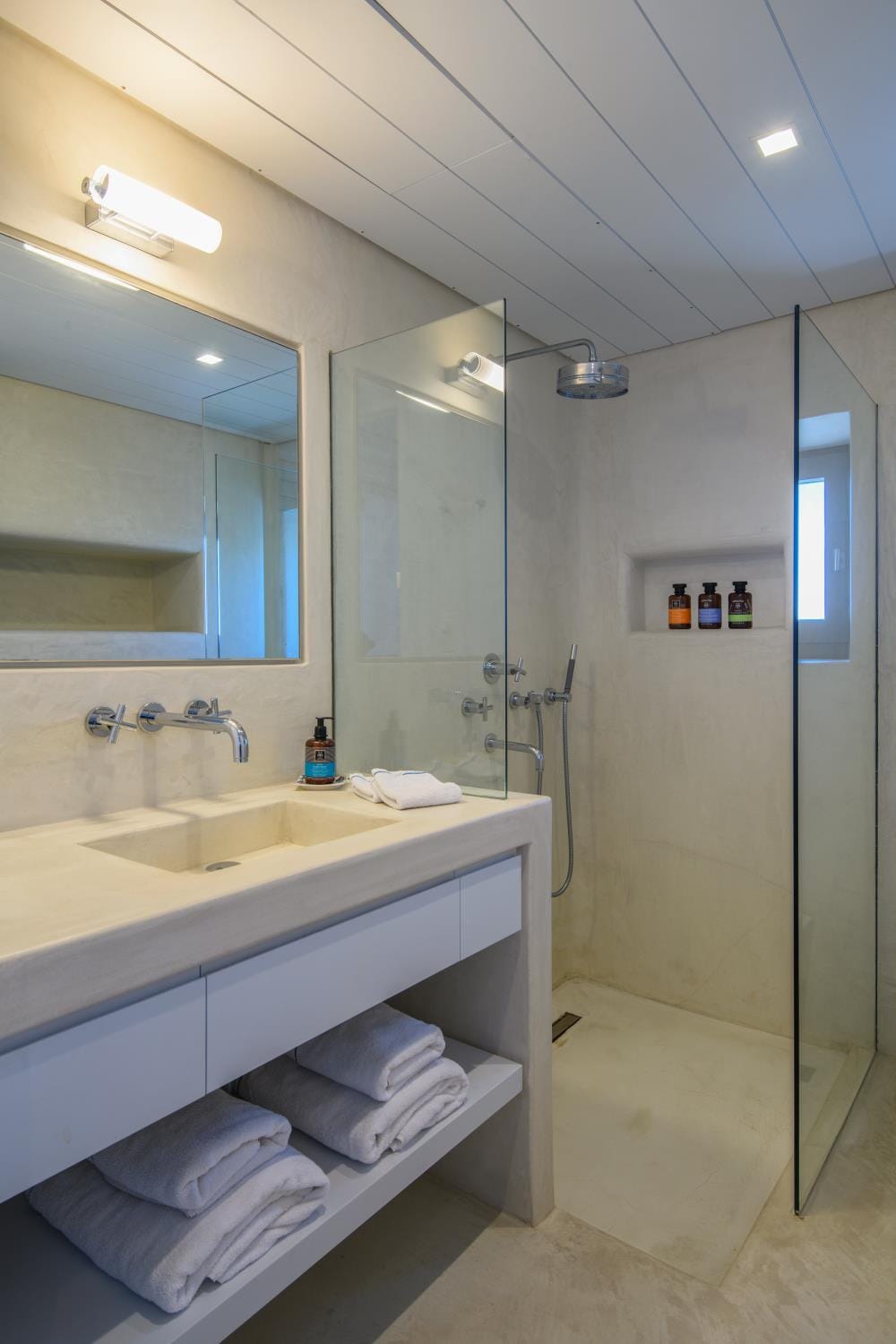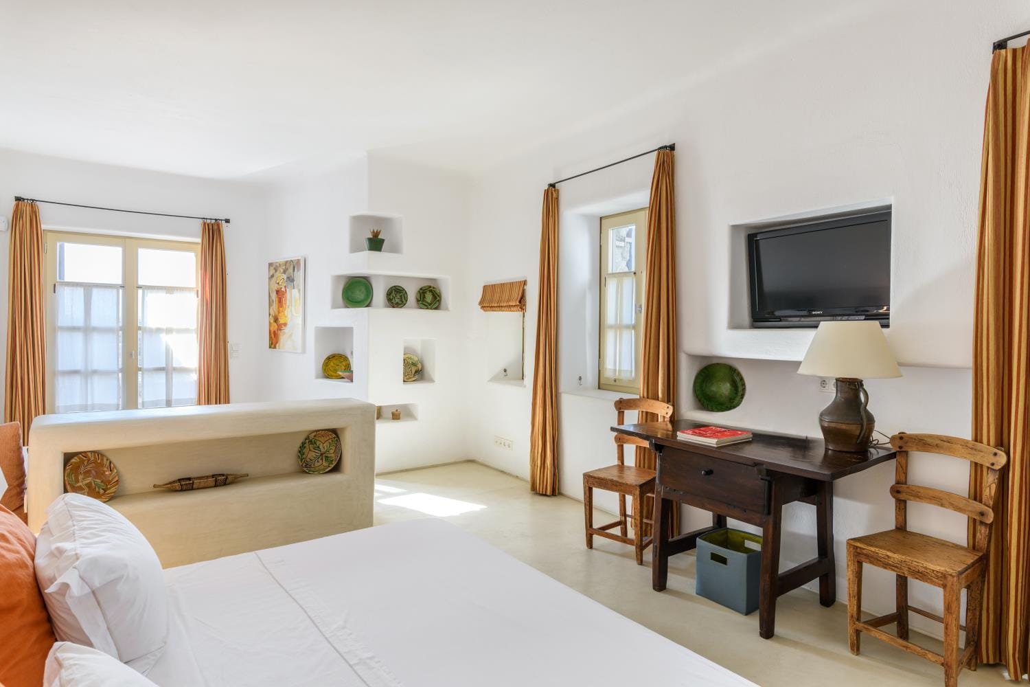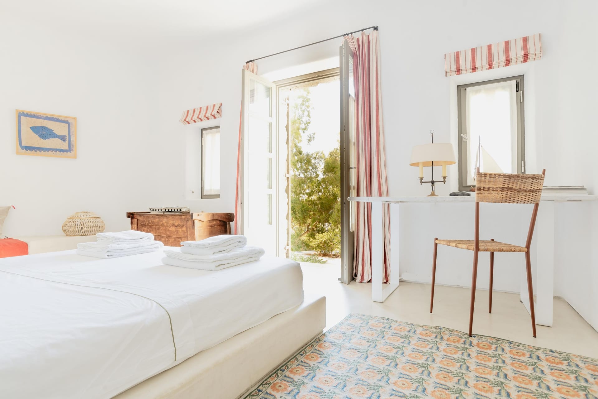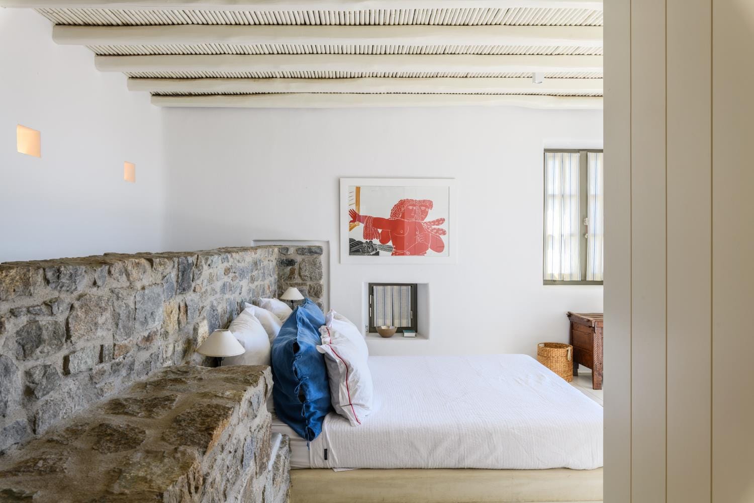 - Master bedroom: 42m2 with direct sea viewsunset view and view to Mykonos Town. 1 balcony. King size bed. The room has 2 bathrooms, one for him and one for her and it is equipped with a working desk, safe box, hairdryer, A/C, bathroom amenities and towels.