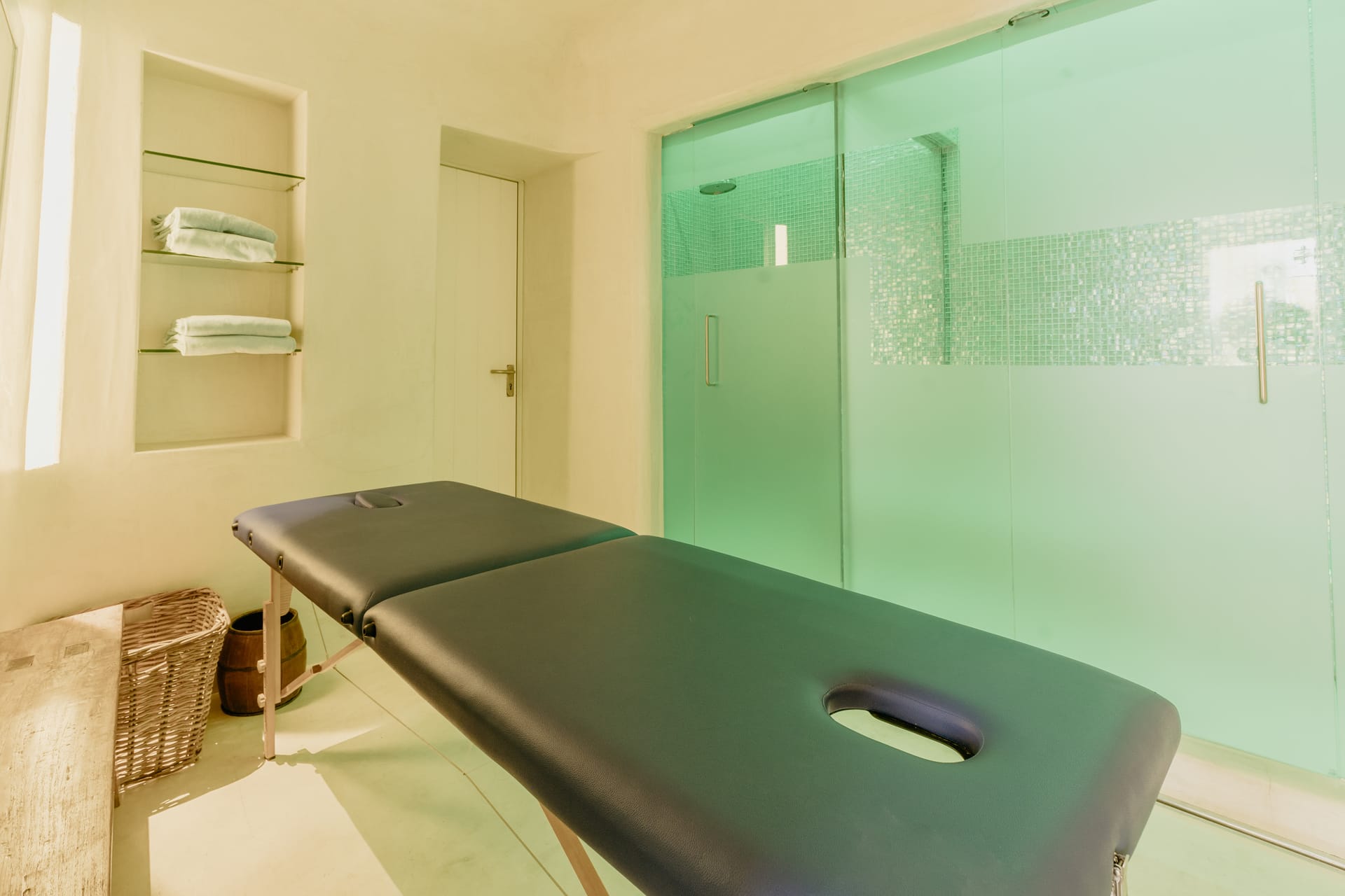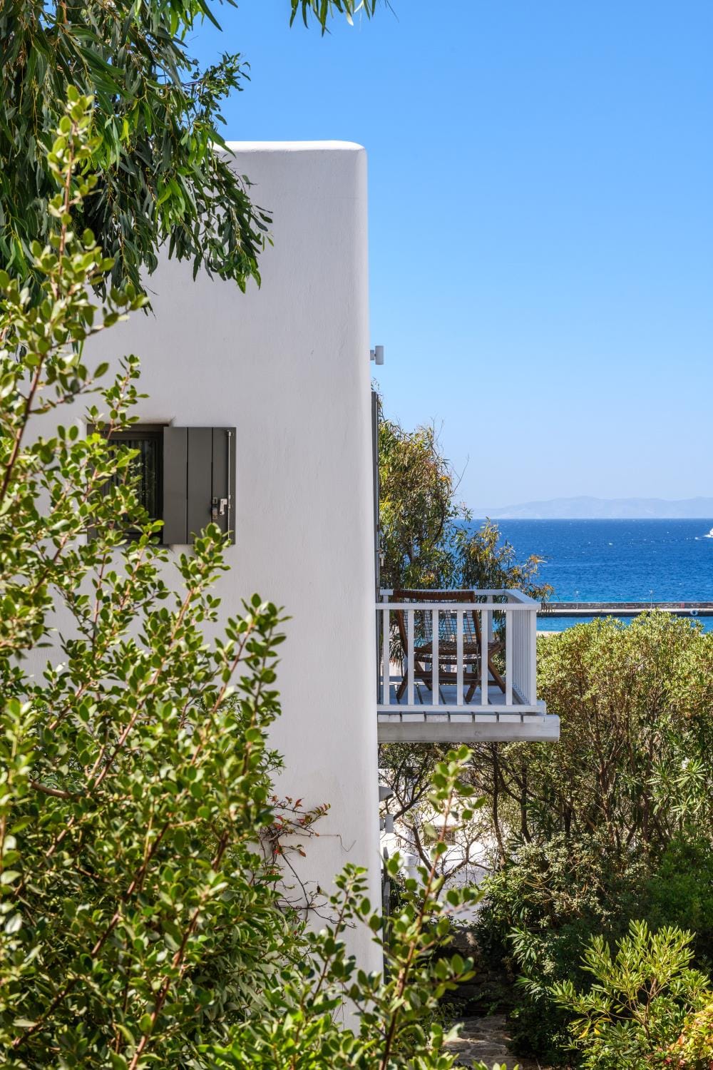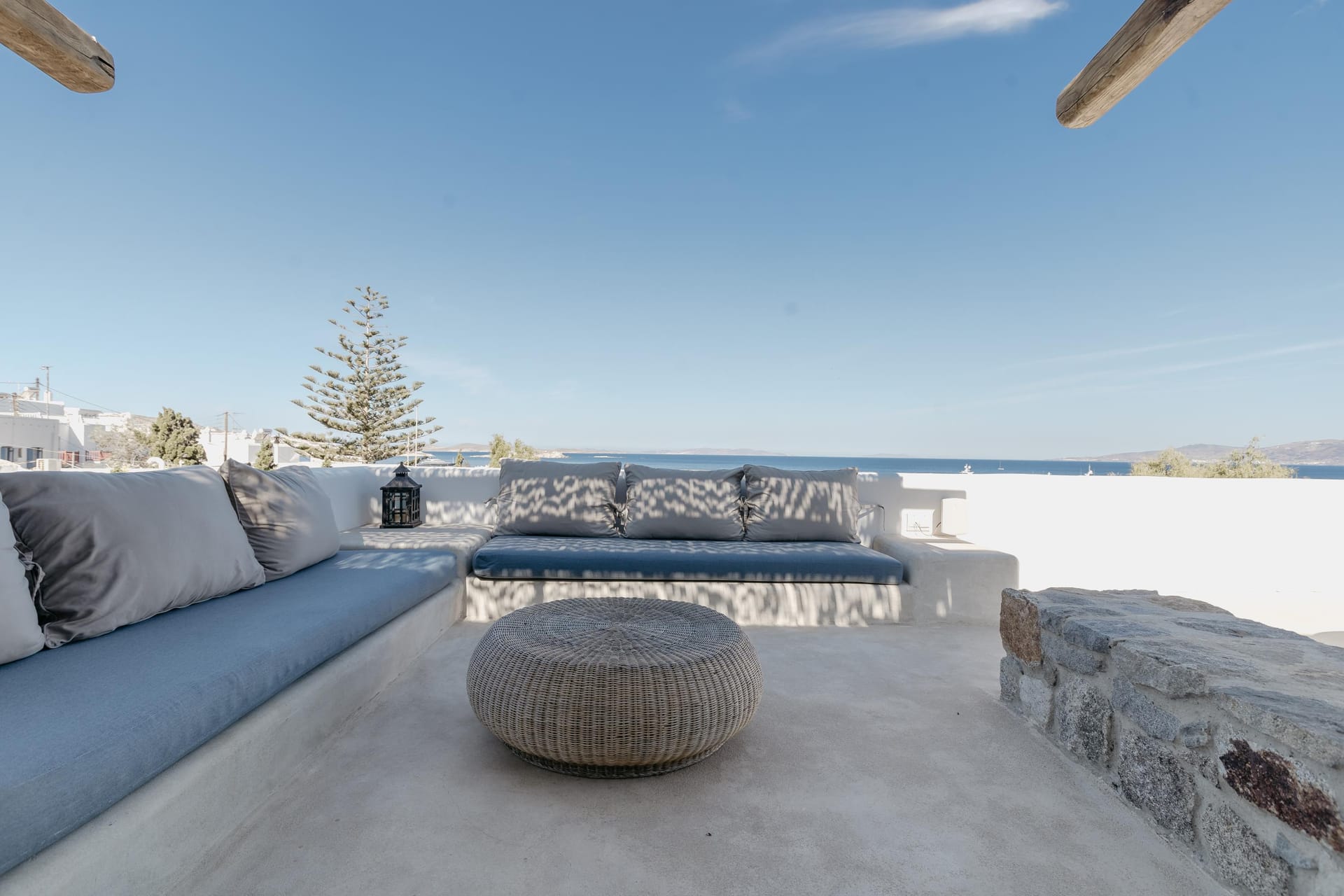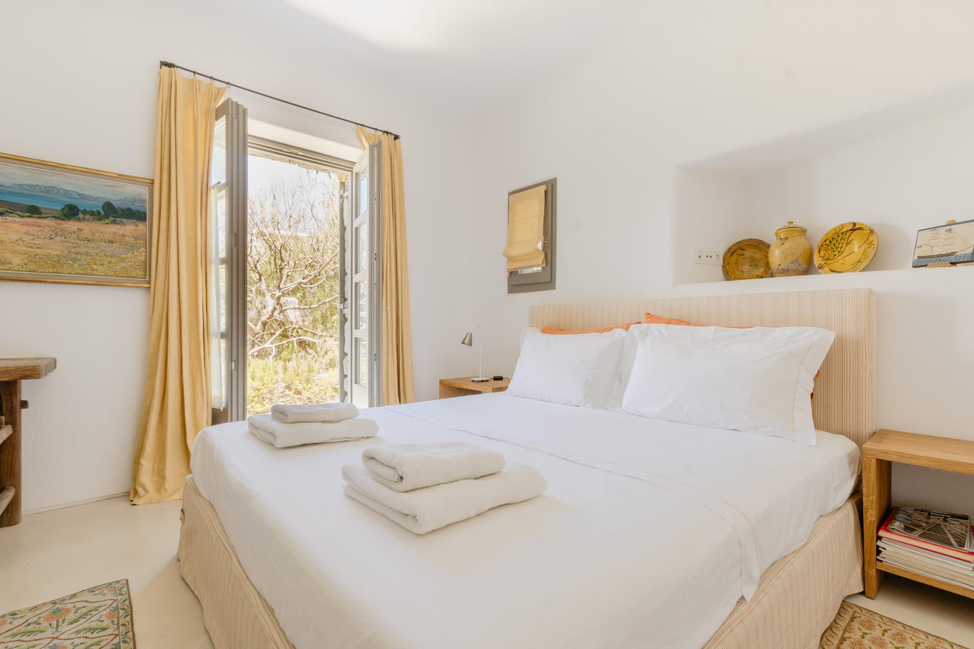 - Master bedroom: 42m2 with direct sea viewsunset view and view to Mykonos Town. 1 balcony. King size bed. The room has 2 bathrooms, one for him and one for her and it is equipped with a working desk, safe box, hairdryer, A/C, bathroom amenities and towels.