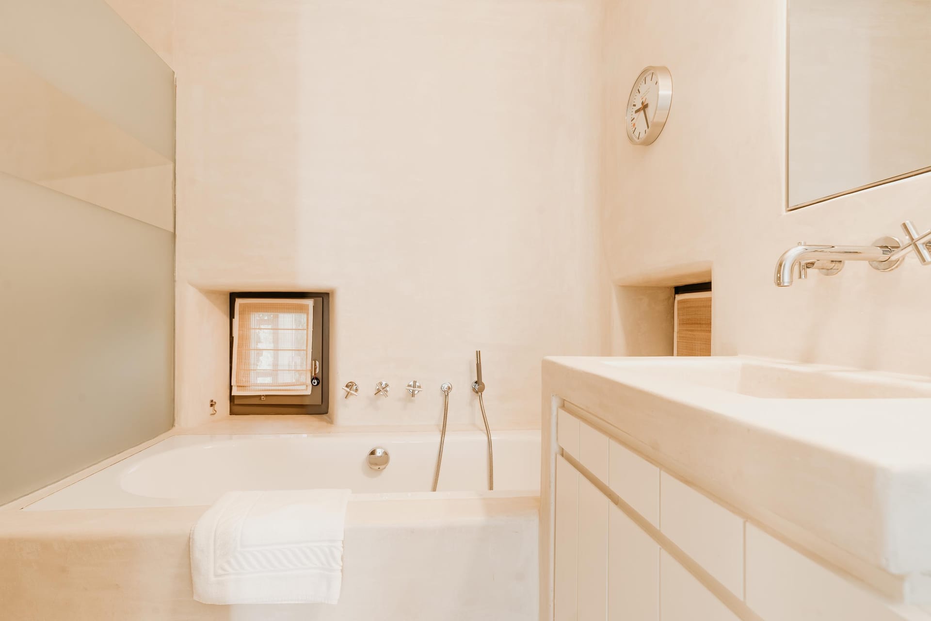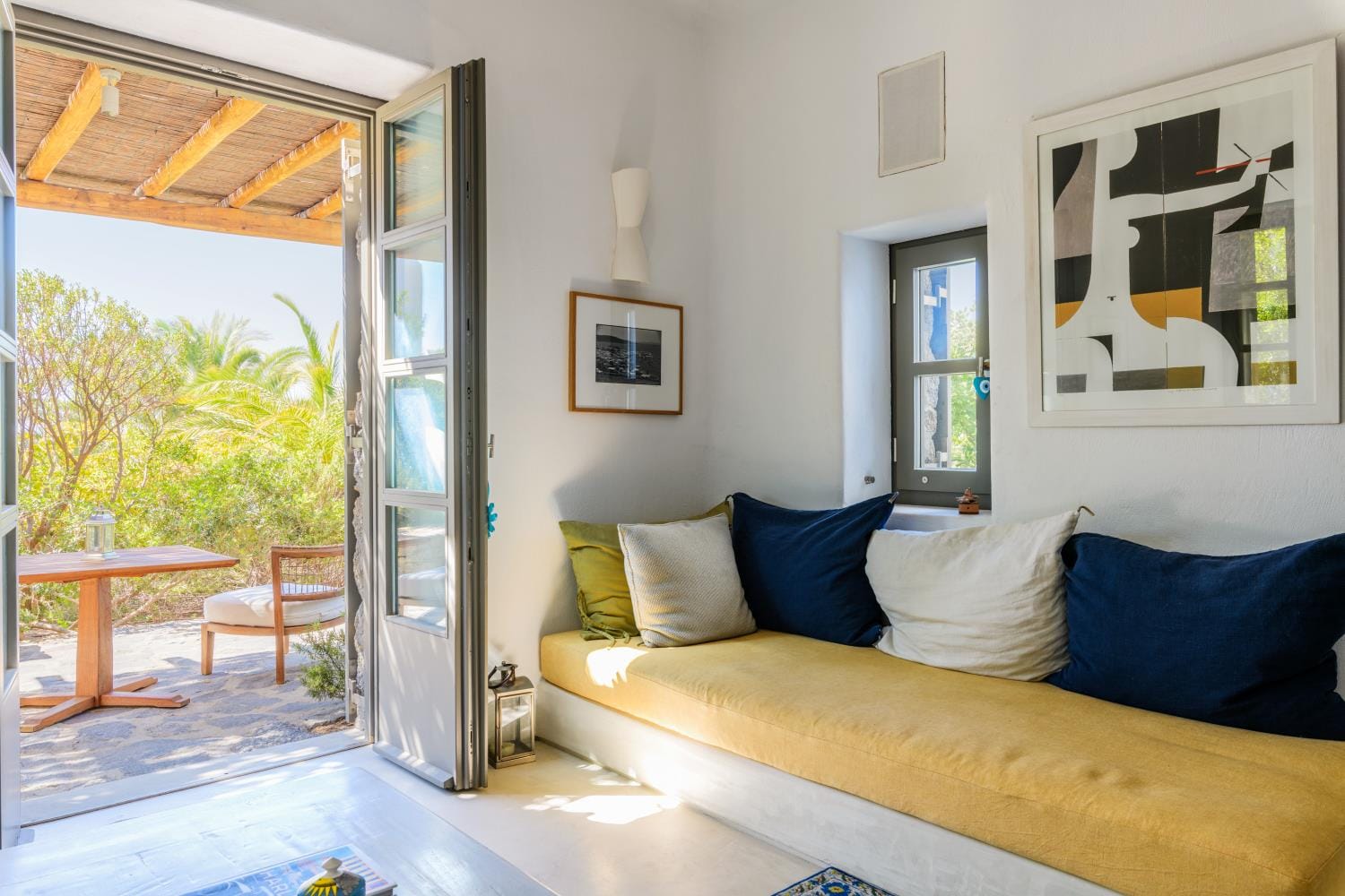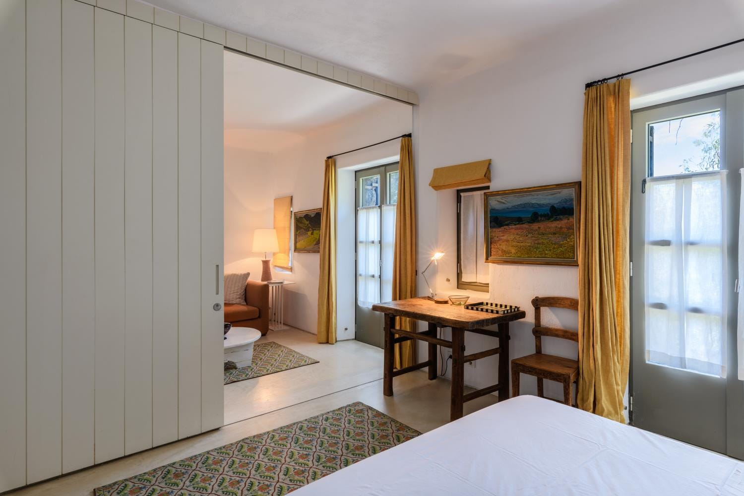 - Room 1: 38m2, 1 open patio with access to pool area through the small path. king size bed. The room has two bathrooms and a small living area and a small working desk, while there is an intermediate door which can isolate the bedroom from the living area. It is equipped with a safe box, hairdryer, A/C, bathroom amenities and towels.