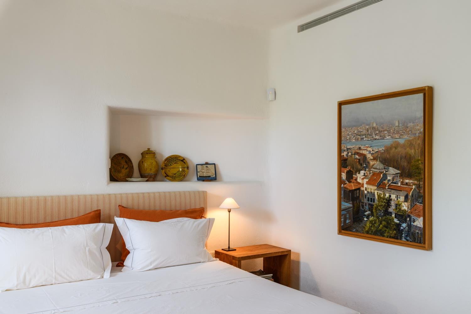 Maisonnette 1 Upper floor: Master bedroom 42m2 with direct sunset & sea view. 1 Balcony. Queen size bed. The room is equipped with a safe box, hairdryer, A/C, bathroom amenities and towels.