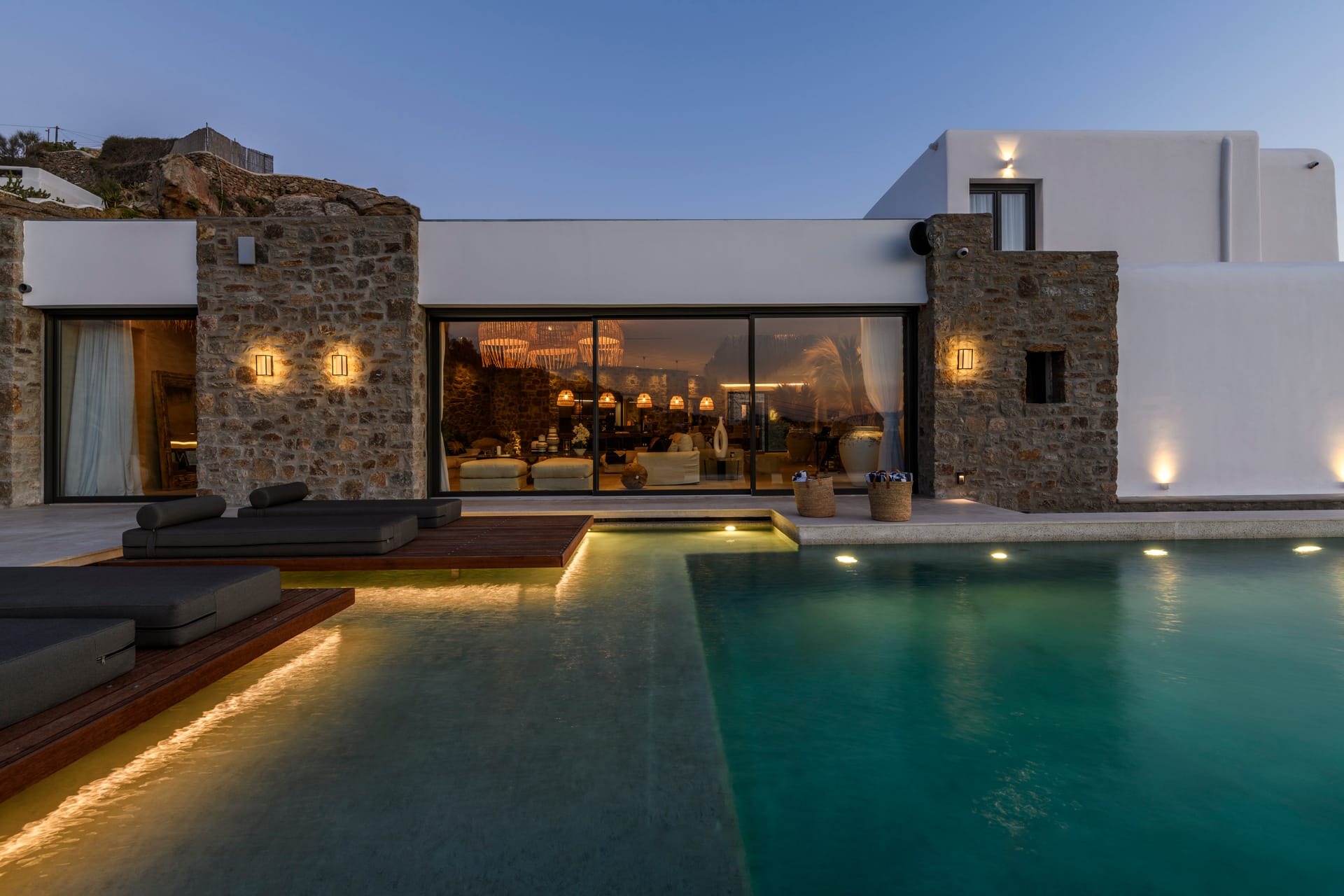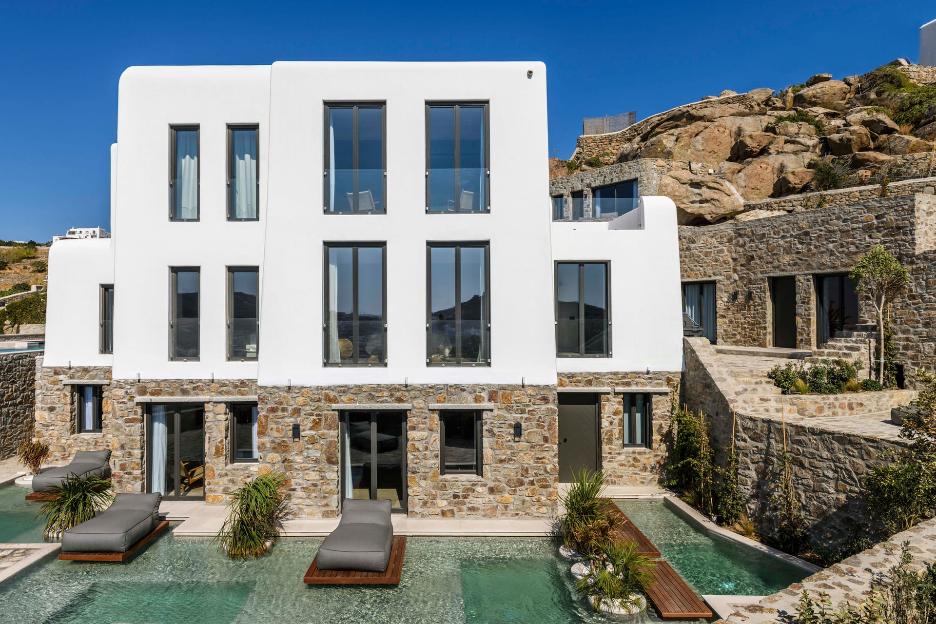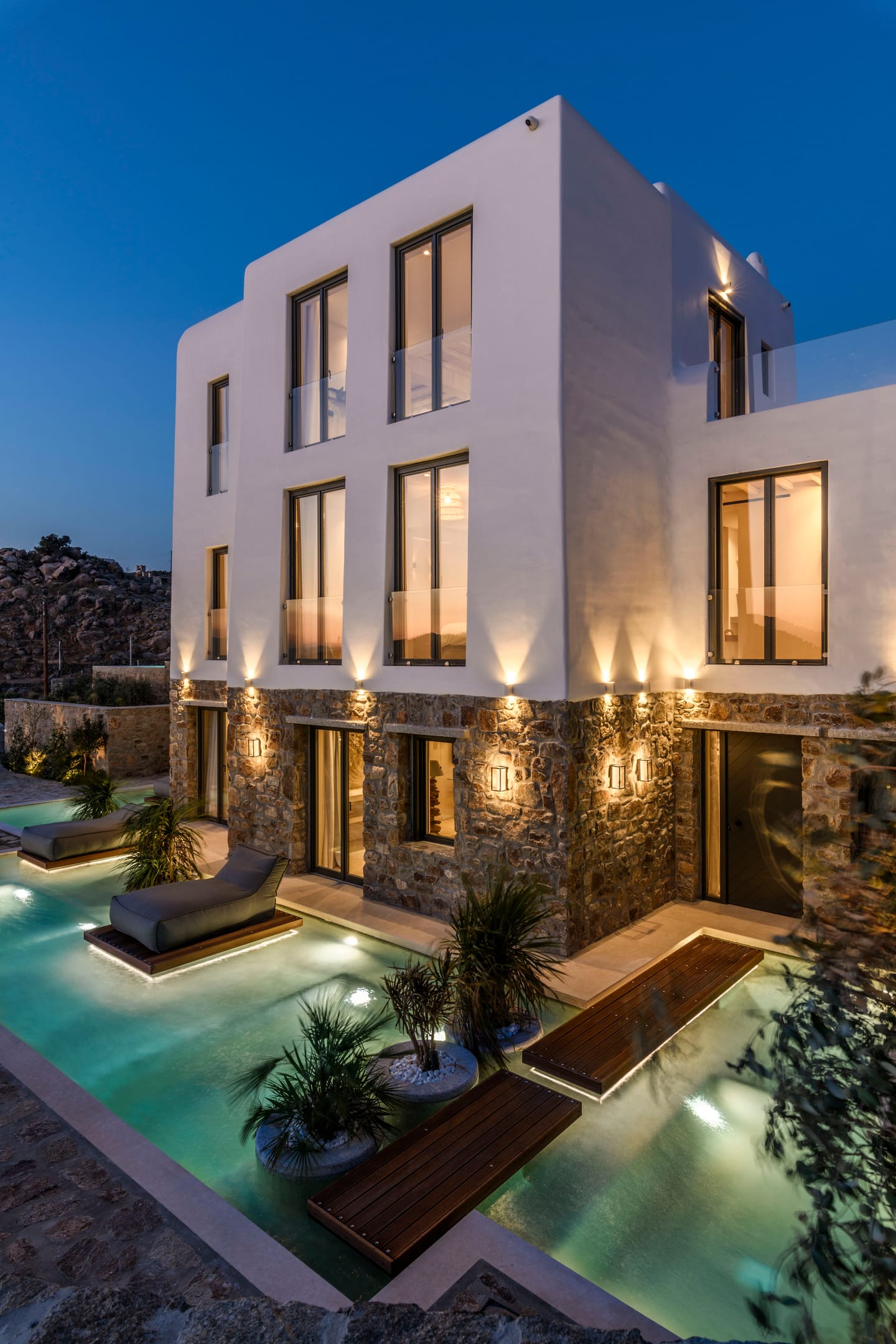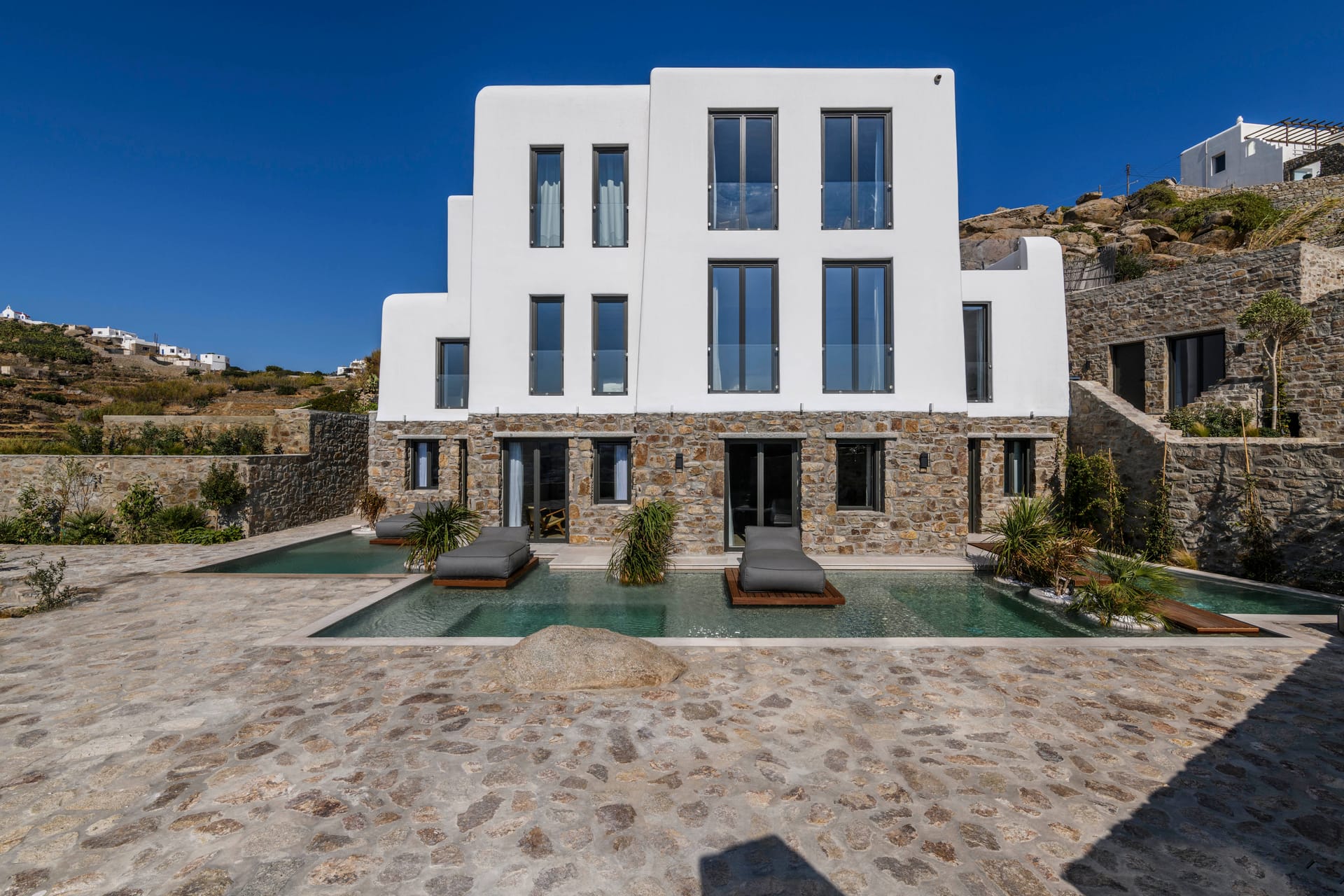 Villa Muse is A brand new high- end property, built on a 2500sq m plot. It features 9 master bedrooms on three different levels. The villa is a piece of jewel in a perfect location, offering unobstructed sea views to the Aegean Sea and the surrounding Islands. Also, this stylish and modern Villa is located next to the cosmopolitan Ornos Beach and Mykonos Town.
