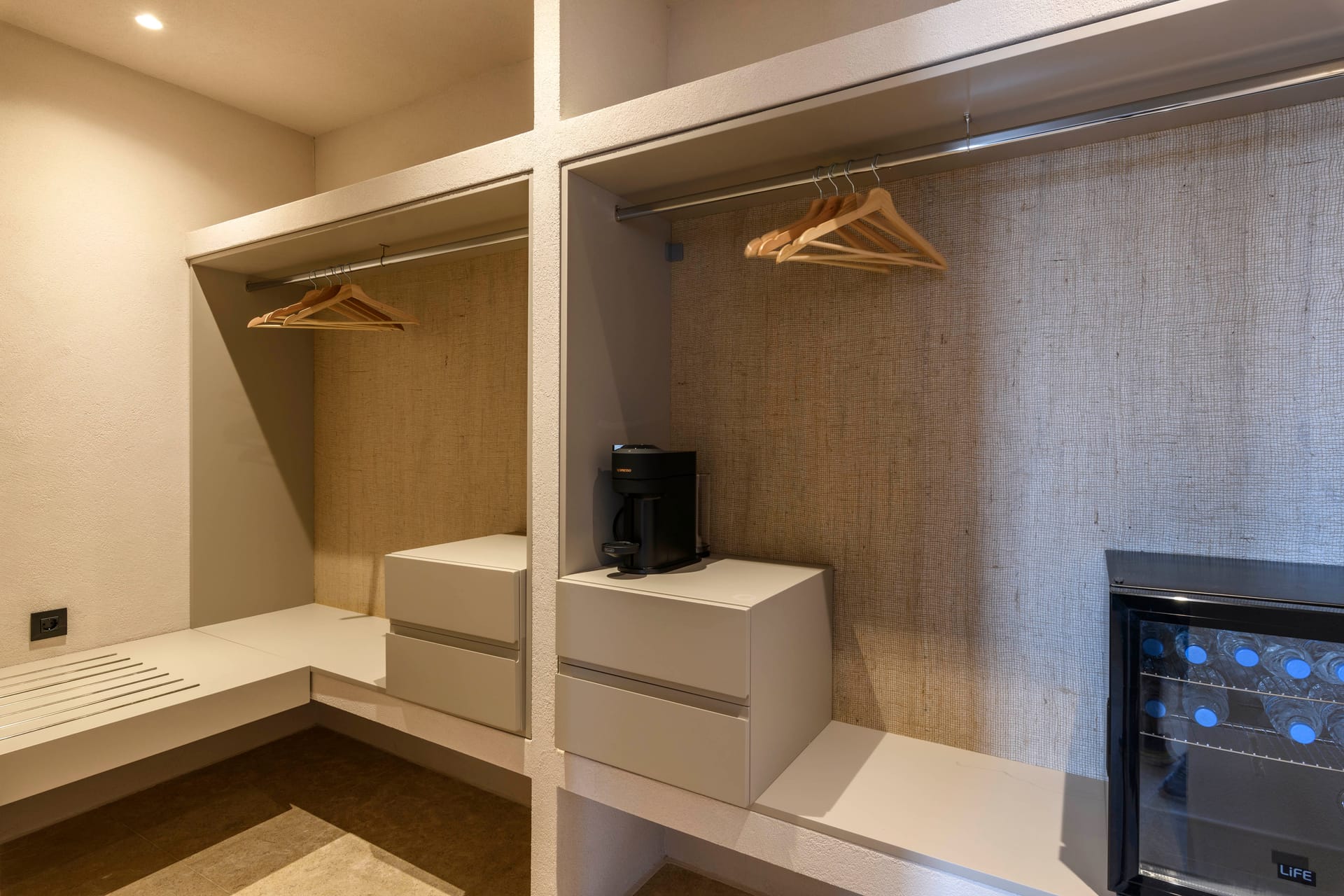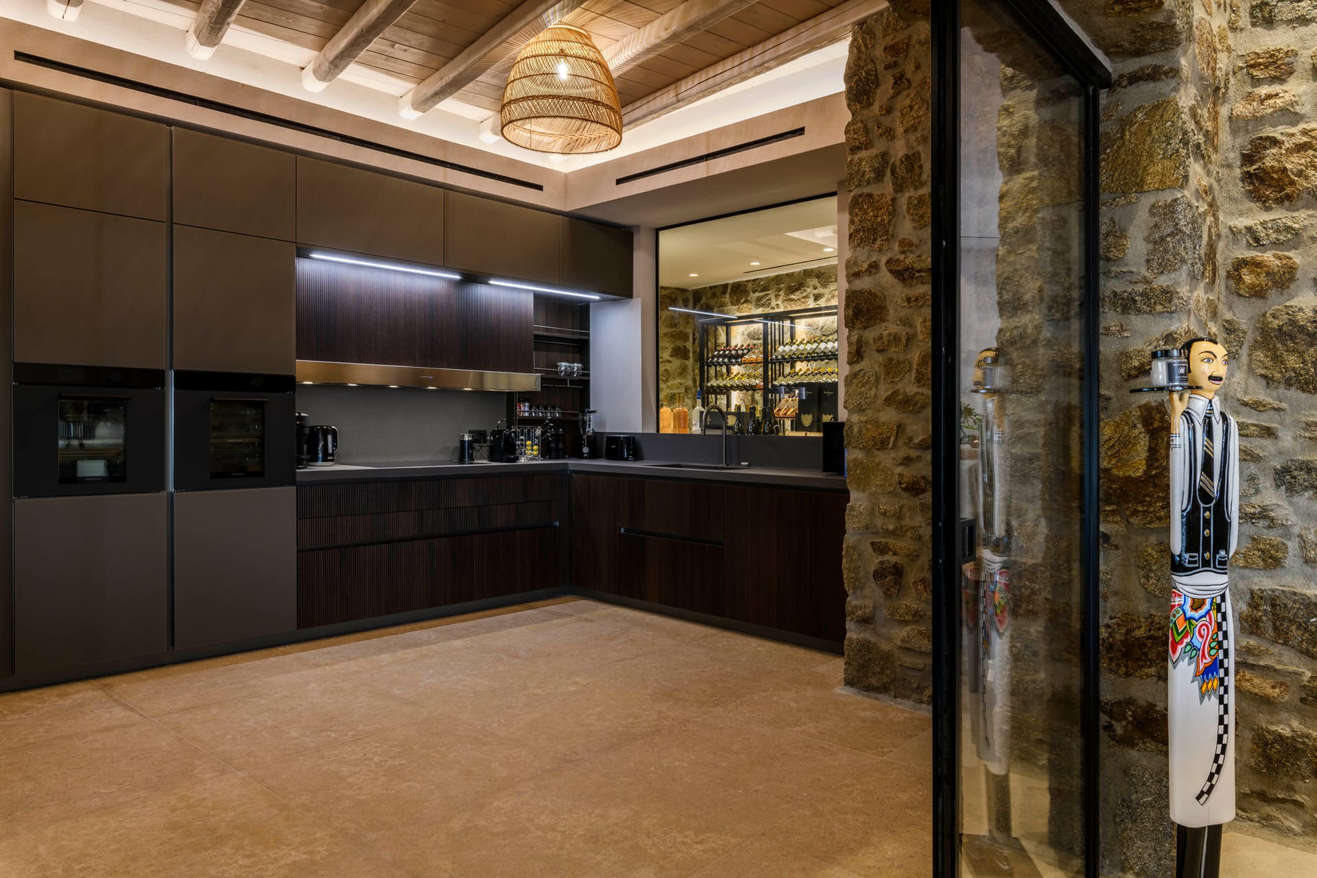 The property can accommodate up to 16 guests. It consists of three levels, the lower, the main, and the upper floor. On the lower level, you can find 2 double bedrooms with en-suite bathrooms and an amazing sea view. On the main level, there are 5 double bedrooms with en-suite bathrooms, a spacious living and dining area, and a fully equipped kitchen with a wine cellar. On the upper level, there is a master bedroom on a natural cliff with an en-suite bathroom and a stunning sea view. The property also offers a staff room.