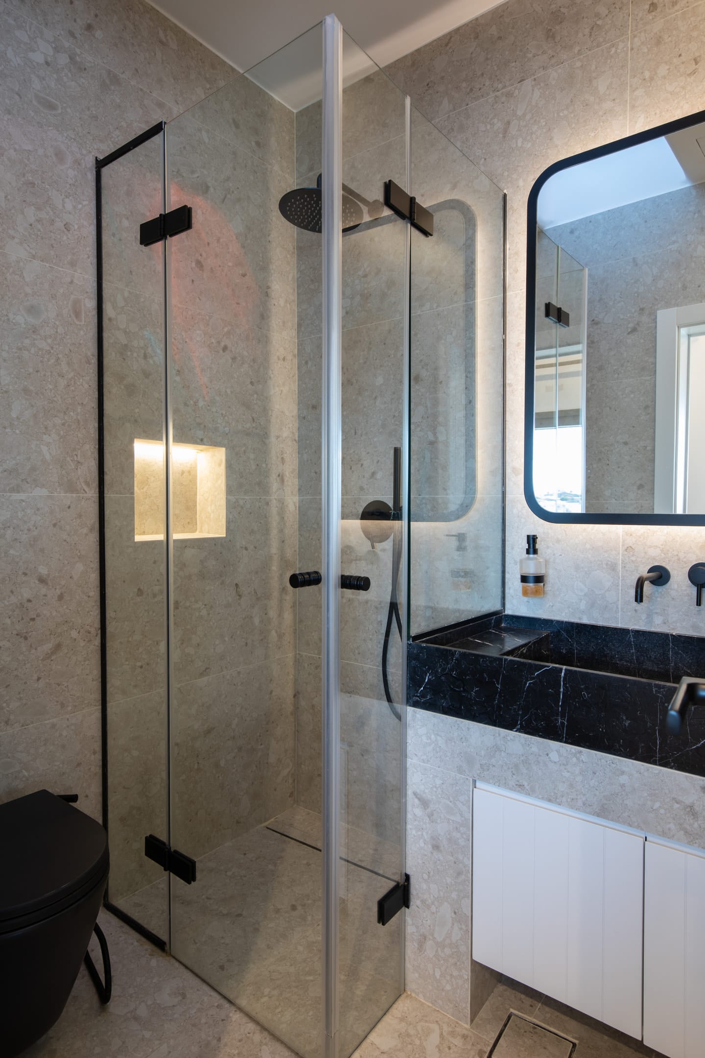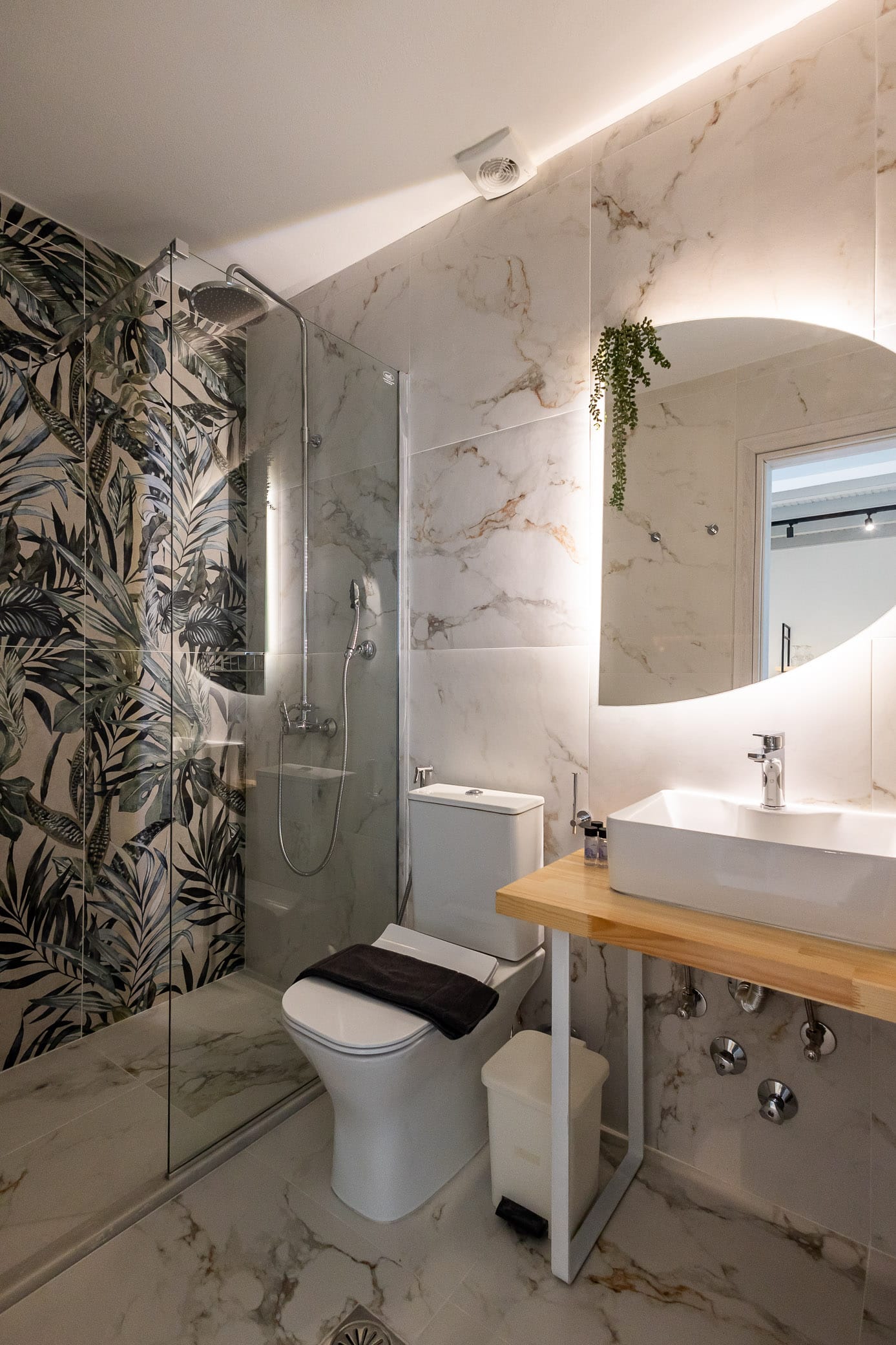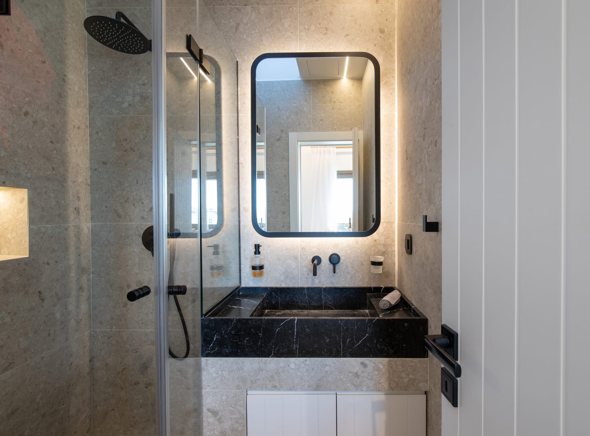 The apartment features a spacious bedroom with a comfortable queen-sized bed and a private bathroom, ensuring a restful night’s sleep. Additionally, there is another fully equipped bathroom off the living area, offering added convenience and privacy for all guests.