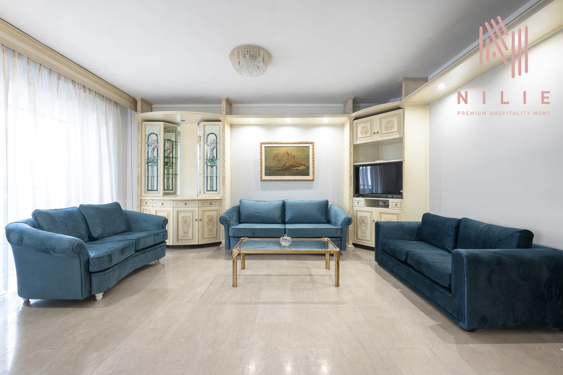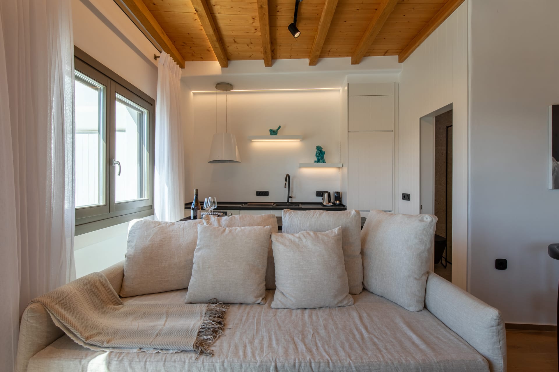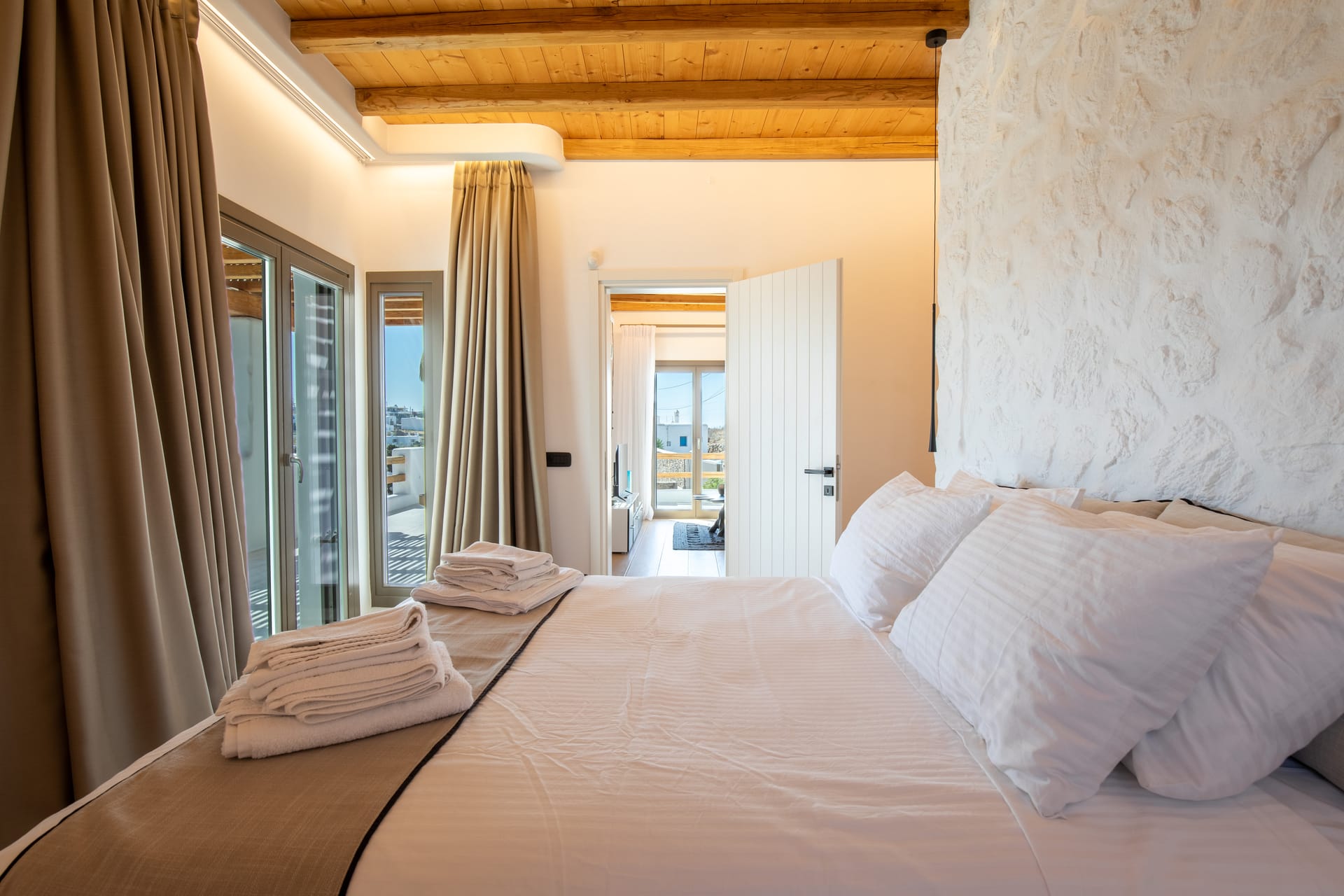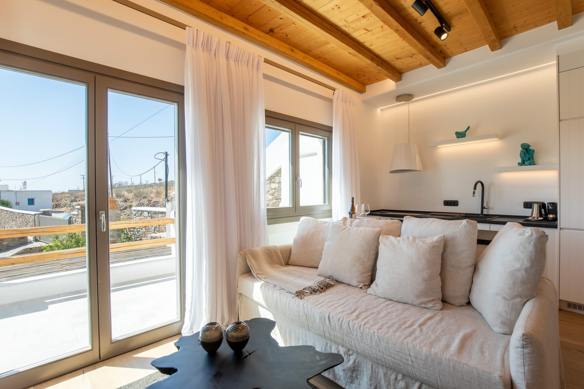 Step into a beautifully decorated living room that effortlessly combines modern amenities with traditional Mykonian charm.