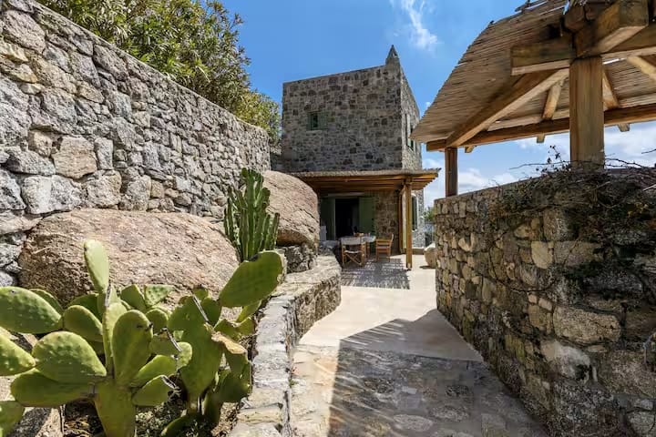 The property is a three-bedroom 145 m² villa, sleeping comfortably up to 7 guests. On the entrance floor there is an open plan kitchen and a living room with a fireplace while, on the upper floor there are two double en suite bedrooms. The guest house with the independent entrance can be found in the garden area. The outdoor area offers two unique sitting areas with a view of the Aegean Sea.