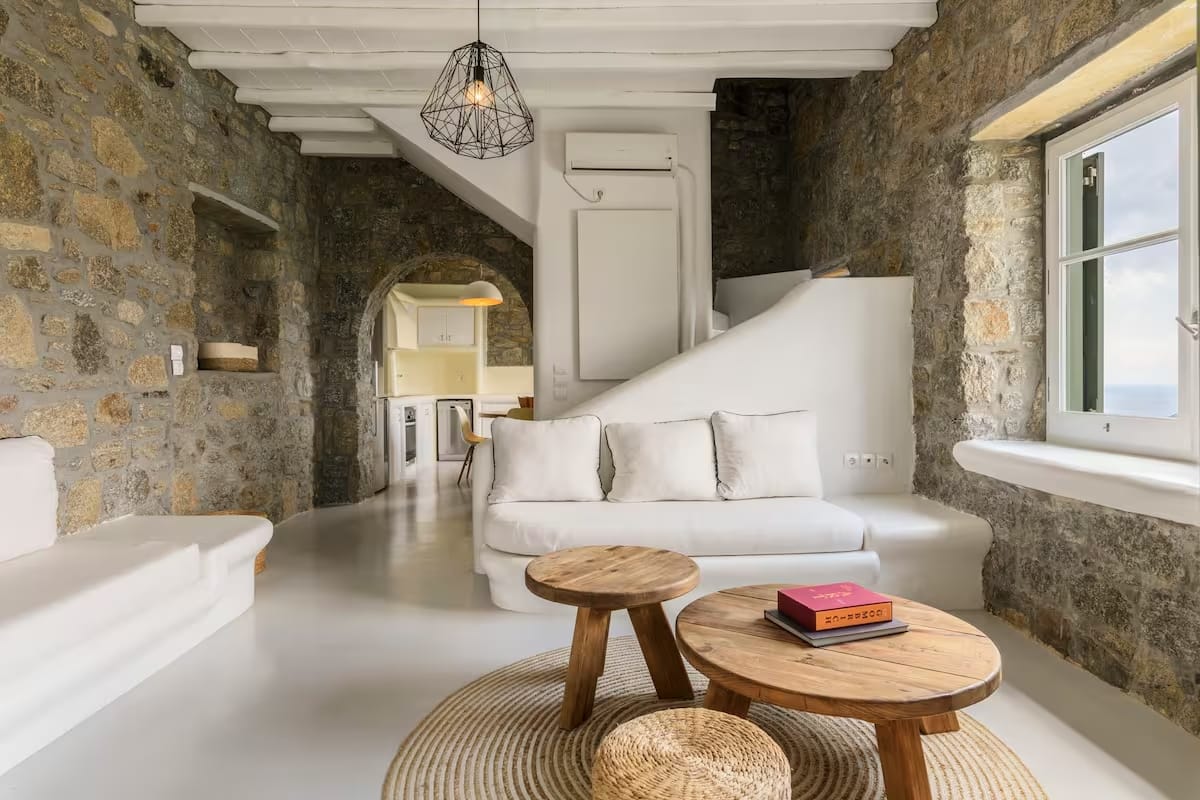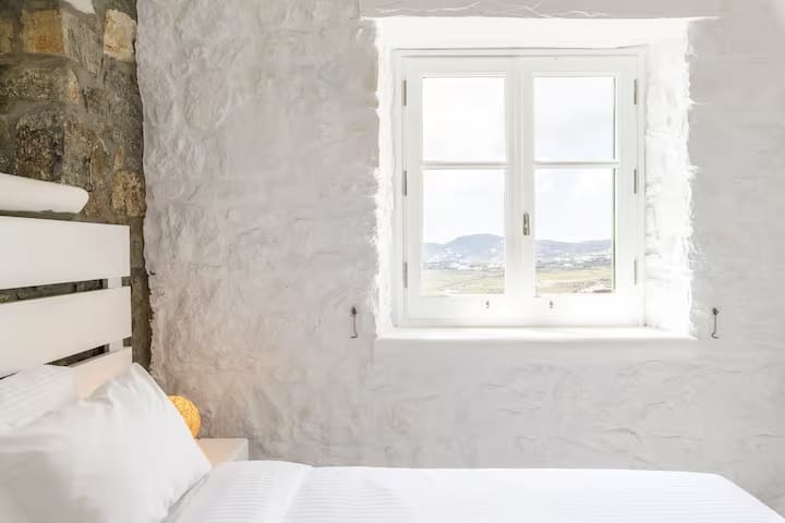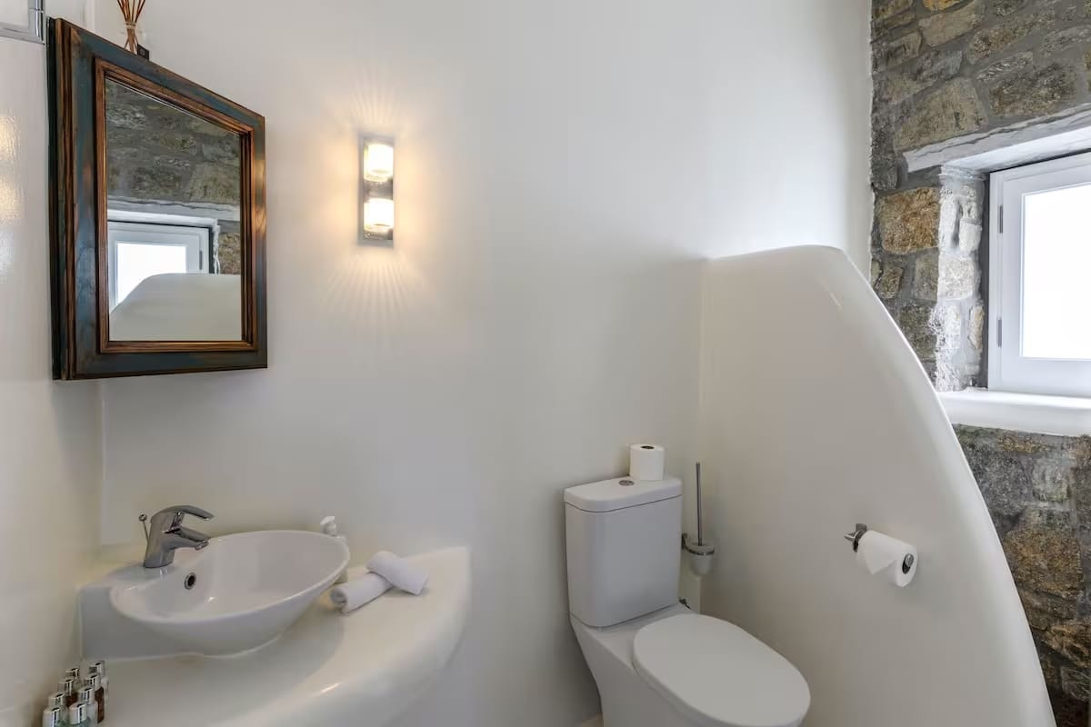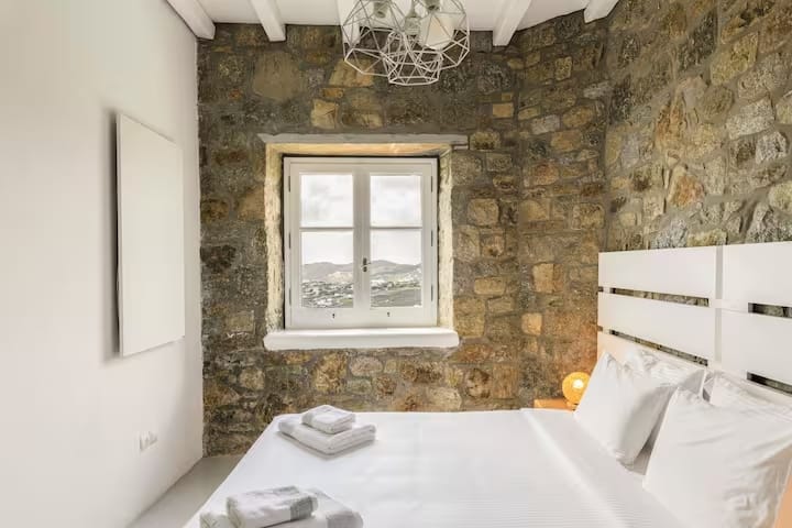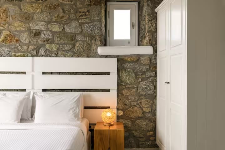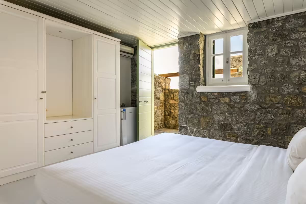 Villa is composed of 1 main block and 1 guest house.Villa Aquadise located in the southeastern part of Mykonos, very close to the famous beaches of Lia, Spilia, and Kalafatis, this unique property basks in the Aegean sun and light. The villa has been built combining minimalistic whitewashed Cycladic elements and impressive dry-stone walls, while is decorated with great respect to the natural landscape.