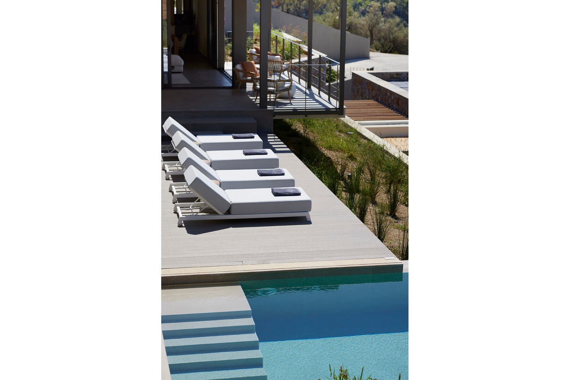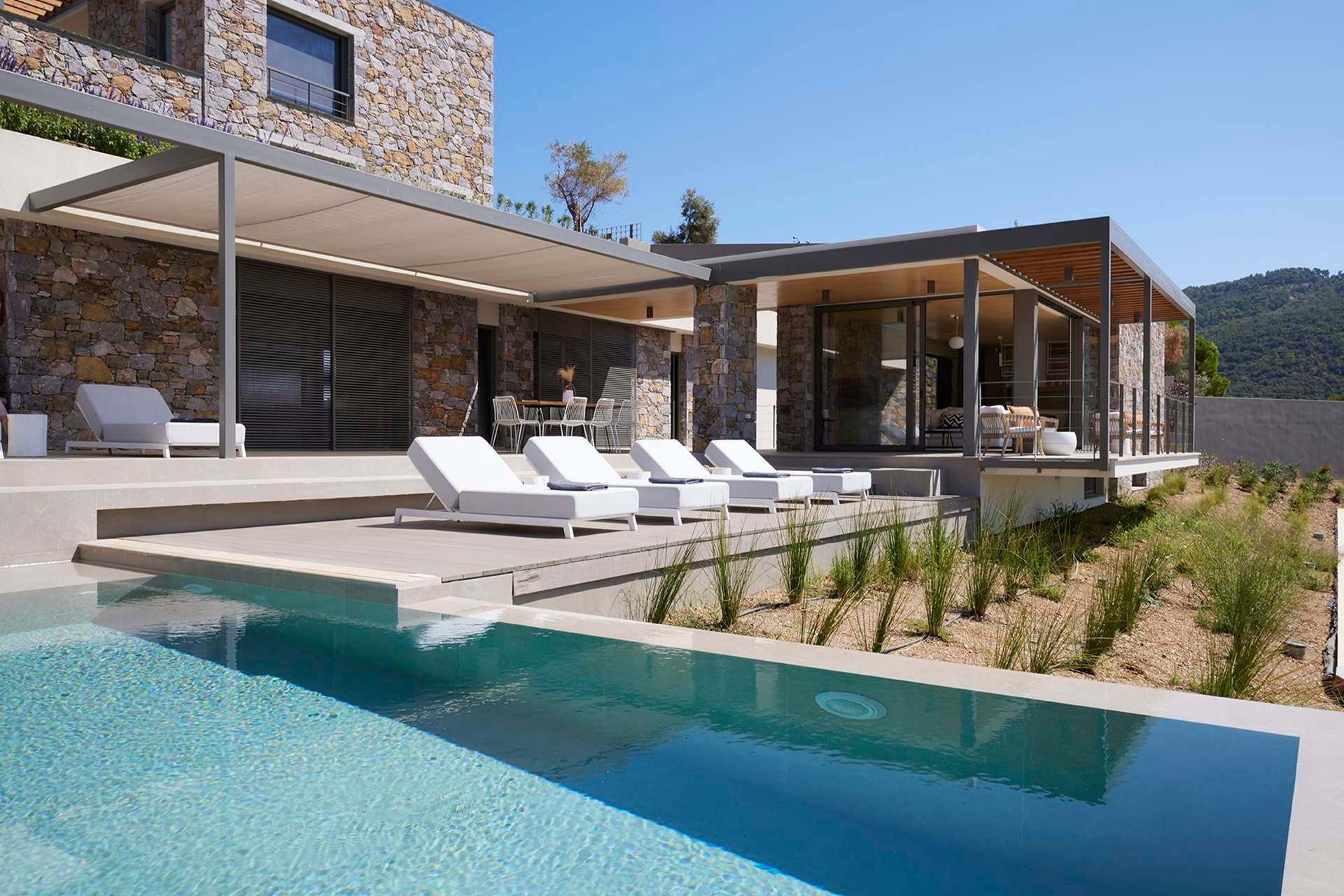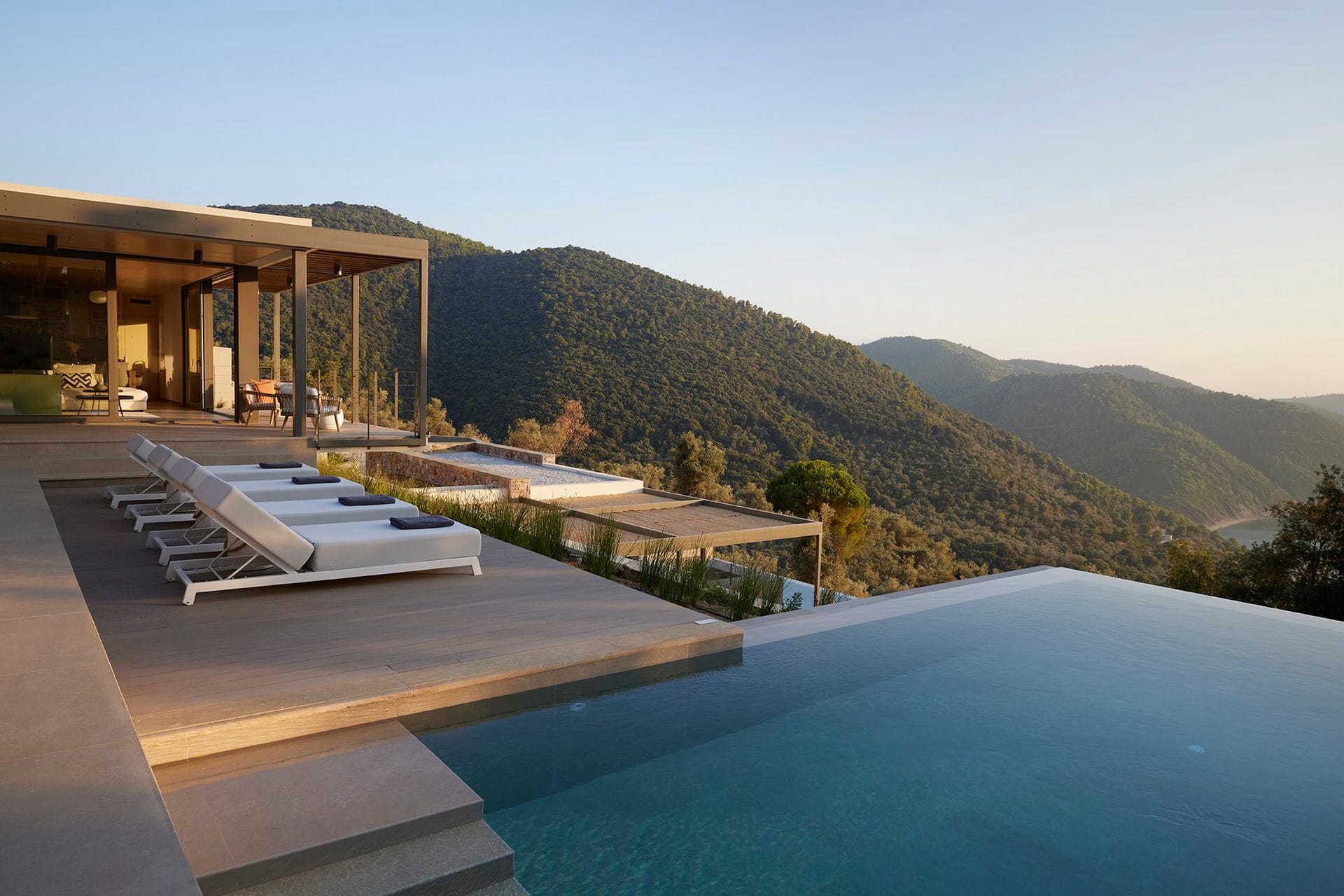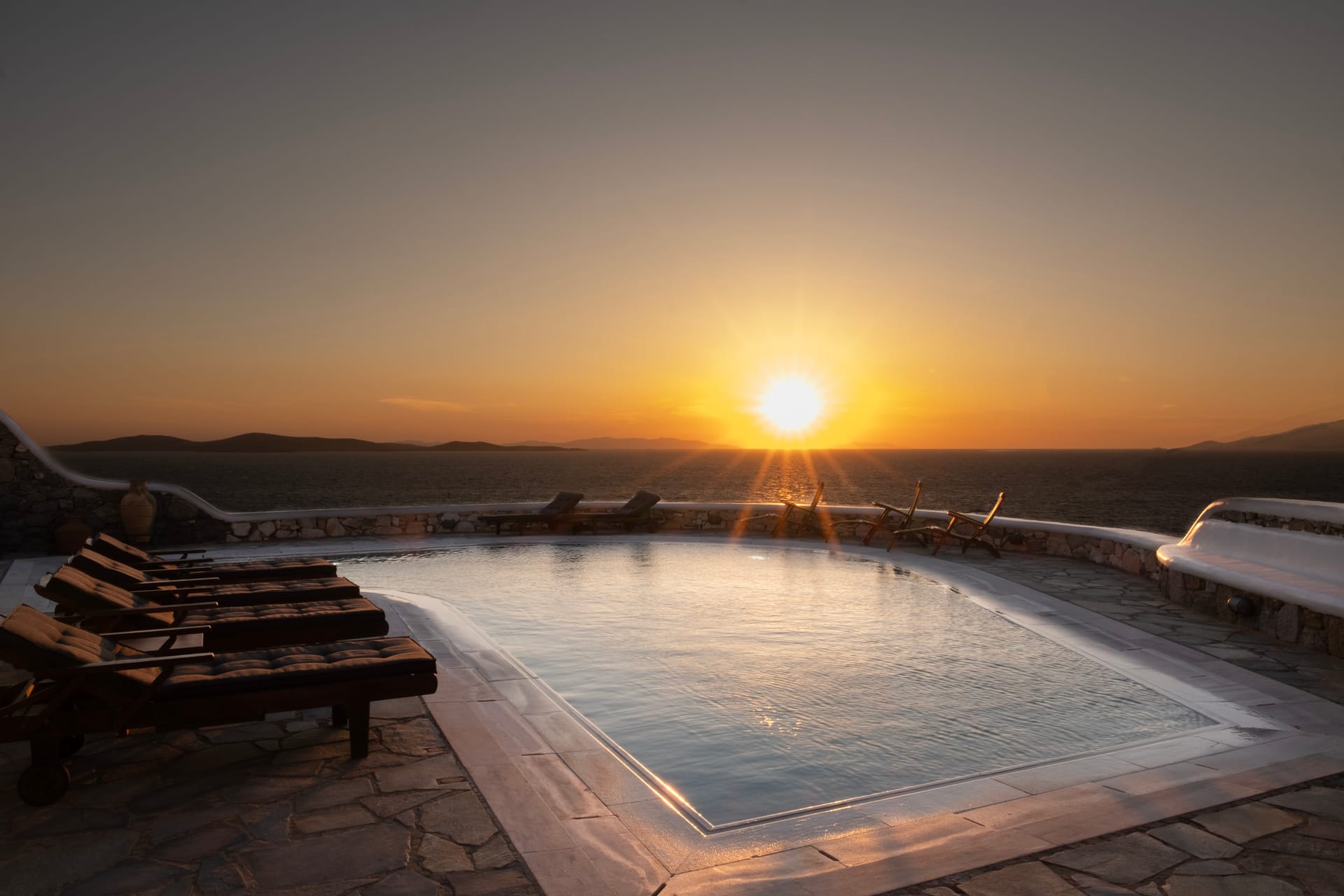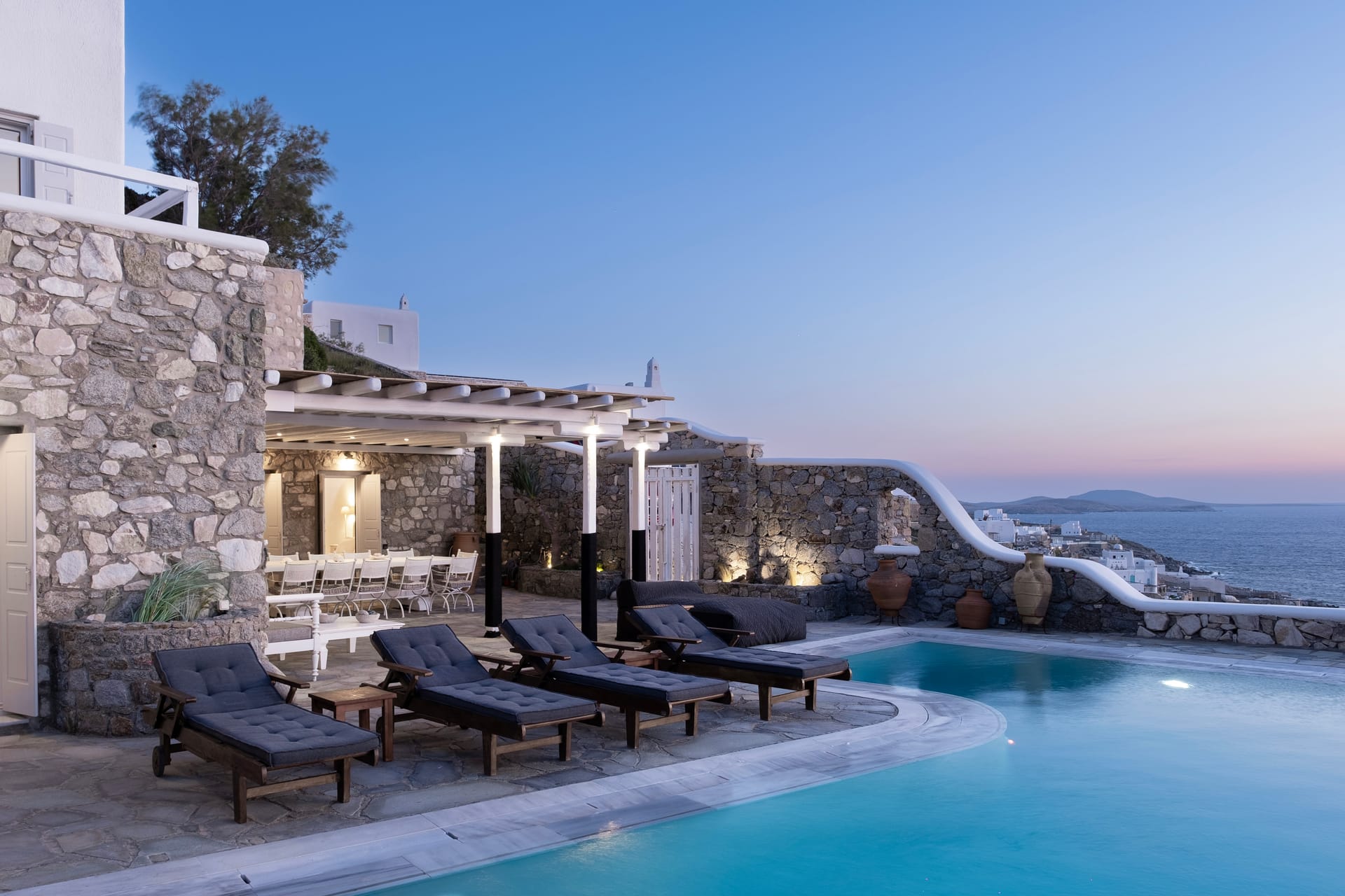 Big Private Swimming Pool with Sunset Views Lounge area with dining table and sunbeds