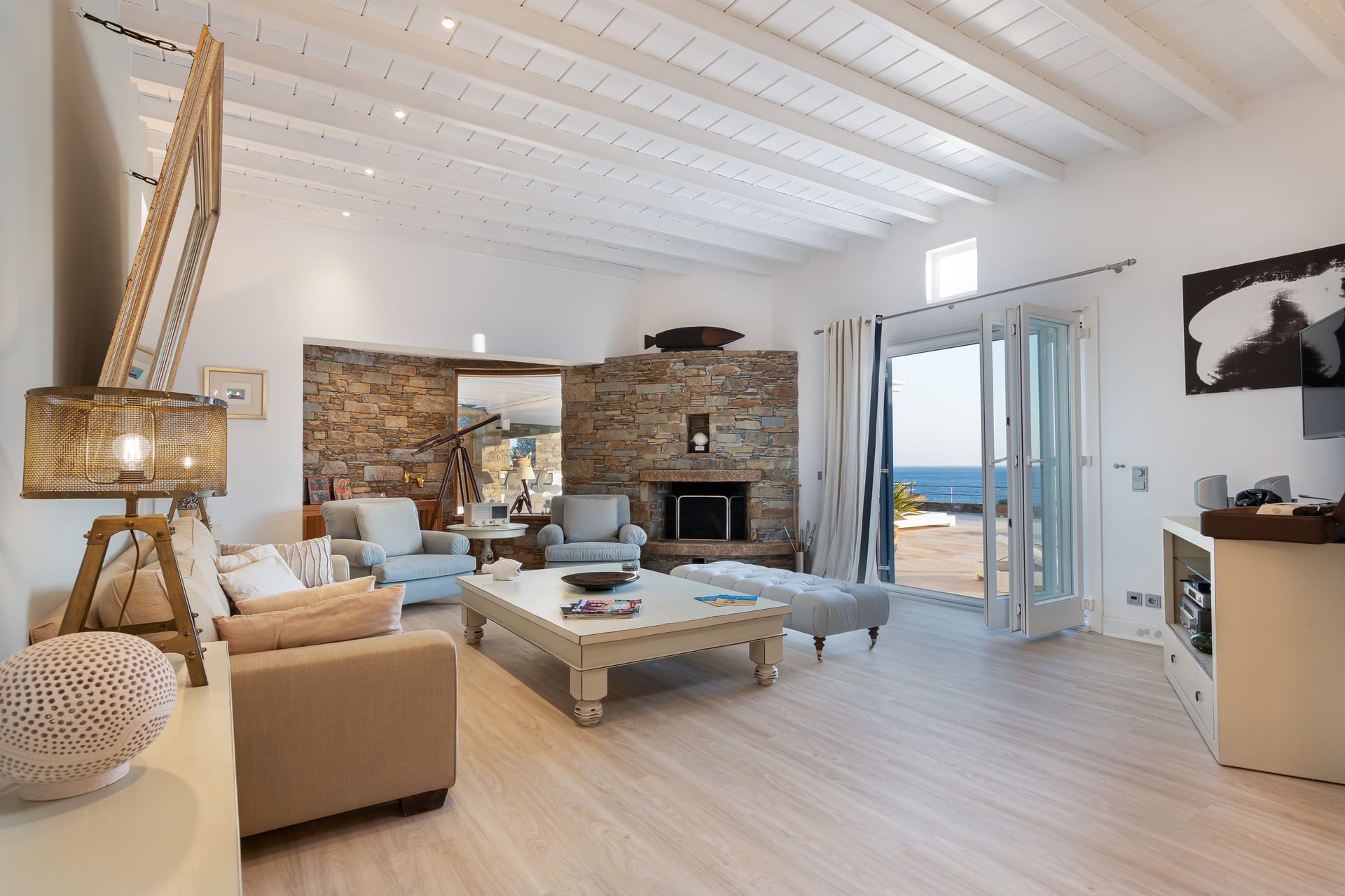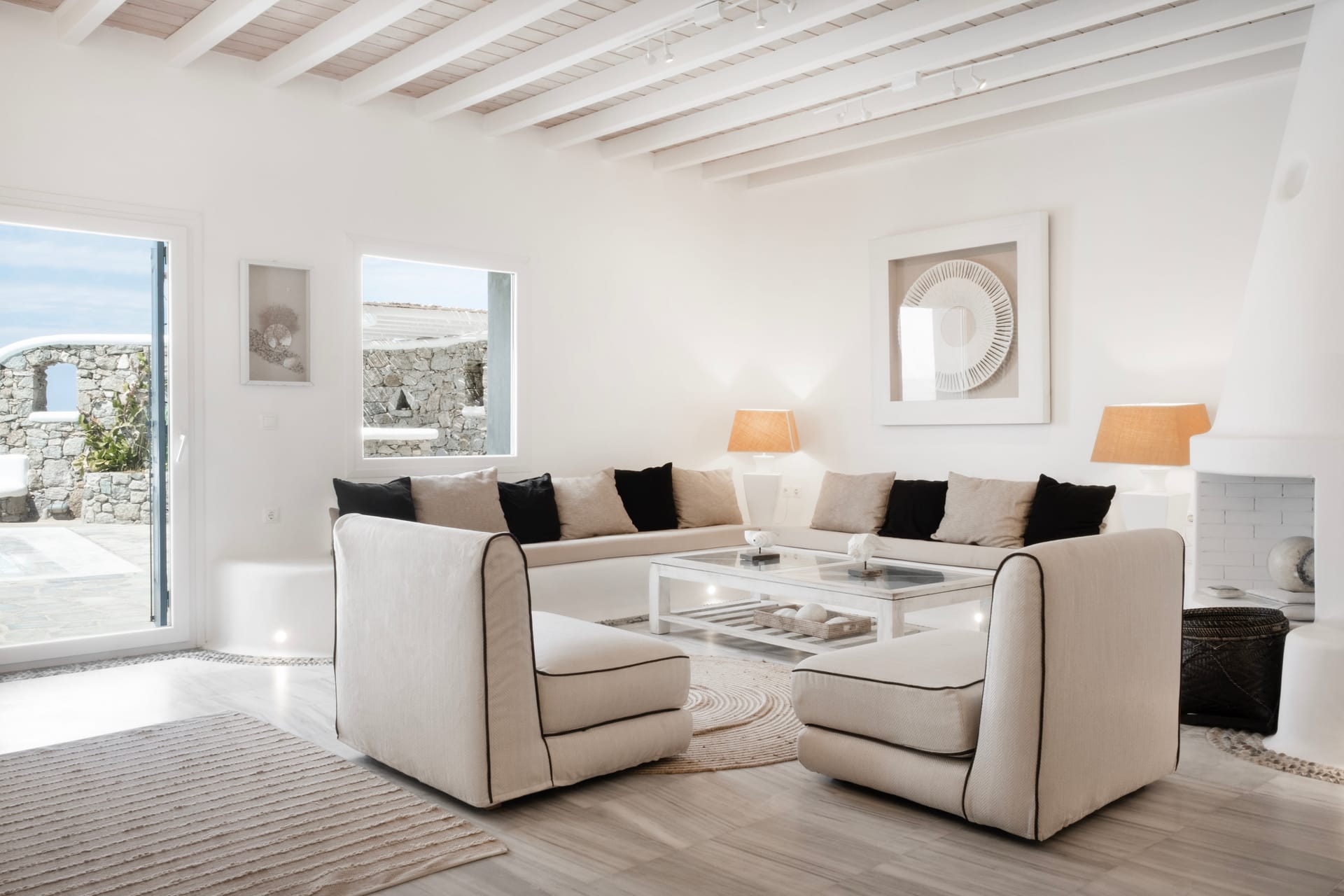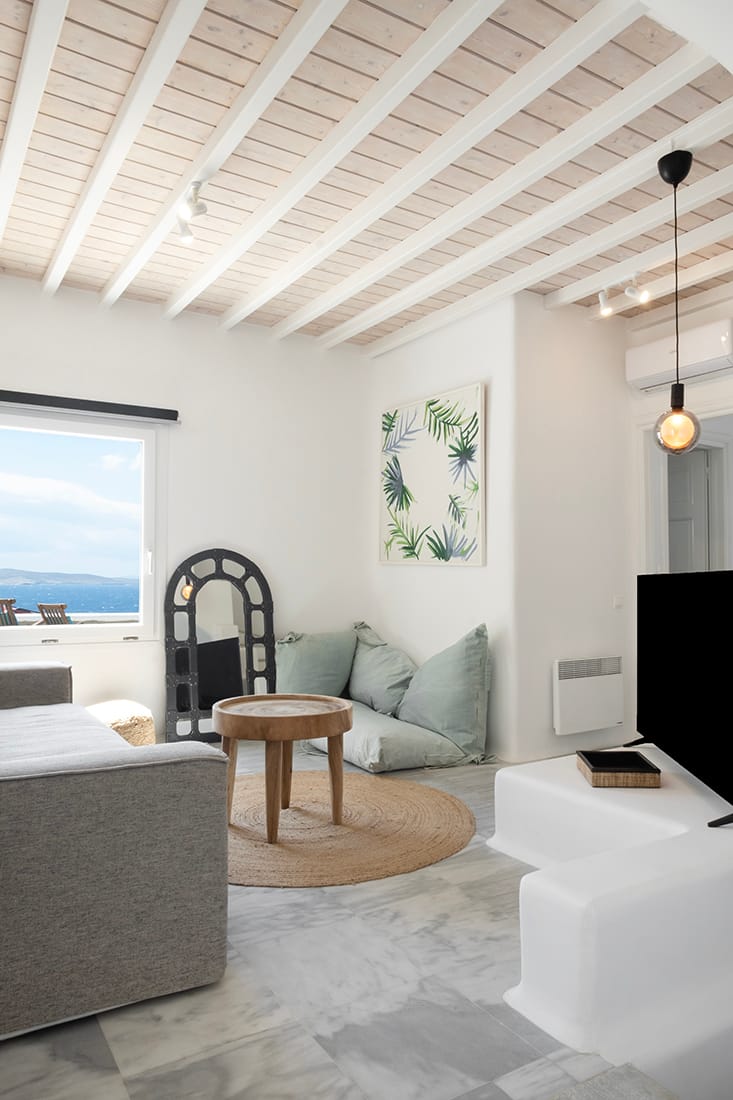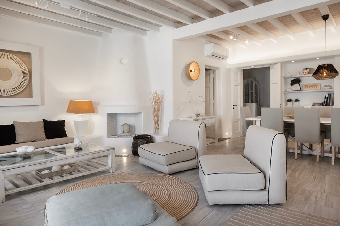 Two simple concepts design the villa’s outdoor areas where comfort and spaces reign supreme throughout mixed with a generous use of pergolas and natural stone.A lounge area with a large wooden dinner table are featured on the ample front terrace of the pool area, boasting sensational views and a relaxing ambience.Breathtaking views of Mykonos town, Tinos, Baos and Delos island from the pool area creates a magical scenery for relaxation (meditation and yoga activities), but also this area can easily host a well-organized private party event.An outside built-in bar corner and a BBQ area are next to the pool.Indoors one Villa Patron offers an excellent choice of accommodation at facilities distinguished by the right colors, elegant decoration and beautiful touches of the well known Cycladic Art and Architecture.A great use of marble that covers all the floor area of the building, combined with the mykonian wooden roof, providing an imposing atmosphere that fits perfectly with original artwork and design furniture.Upon entering the property one is greeted by the indoor living space dominated by the sober living room which is complemented by a charming TV area with a built in fire place and an indoor dining area leading onto the property’s kitchen.