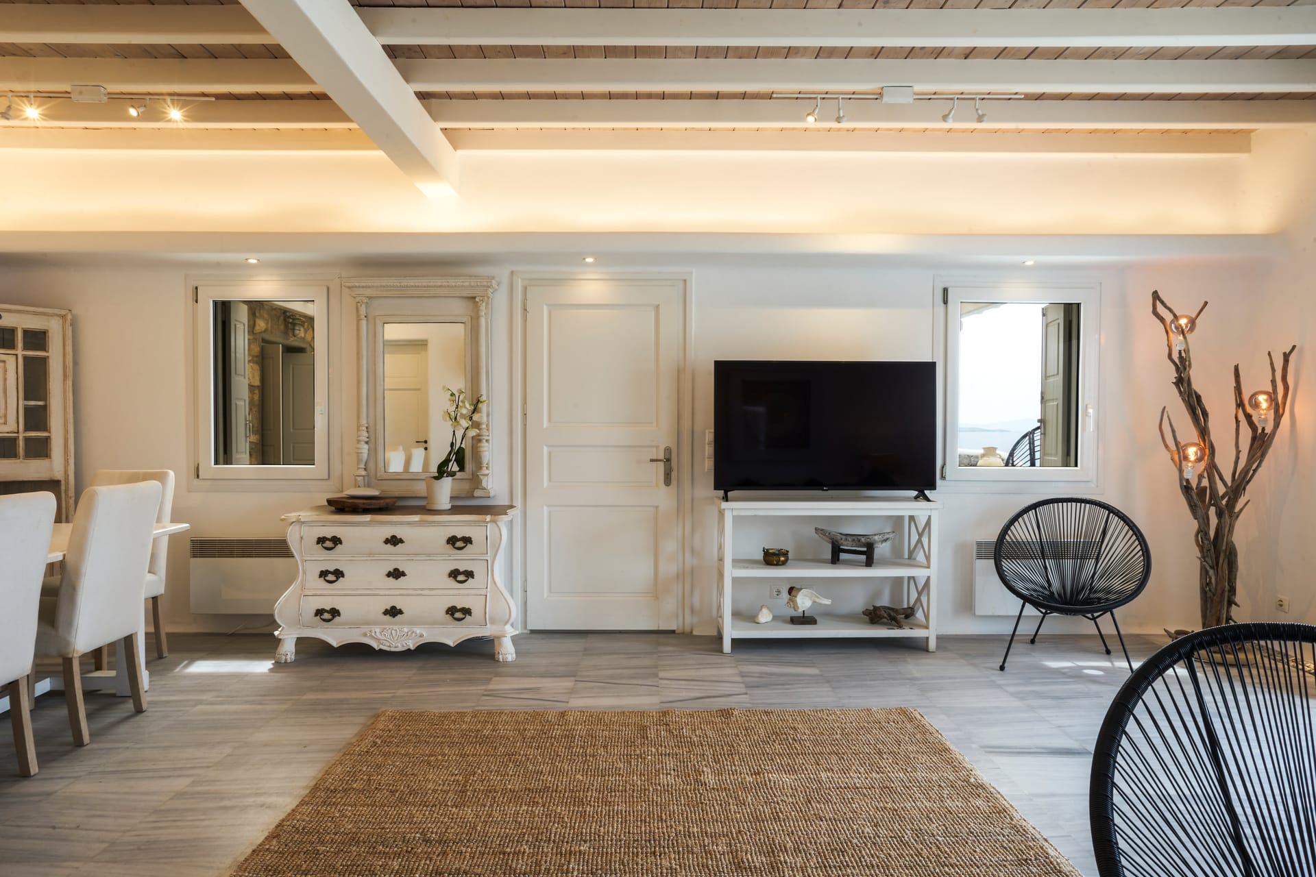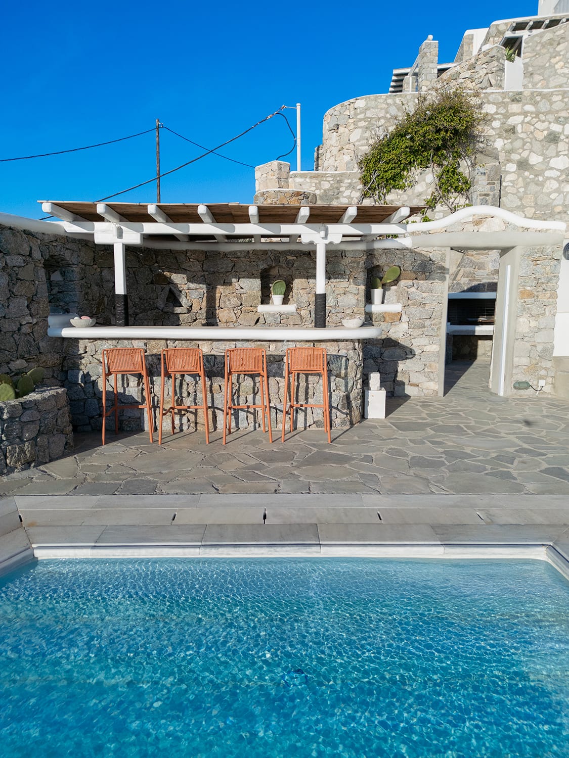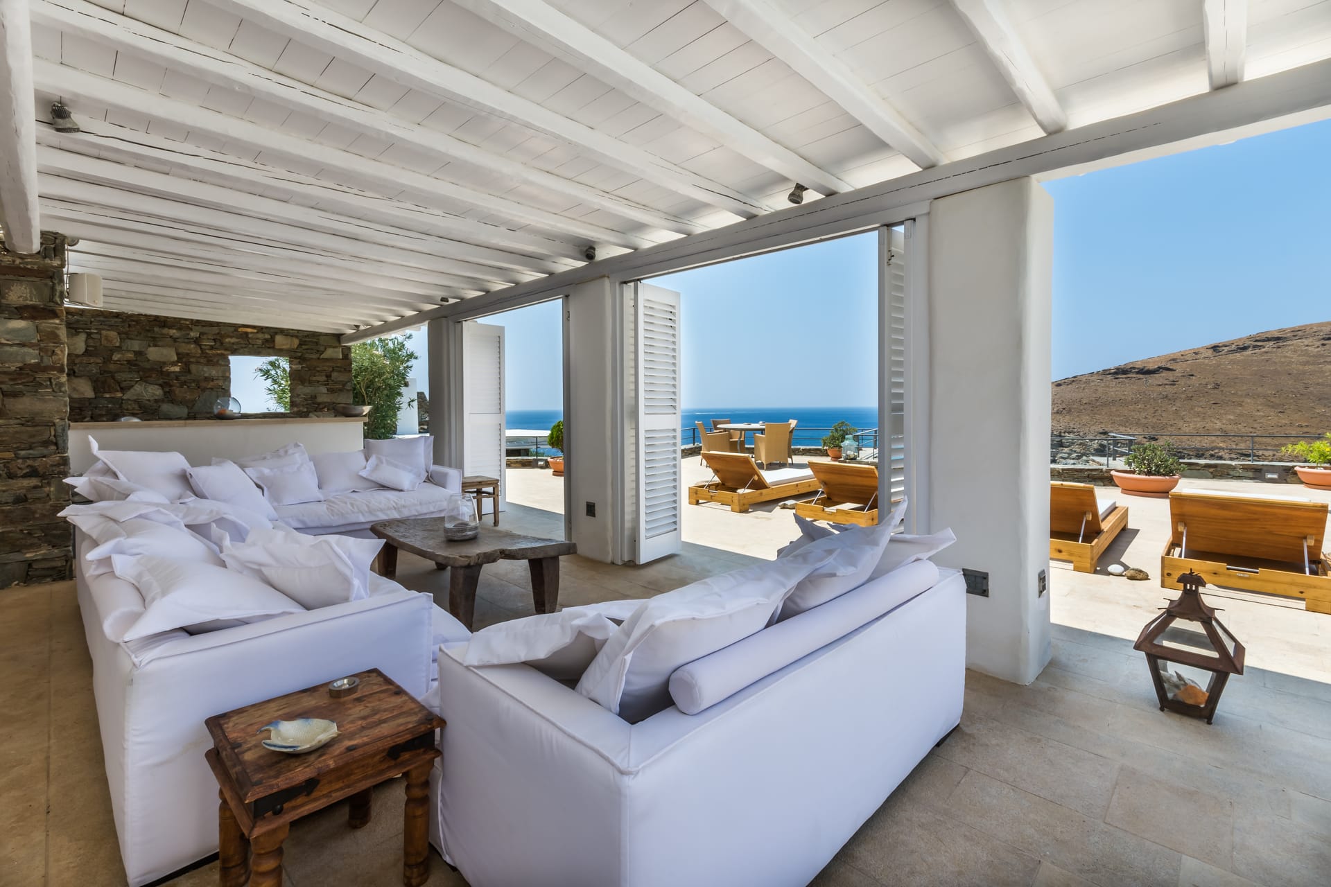 Two simple concepts design the villa’s outdoor areas where comfort and spaces reign supreme throughout mixed with a generous use of pergolas and natural stone.A lounge area with a large wooden dinner table are featured on the ample front terrace of the pool area, boasting sensational views and a relaxing ambience.Breathtaking views of Mykonos town, Tinos, Baos and Delos island from the pool area creates a magical scenery for relaxation (meditation and yoga activities), but also this area can easily host a well-organized private party event.An outside built-in bar corner and a BBQ area are next to the pool.Indoors one Villa Patron offers an excellent choice of accommodation at facilities distinguished by the right colors, elegant decoration and beautiful touches of the well known Cycladic Art and Architecture.A great use of marble that covers all the floor area of the building, combined with the mykonian wooden roof, providing an imposing atmosphere that fits perfectly with original artwork and design furniture.Upon entering the property one is greeted by the indoor living space dominated by the sober living room which is complemented by a charming TV area with a built in fire place and an indoor dining area leading onto the property’s kitchen.