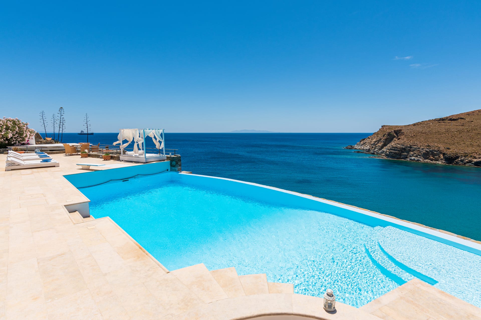 Perched on Kanalia Cove after Ornos area, this splendid private property of 330 sq.m. building in a 1100 sq.m. plot, offers unrivalled views of the area of Mykonos Town, Tinos island, Baos island and Delos island in a grand panorama that can be literally enjoyed from every corner of the property.The hot spot location also allows easy access to Mykonos Town’s (5 klm) cosmopolitan nightlife while also being within more than reasonable distance from the island’s most popular beaches, restaurants and beach clubs.The villa is near to super markets, bakeries, restaurants, beach bars, hair and nail salons, pharmacies, car/bike rentals, ATM. Within 3 km you can reach the famous Ornos beach, ideal for families as well as for large groups of friends.Other famous beaches of the island like Psarou where the worldwide famous beach bar restaurant Nammos is, Paraga where the famous beach bar restaurant Scorpios is, Panormos where the Principote is, Tropicana beach bar etc are only 6-10 km driving away.