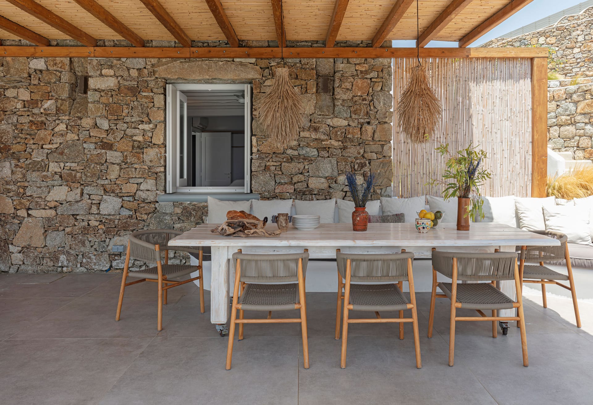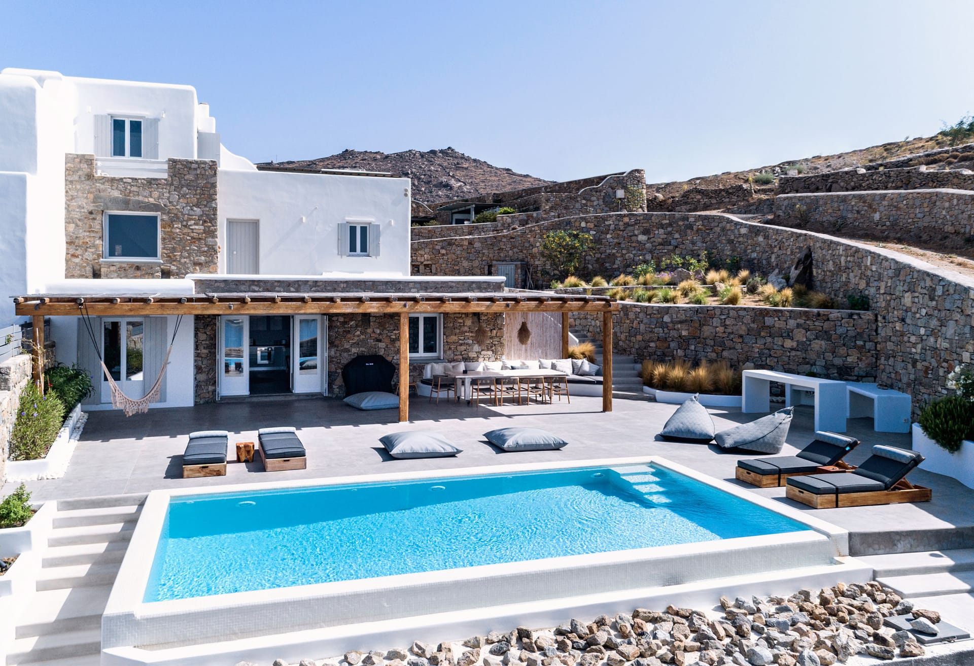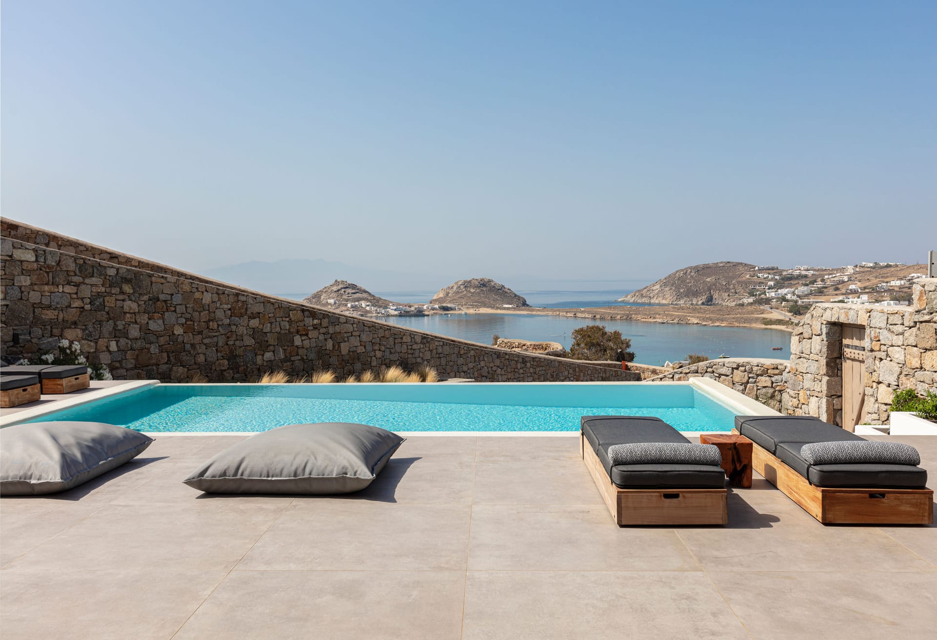 sophisticated minimal, contemporary , luxurious and stylish but also respecting local culture and architecture. designed with relaxed elegance, to serve a family as well as a big group of friends, with focus in functionality. less is more.