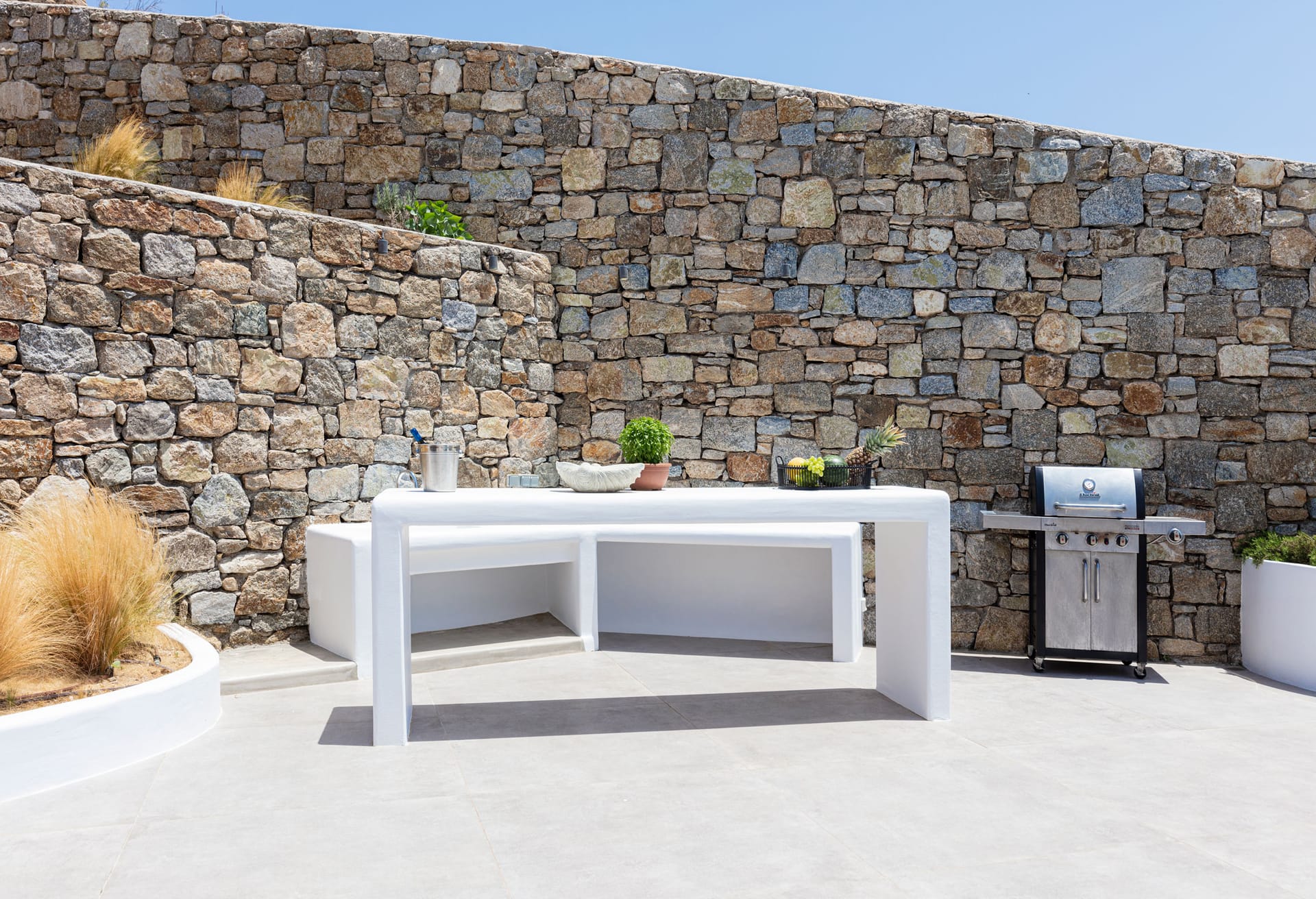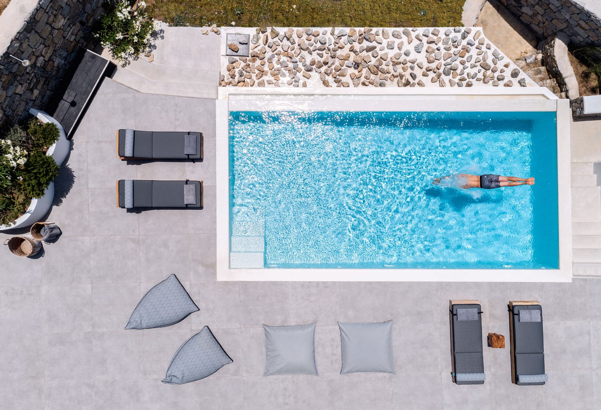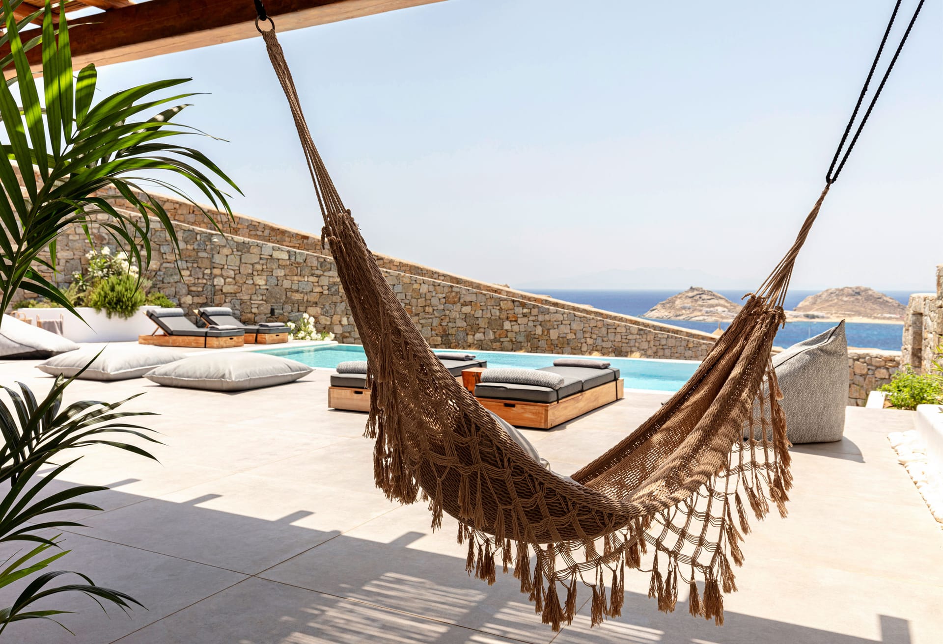 sophisticated minimal, contemporary , luxurious and stylish but also respecting local culture and architecture. designed with relaxed elegance, to serve a family as well as a big group of friends, with focus in functionality. less is more.