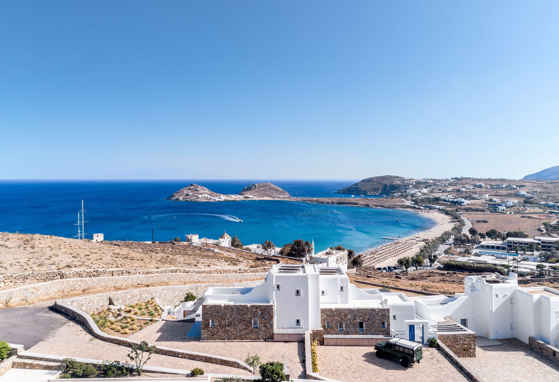 Spectacular views to sea and close islands of Syros, Delos and the Aegean archipelago. Amazing sunset views!