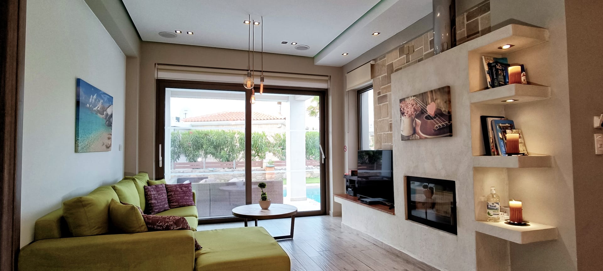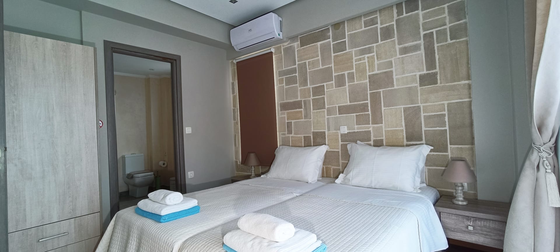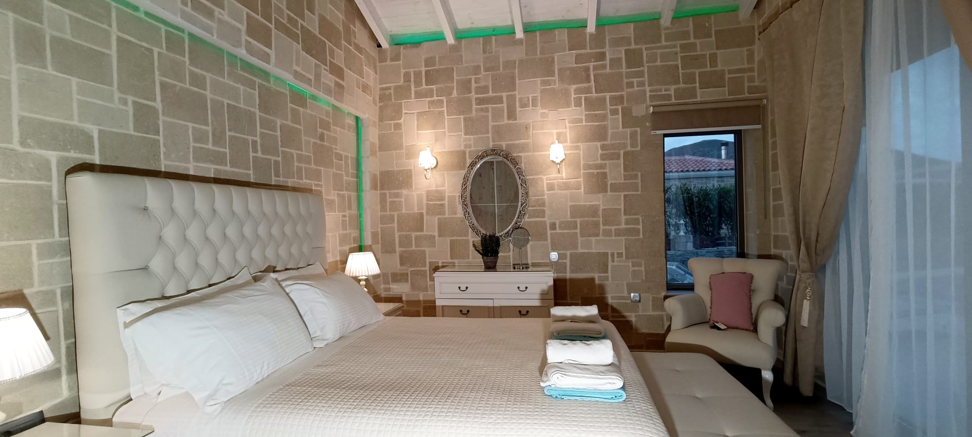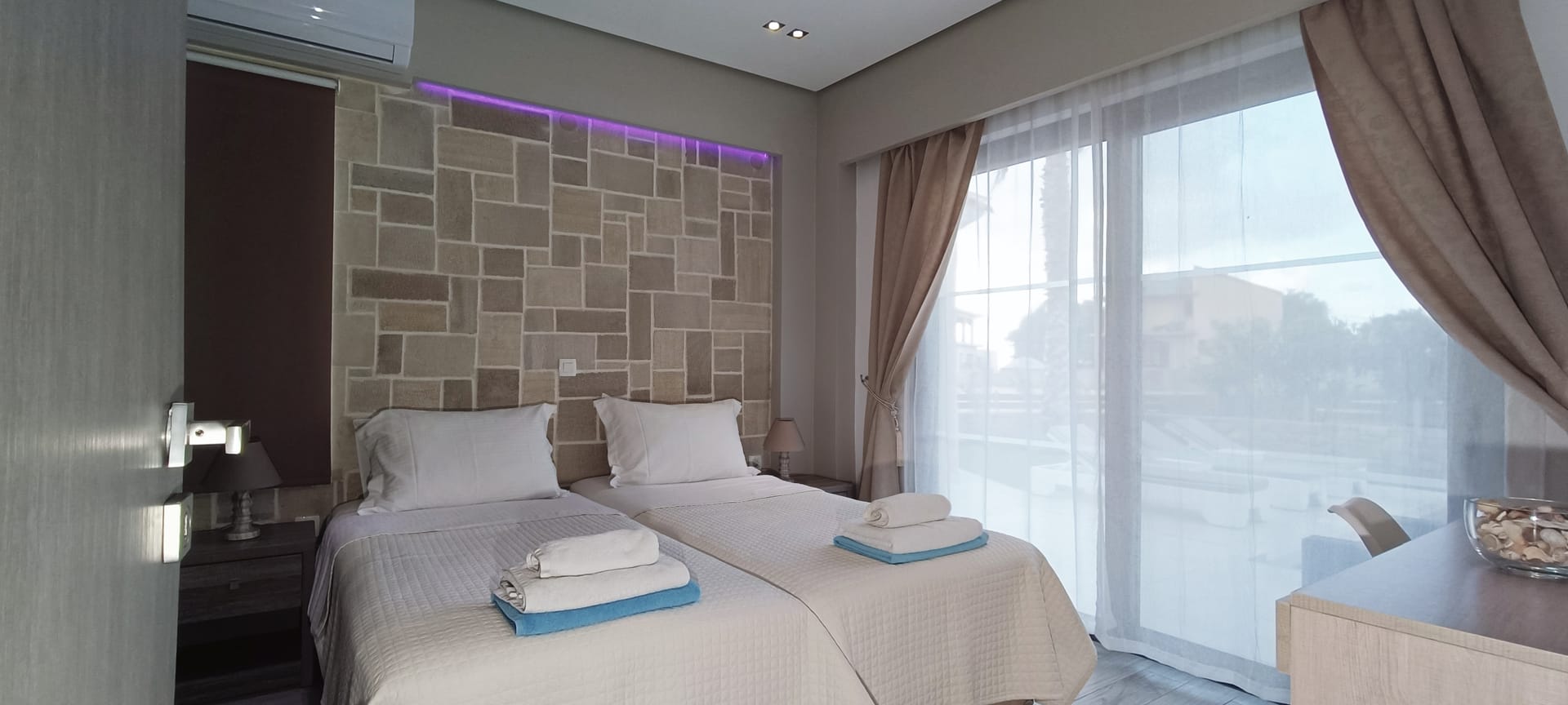It can accommodate 5 guests in the two luxurious suite bedrooms and a bed sofa. On the lower level there is a modern furnished living room with a dining table with the lounge next to the fireplace with pool and garden view. A large 43’’ satellite led TV with DVD player and cd/radio player, a fully functional kitchen with fridge/freezer, oven, microwave, dishwasher, toaster, electric kettle, coffee machines and the all the necessary kitchen utensils . Also in the low level there is a bedroom with twin beds with hypoallergenic antistress mattresses offered with a private bathroom with jacuzzi shower. On the first floor is the master suite bedroom with a king size bed with hypoallergenic antistress mattress, a private bathroom with Jacuzzi shower, a led 32’’ satellite TV, a safety deposit box and a covered balcony with pool, garden and sea view. Also provided washing machine, air-conditioning in all rooms, free wireless internet, iron equipment. This is truly a lovely villa to spend memorable holidays in one of the most exquisite areas of Crete , it is ideal destination for families and group of friends who are looking for an ultimate experience of relaxation combined with a unique hospitality. The location of the villa is also perfect for ecotourism, outdoor activities and for exploring the beauties of Crete. The closest sandy beach with sun beds is only 200m away from the villa.