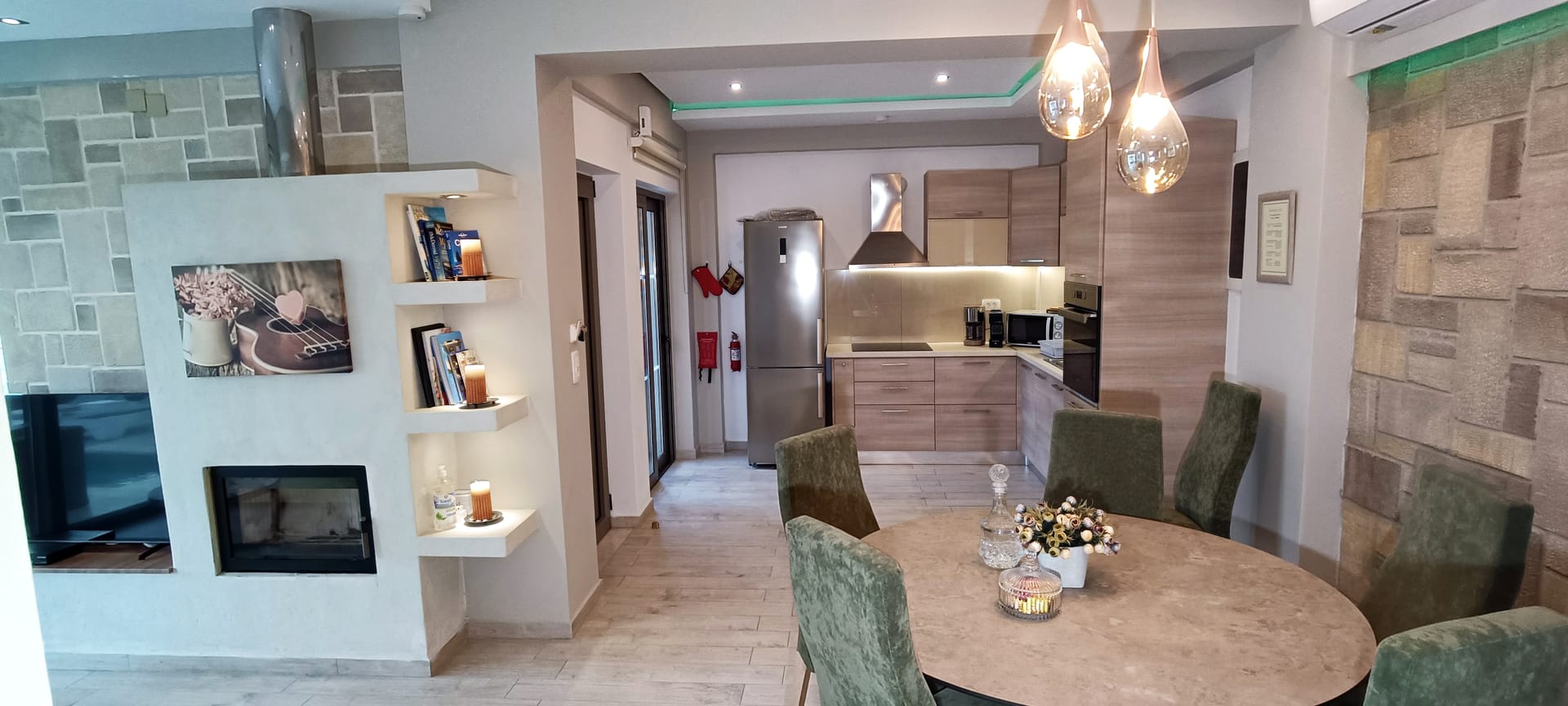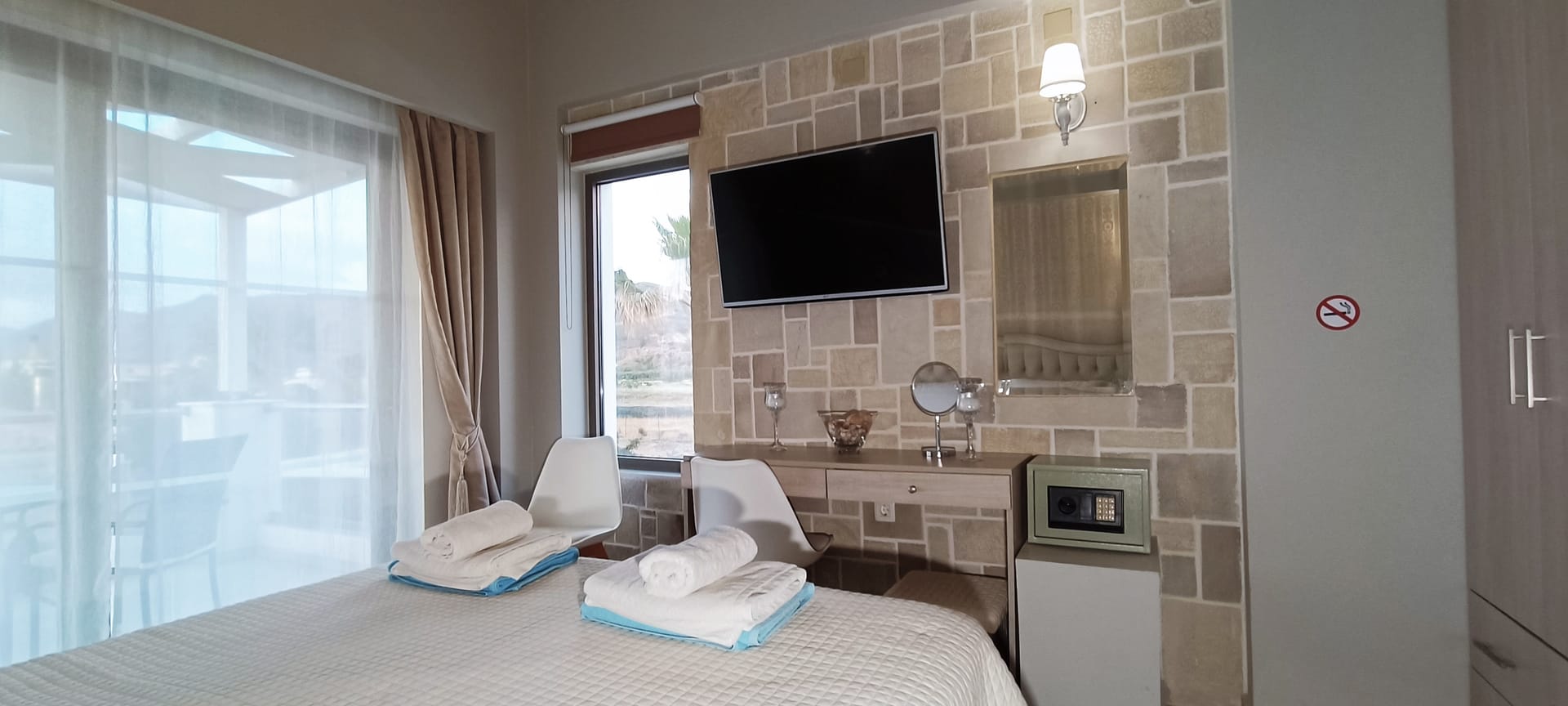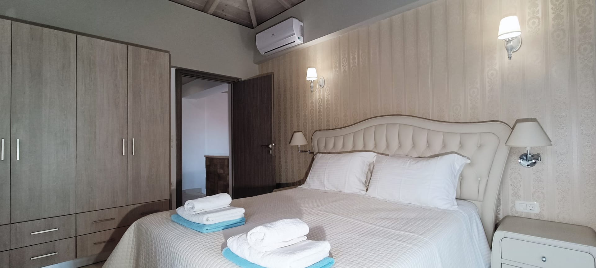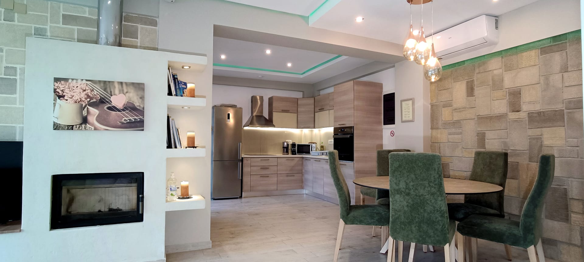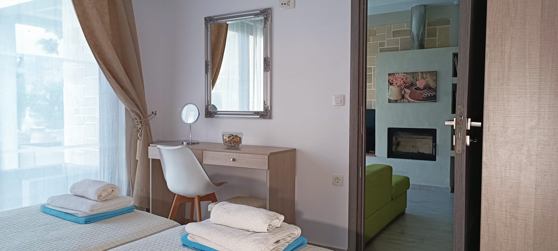 It can accommodate 5 guests in the two luxurious suite bedrooms and a bed sofa. On the lower level there is a modern furnished living room with a dining table with the lounge next to the fireplace with pool and garden view. A large 43’’ satellite led TV with DVD player and cd/radio player, a fully functional kitchen with fridge/freezer, oven, microwave, dishwasher, toaster, electric kettle, coffee machines and the all the necessary kitchen utensils . Also in the low level there is a bedroom with twin beds with hypoallergenic antistress mattresses offered with a private bathroom with jacuzzi shower. On the first floor is the master suite bedroom with a king size bed with hypoallergenic antistress mattress, a private bathroom with Jacuzzi shower, a led 32’’ satellite TV, a safety deposit box and a covered balcony with pool, garden and sea view. Also provided washing machine, air-conditioning in all rooms, free wireless internet, iron equipment. This is truly a lovely villa to spend memorable holidays in one of the most exquisite areas of Crete , it is ideal destination for families and group of friends who are looking for an ultimate experience of relaxation combined with a unique hospitality. The location of the villa is also perfect for ecotourism, outdoor activities and for exploring the beauties of Crete. The closest sandy beach with sun beds is only 200m away from the villa.