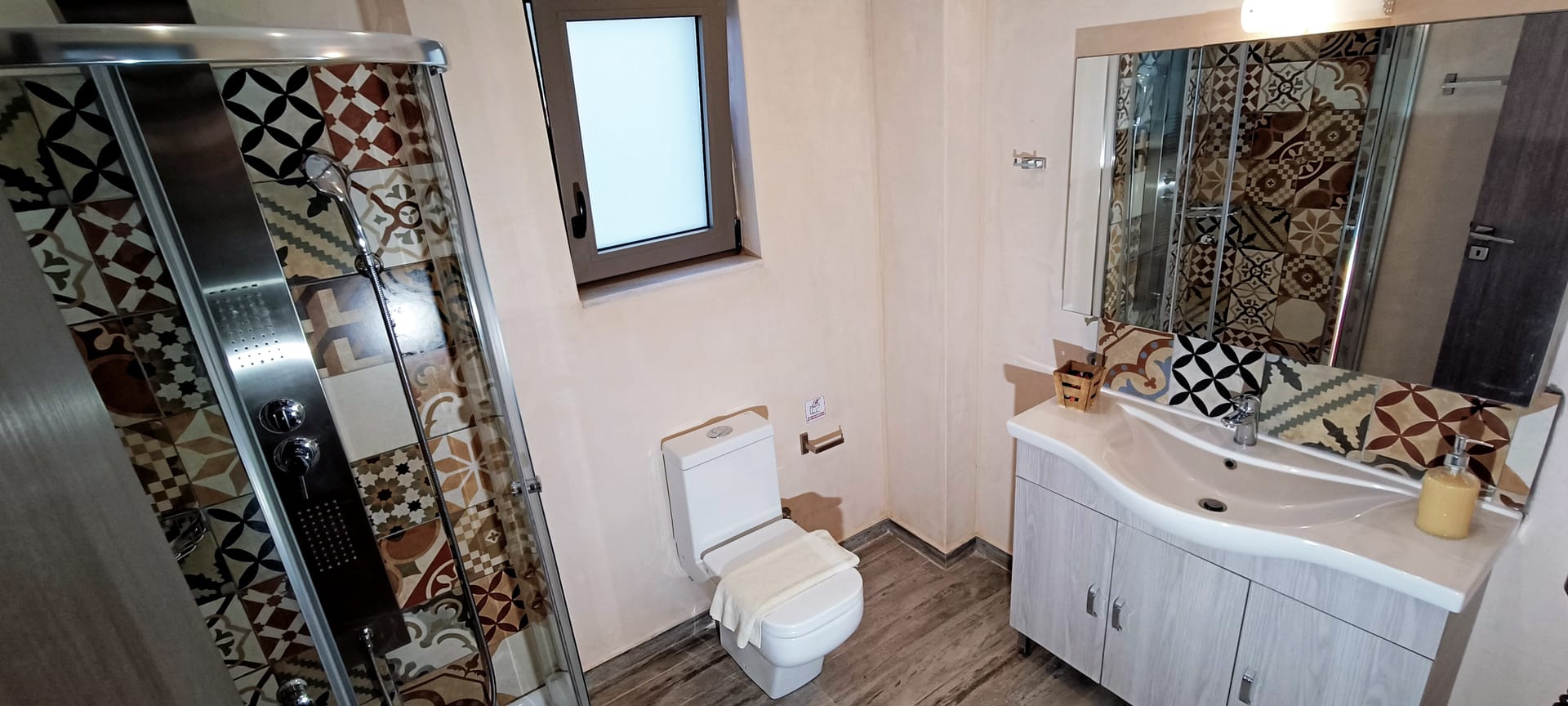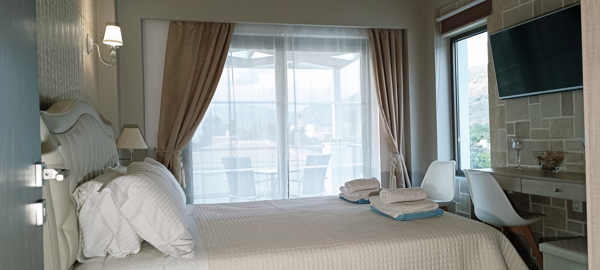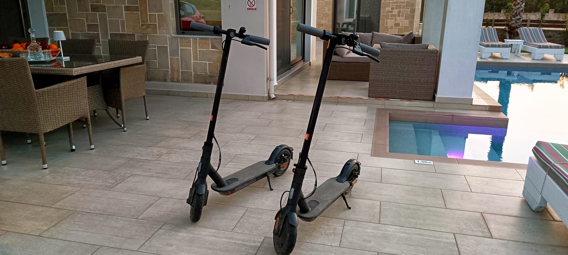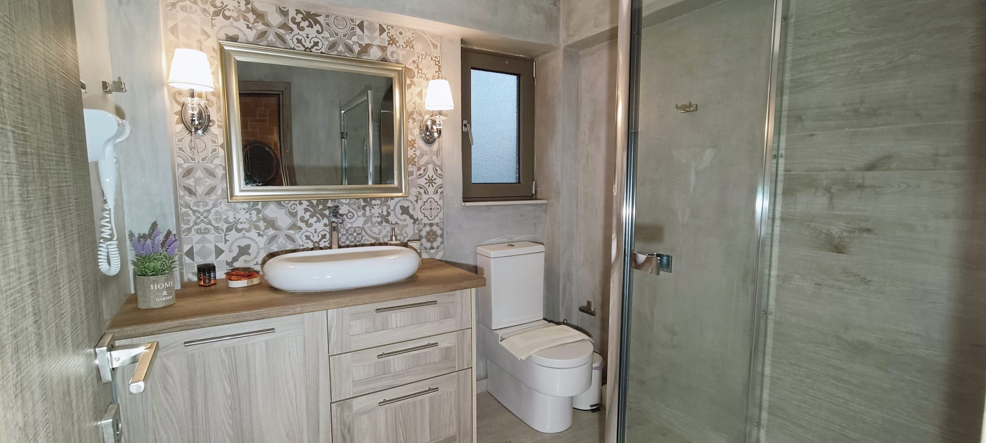 It can accommodate 5 guests in the two luxurious suite bedrooms and a bed sofa. On the lower level there is a modern furnished living room with a dining table with the lounge next to the fireplace with pool and garden view. A large 43’’ satellite led TV with DVD player and cd/radio player, a fully functional kitchen with fridge/freezer, oven, microwave, dishwasher, toaster, electric kettle, coffee machines and the all the necessary kitchen utensils . Also in the low level there is a bedroom with twin beds with hypoallergenic antistress mattresses offered with a private bathroom with jacuzzi shower. On the first floor is the master suite bedroom with a king size bed with hypoallergenic antistress mattress, a private bathroom with Jacuzzi shower, a led 32’’ satellite TV, a safety deposit box and a covered balcony with pool, garden and sea view. Also provided washing machine, air-conditioning in all rooms, free wireless internet, iron equipment. This is truly a lovely villa to spend memorable holidays in one of the most exquisite areas of Crete , it is ideal destination for families and group of friends who are looking for an ultimate experience of relaxation combined with a unique hospitality. The location of the villa is also perfect for ecotourism, outdoor activities and for exploring the beauties of Crete. The closest sandy beach with sun beds is only 200m away from the villa.