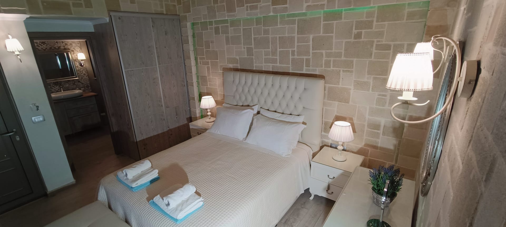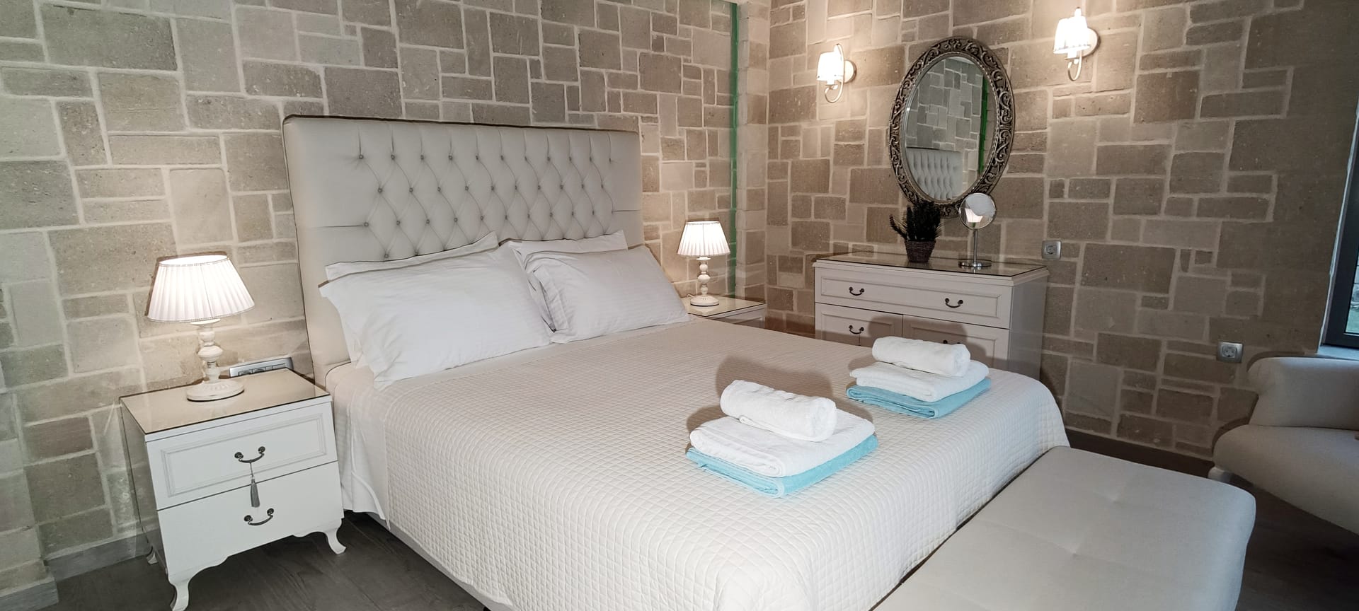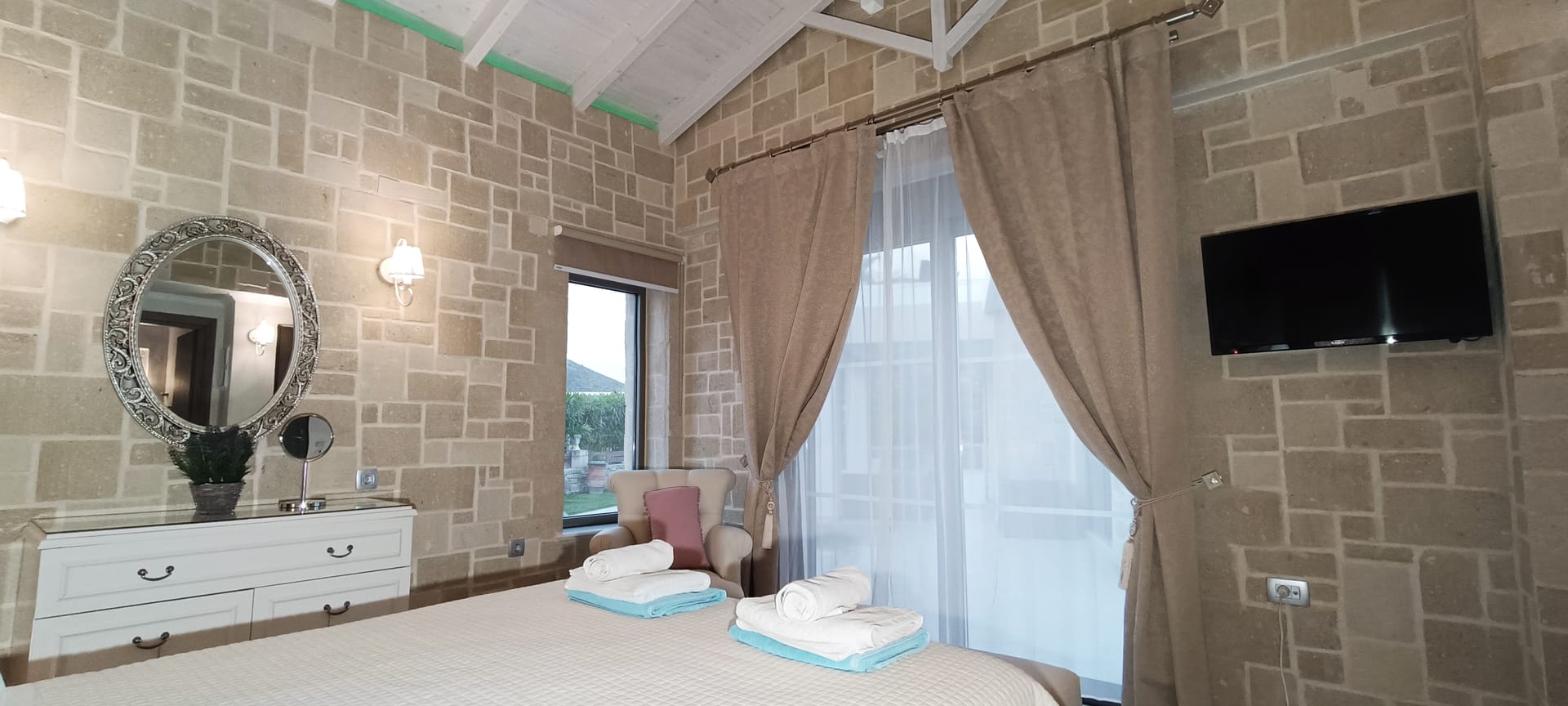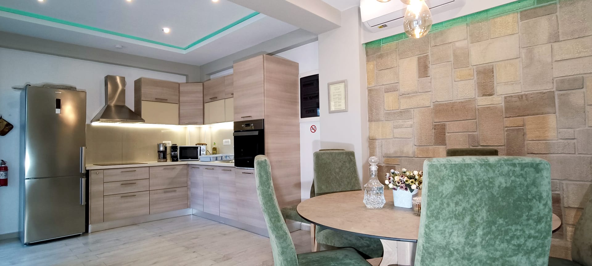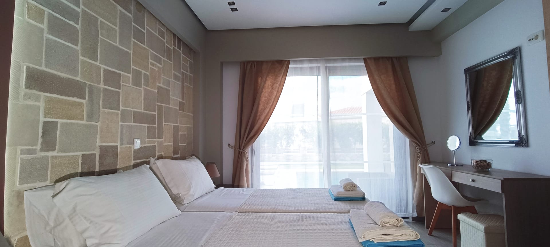 It can accommodate 5 guests in the two luxurious suite bedrooms and a bed sofa. On the lower level there is a modern furnished living room with a dining table with the lounge next to the fireplace with pool and garden view. A large 43’’ satellite led TV with DVD player and cd/radio player, a fully functional kitchen with fridge/freezer, oven, microwave, dishwasher, toaster, electric kettle, coffee machines and the all the necessary kitchen utensils . Also in the low level there is a bedroom with twin beds with hypoallergenic antistress mattresses offered with a private bathroom with jacuzzi shower. On the first floor is the master suite bedroom with a king size bed with hypoallergenic antistress mattress, a private bathroom with Jacuzzi shower, a led 32’’ satellite TV, a safety deposit box and a covered balcony with pool, garden and sea view. Also provided washing machine, air-conditioning in all rooms, free wireless internet, iron equipment. This is truly a lovely villa to spend memorable holidays in one of the most exquisite areas of Crete , it is ideal destination for families and group of friends who are looking for an ultimate experience of relaxation combined with a unique hospitality. The location of the villa is also perfect for ecotourism, outdoor activities and for exploring the beauties of Crete. The closest sandy beach with sun beds is only 200m away from the villa.
