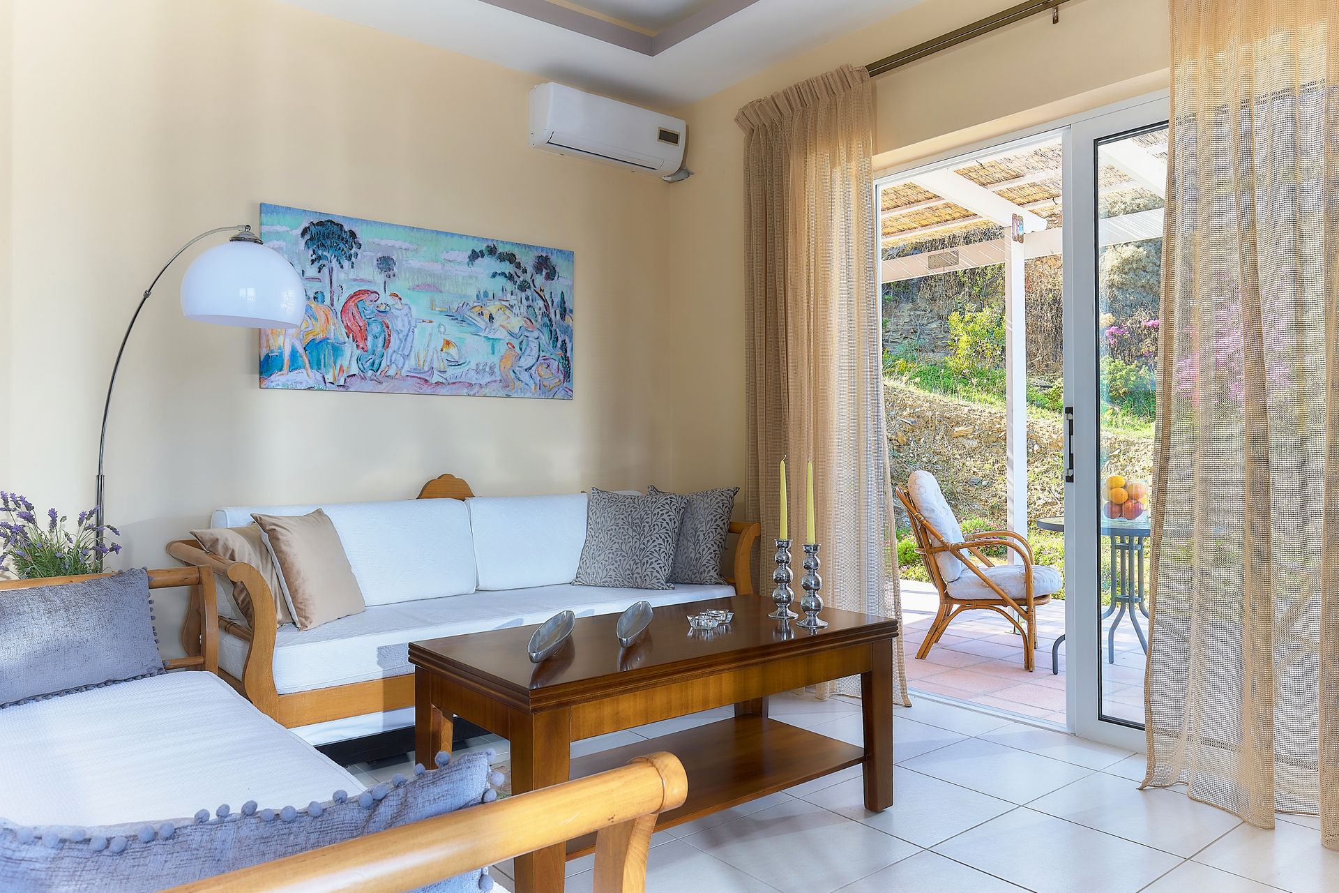 The separate bedroom has a king size bed. The living room is furnished with two sofa beds and a roll away and the kitchenette is fitted with a fully equipped kitchen with a two-burner stove top, oven, refrigerator, coffee maker, an electrik lemon-squeezer and a kettle. The private bathroom comes with a shower, hair dryer, a magnifying/shaving mirror, bath robes, slippers, towels for the swimming pool, toiletries (shampoo, conditioner, bath foam, body lotion, shower cup). There are also a Wi-Fi system, individually controlled air conditioning, satellite television, safe deposit box and many other facilities to make guests feel at home. An ironing board and iron, a clock alarm, as well as a CD Stereo System, a DVD, a baby-cot, a baby-basin if needed and toys for the children and babies are available upon request, free of charge.