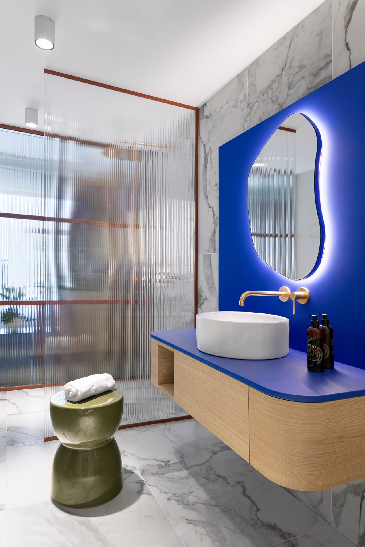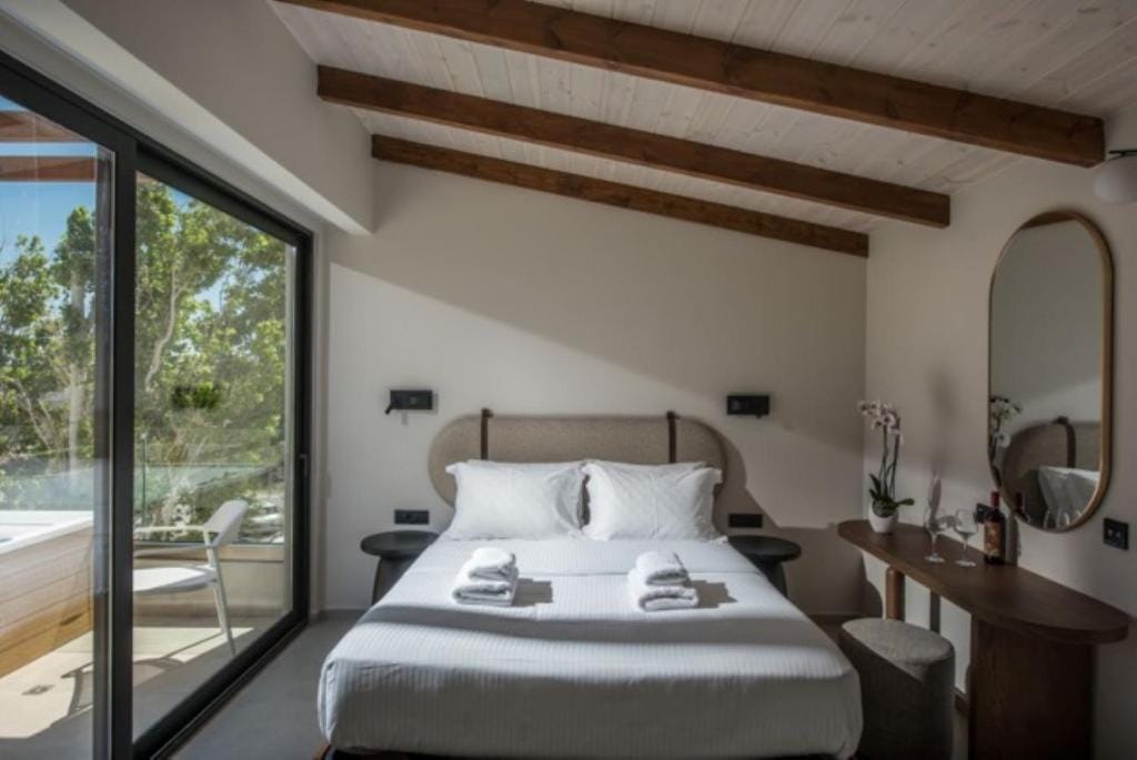 The Wild Pears celebrates the tranquil curves, peaceful colors, and whimsical patterns of nature, influenced by the modernist works of Nikolay Raynov. Coppers, greens, and blues offer a calm respite from the world, and the natural textures of whicker, palms, and live plants bring nature inside for our guests’ private garden getaway.