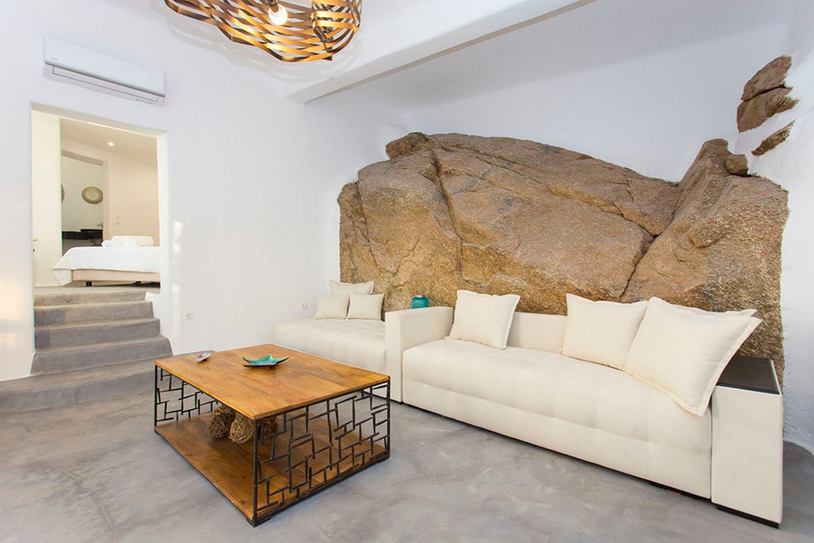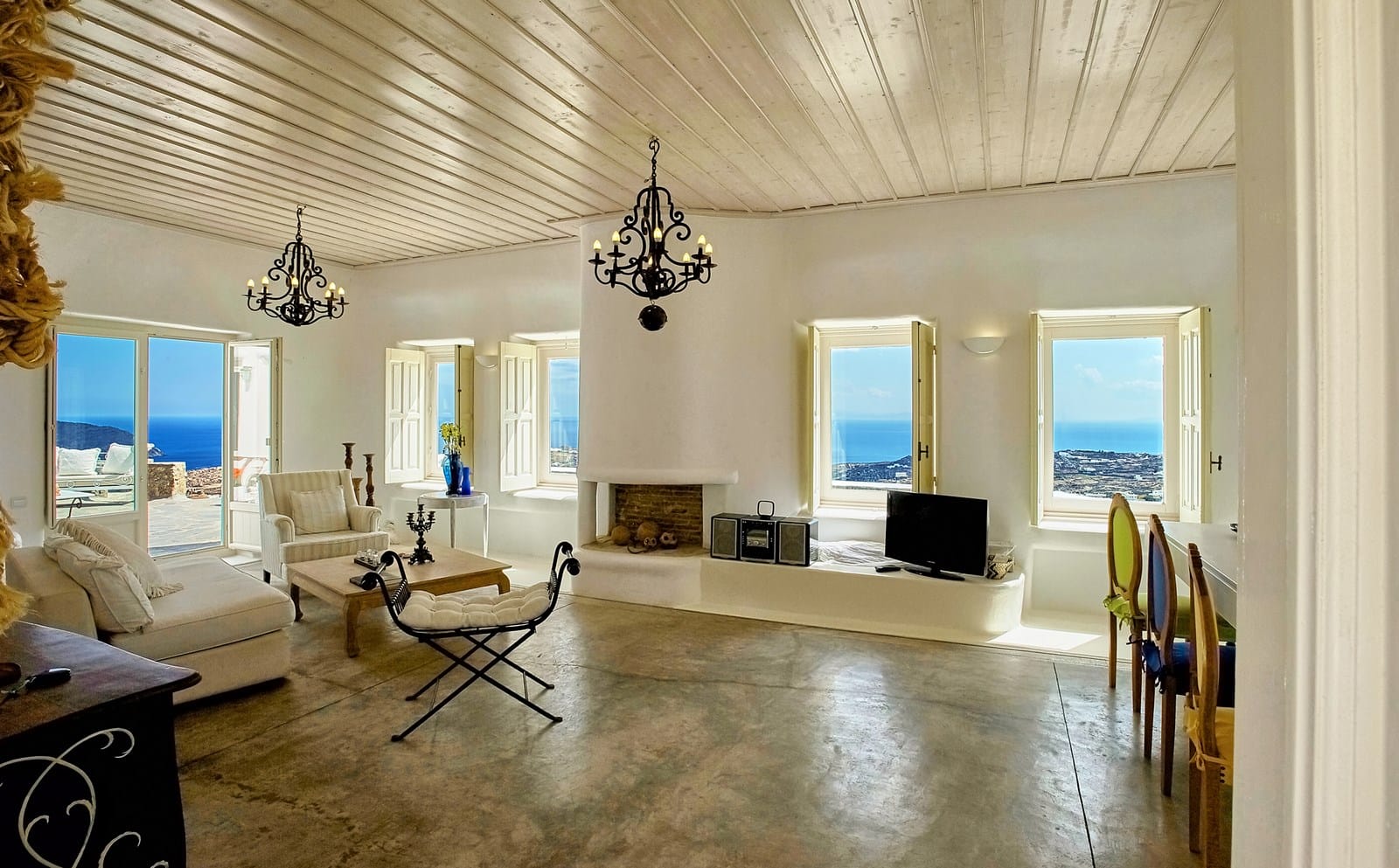 The highlight of the outdoor space is undoubtedly the infinity pool, offering a mesmerizing vista of the Aegean Sea that stretches to the horizon.