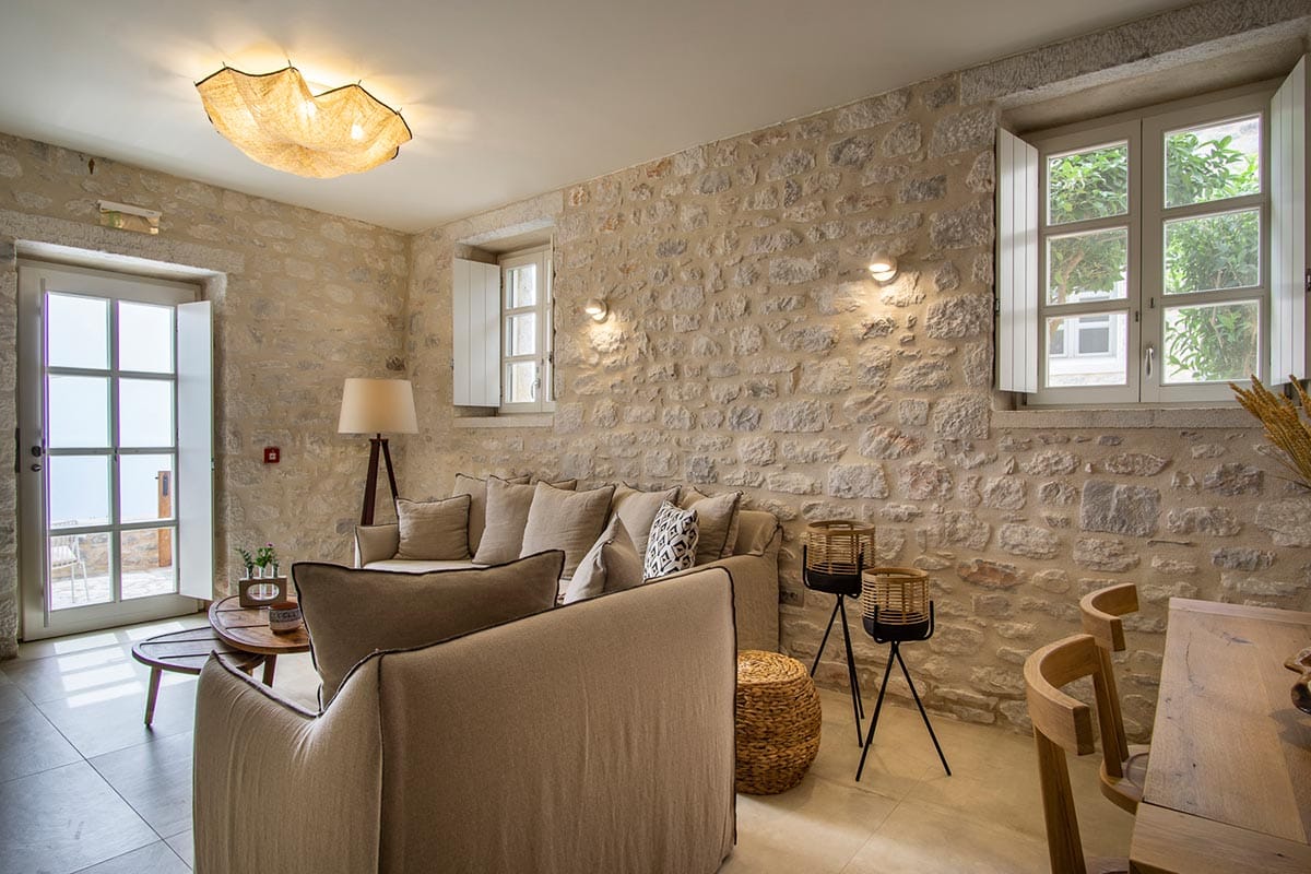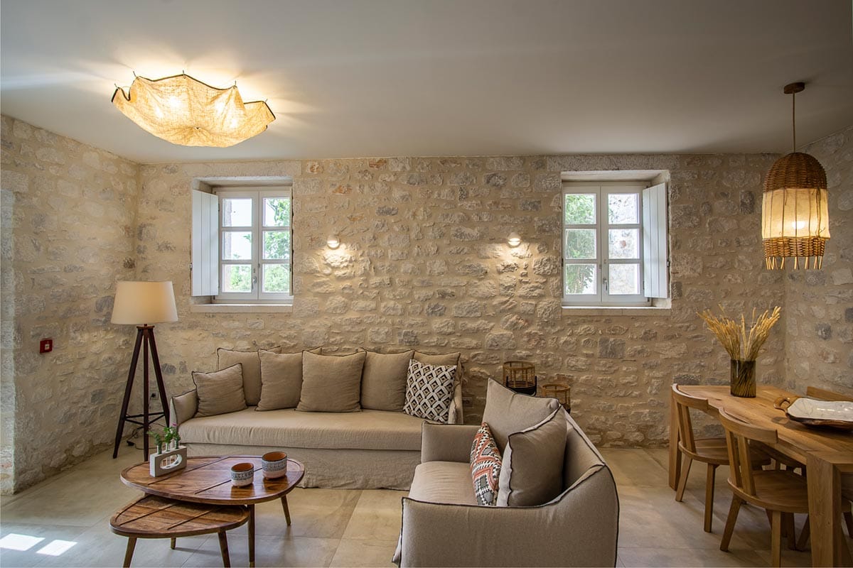 Guests can also find here and in the Garden suite consisting of one shared kitchenette, a small private garden with a Jacuzzi and it is connected to the main Villas’s pool and living areas via paved paths and two bedrooms as well: An ensuite double room (1.80 double bed) with walk in shower, private entrance, A/C, ceiling fan, sea views and an ensuite double room (either with double bed 1.80 or twins or 2 sofas serving as the living room of the other bedroom) with walk in shower, private entrance, TV, A/C, sea views.