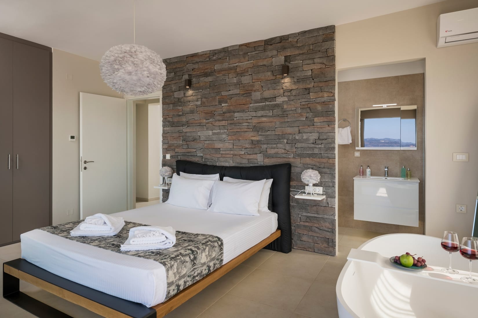 Bedroom 1: Spacious master suite (18 m2) with king-size bed (1.60×2.00), en suite shower room, and oval designer bath. Access to shared and private balconies.