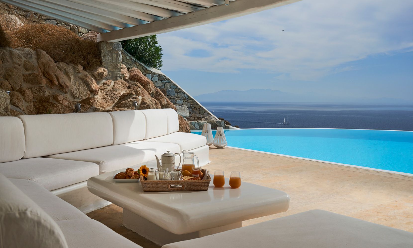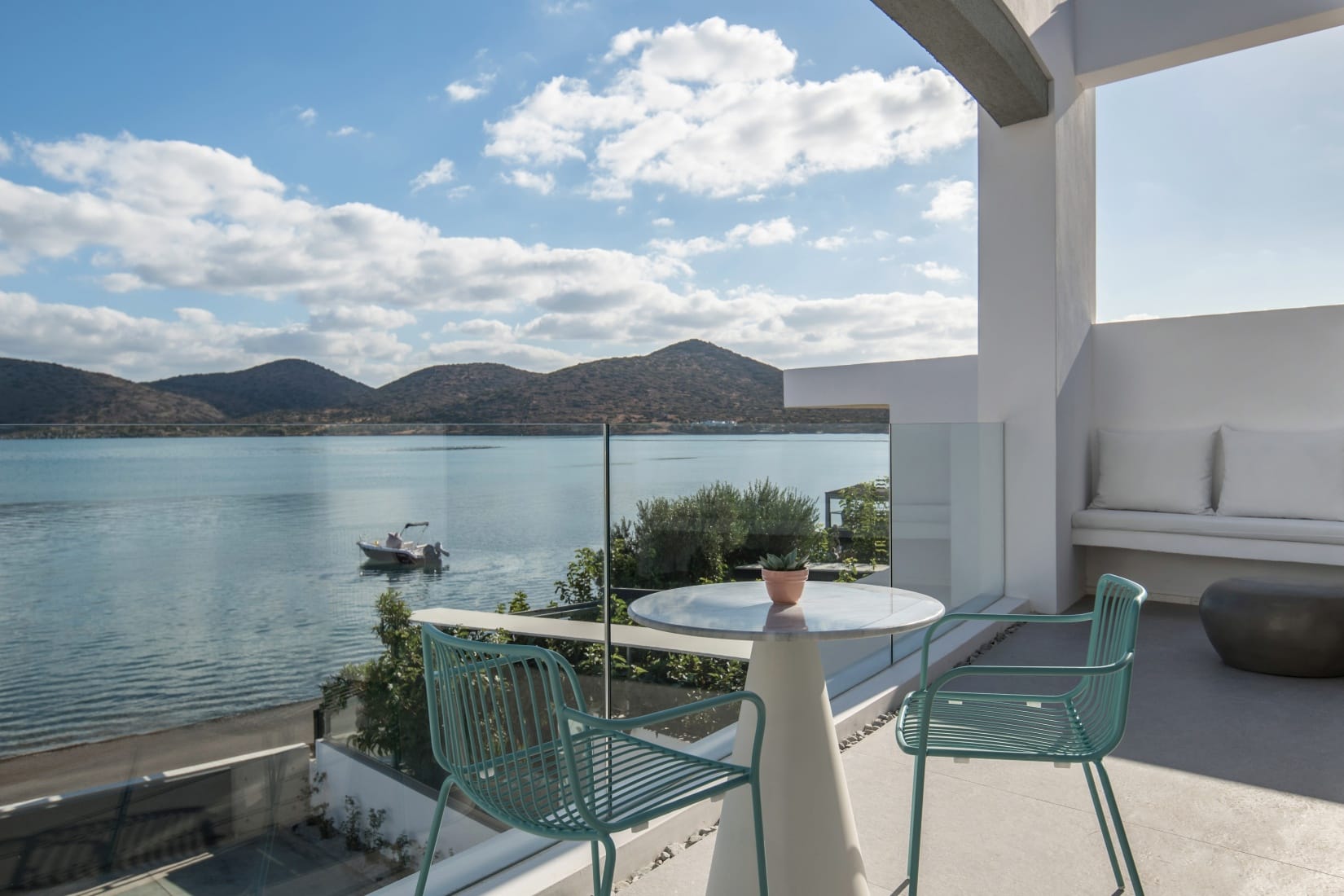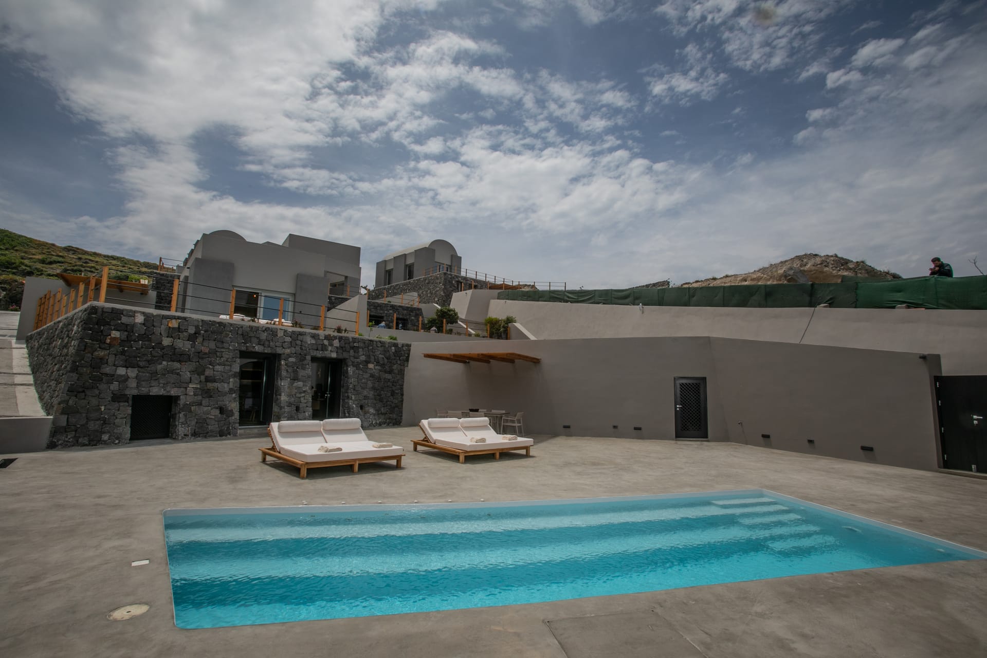 The outdoor area with the private swimming pool with jacuzzi and sunbeds is perfectly harmonized with the environment and creates a peaceful experience through the accommodation while offering breathtaking views over the Cretan Sea.
